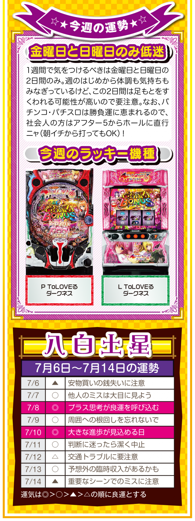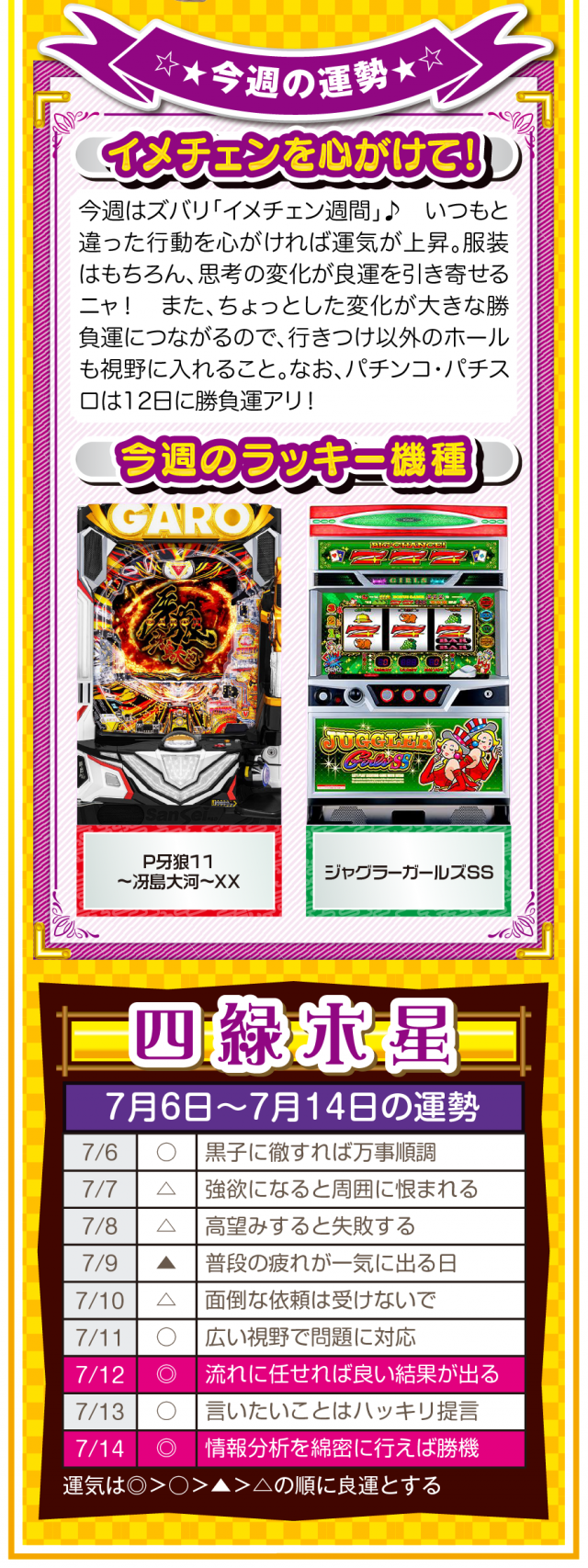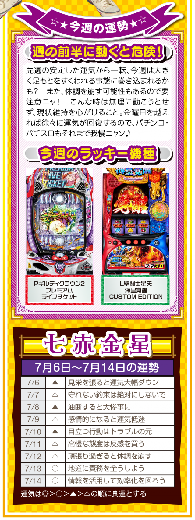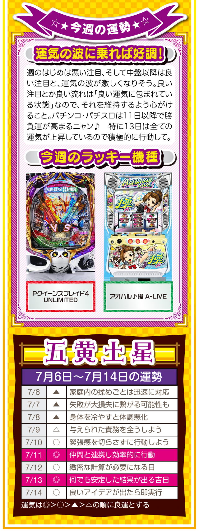 孤立と孤独から良運など生まれるわけもなく、開運に導かれることもない。そうならないためにも、自分の時間を他人のために使うこと。他人のことを考えて生きれば自然と視野が広がって、目の前のチャンスに触れる機会も多くなることを覚えておいてほしいニャン♪ というわけで早速、7月8日から7月14日の1週間を鑑定ニャ(誰に対しても我が儘全開のフォー・チュンチュンが、オマケとして6日と7日の運勢も鑑定したニャン♡)!