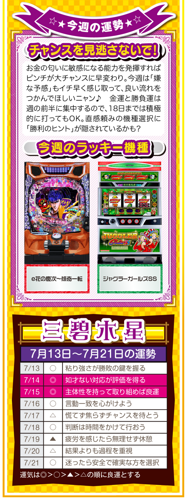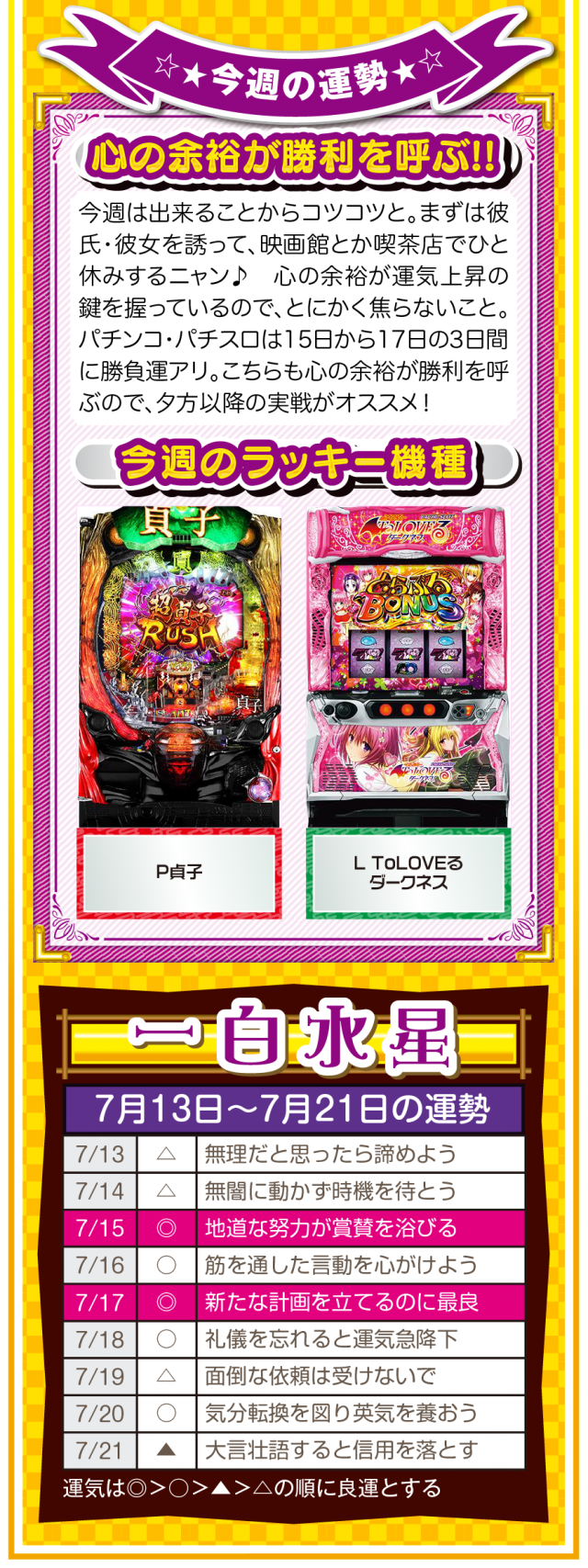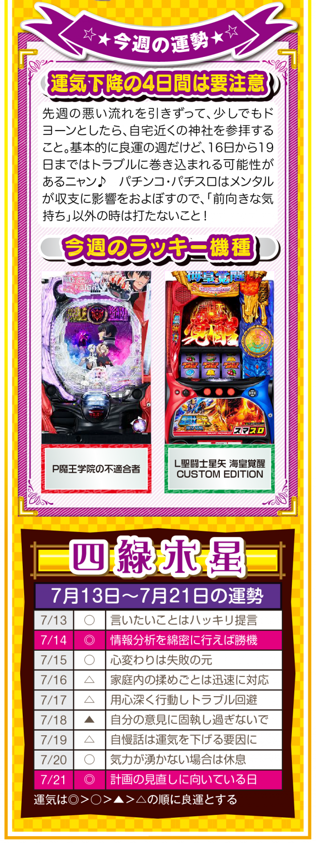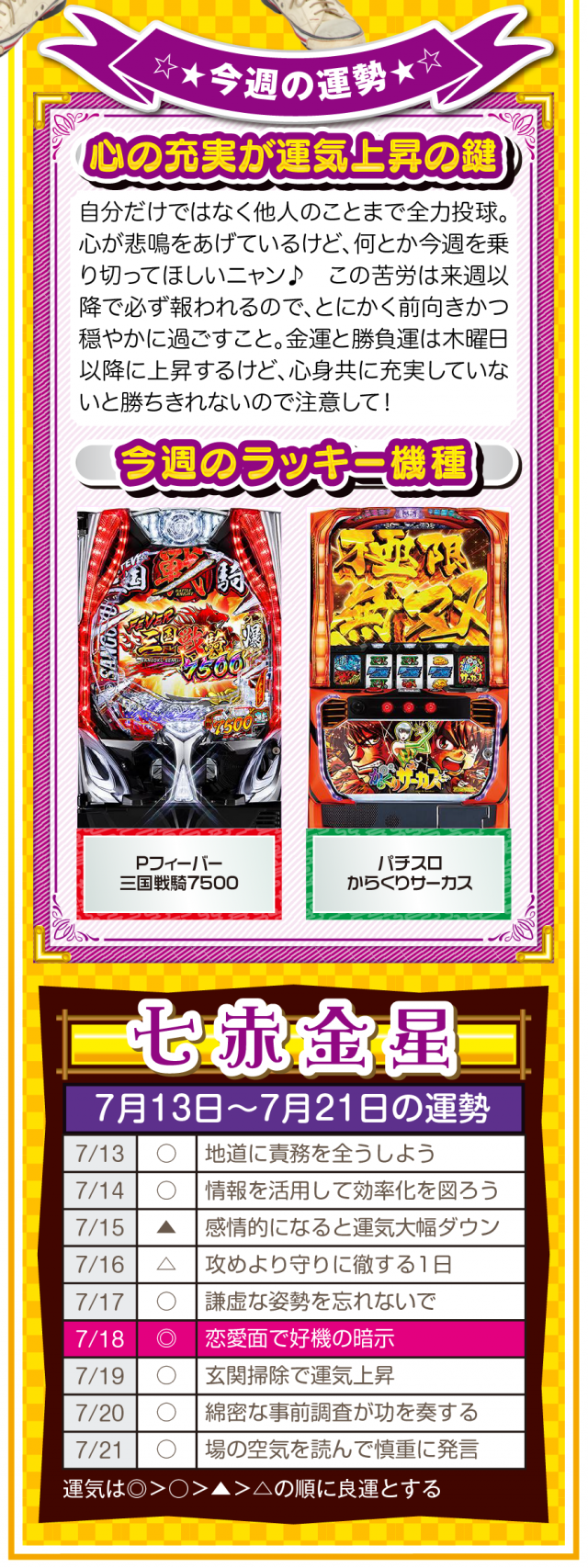 だからドンドン「終わり」を受け入れて「始まり」を楽しむこと。「終わり」への執着からは何も生まれないことを覚えておいてほしいニャン♪ というわけで早速、7月15日から21日の1週間を鑑定ニャ(それでも失恋だけは超引きずるフォー・チュンチュンが、オマケとして13日と14日の運勢も鑑定したニャン♡)!