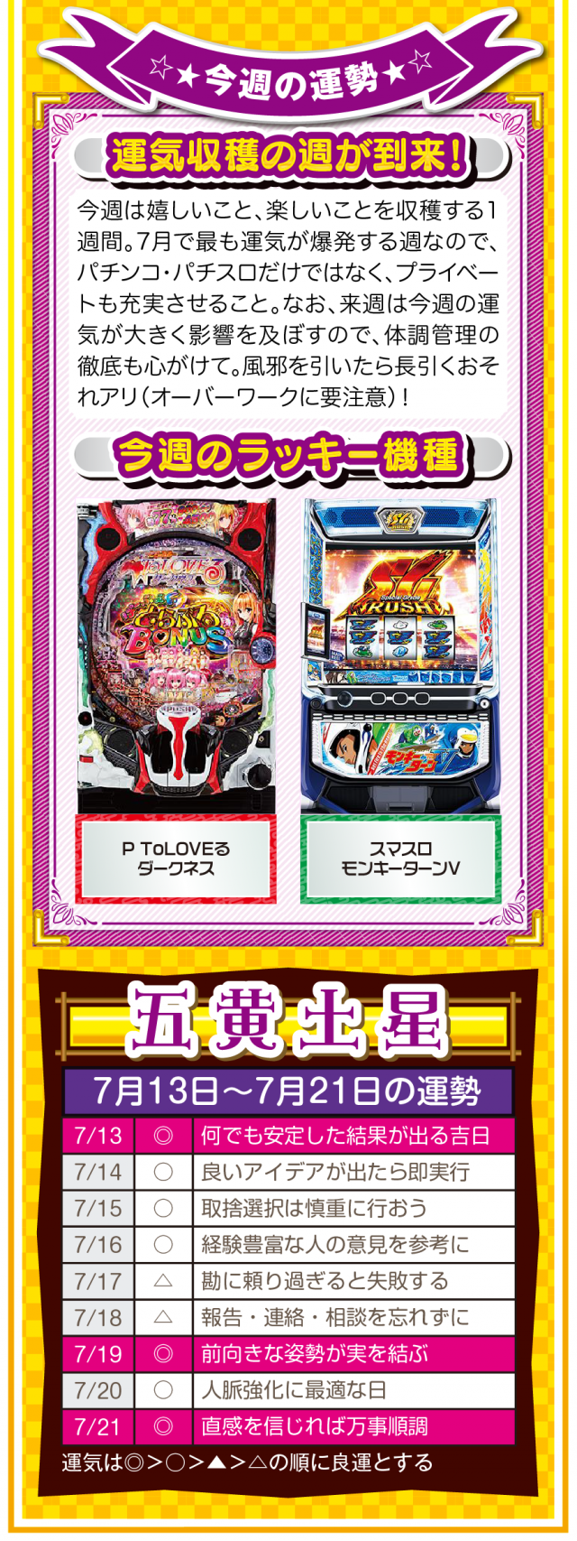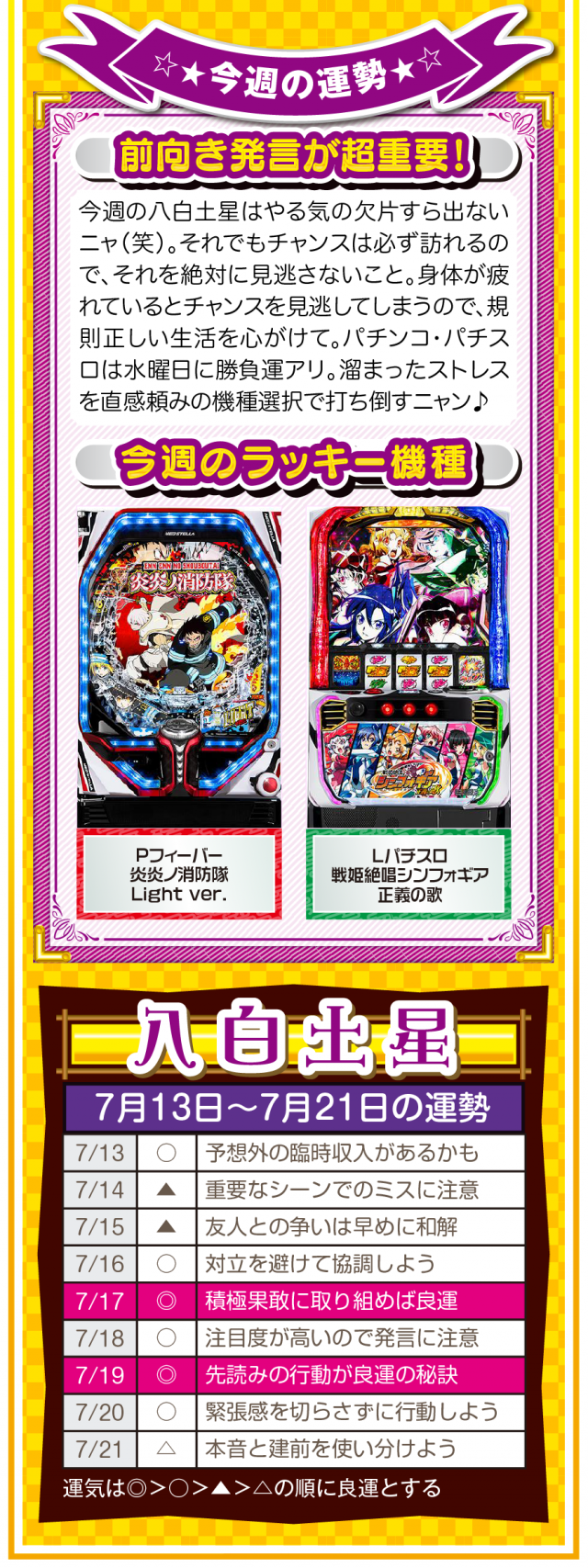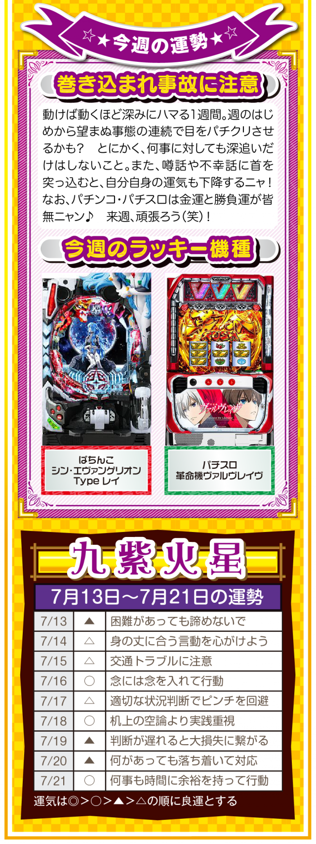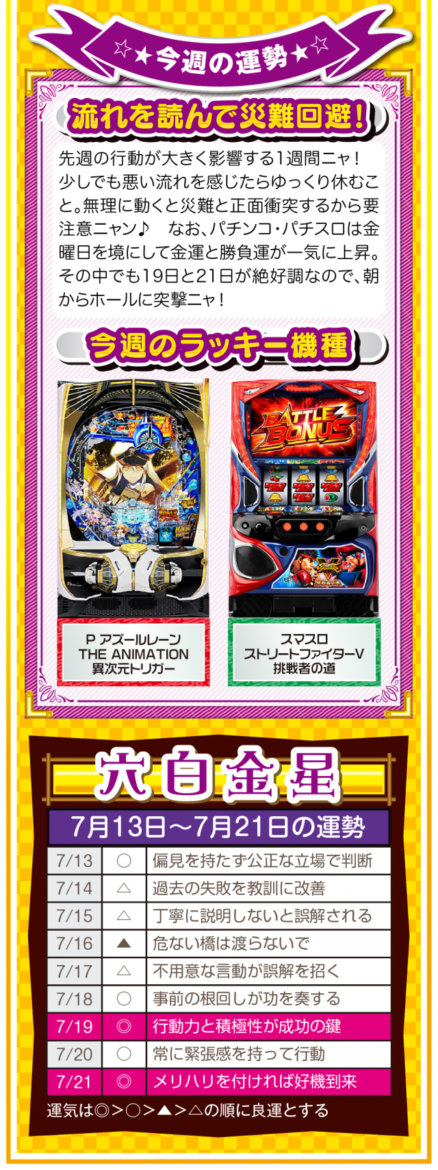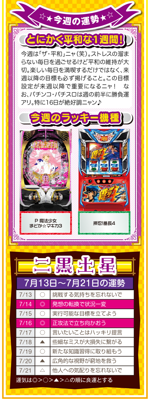 だからドンドン「終わり」を受け入れて「始まり」を楽しむこと。「終わり」への執着からは何も生まれないことを覚えておいてほしいニャン♪ というわけで早速、7月15日から21日の1週間を鑑定ニャ(それでも失恋だけは超引きずるフォー・チュンチュンが、オマケとして13日と14日の運勢も鑑定したニャン♡)!
