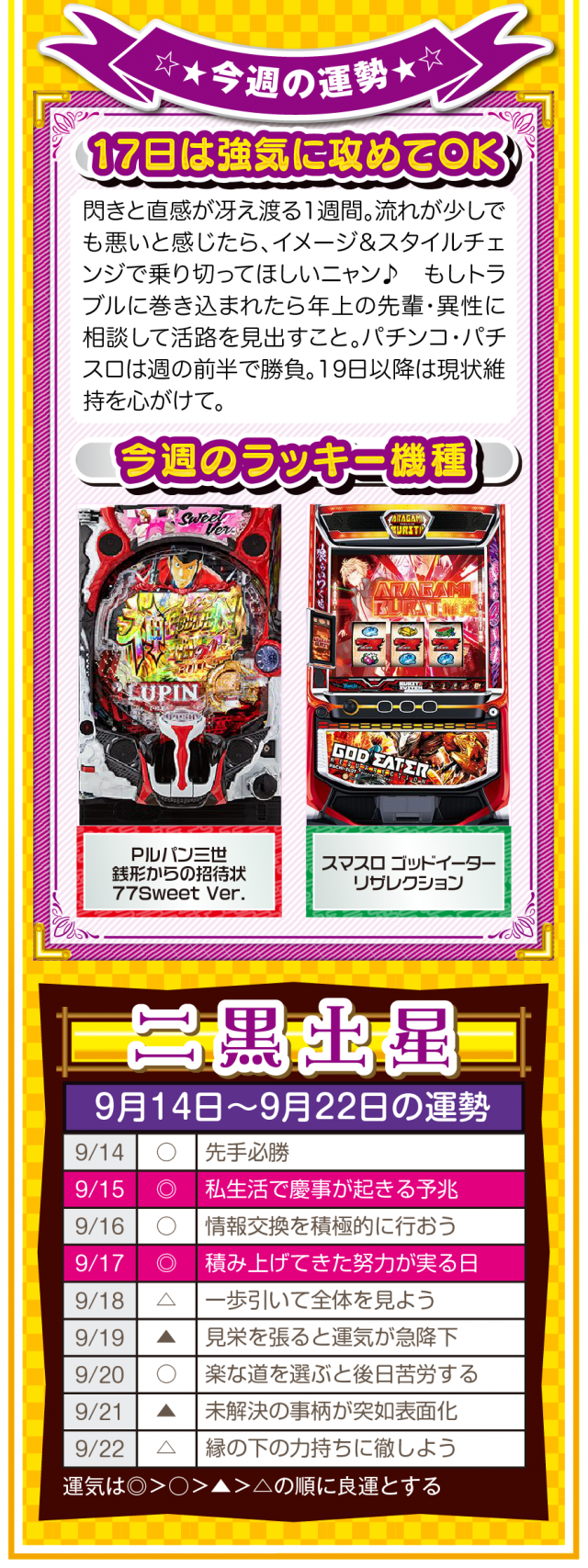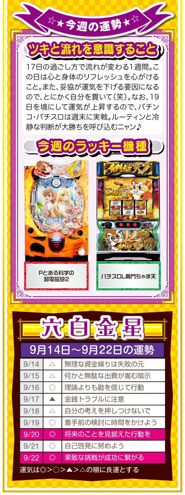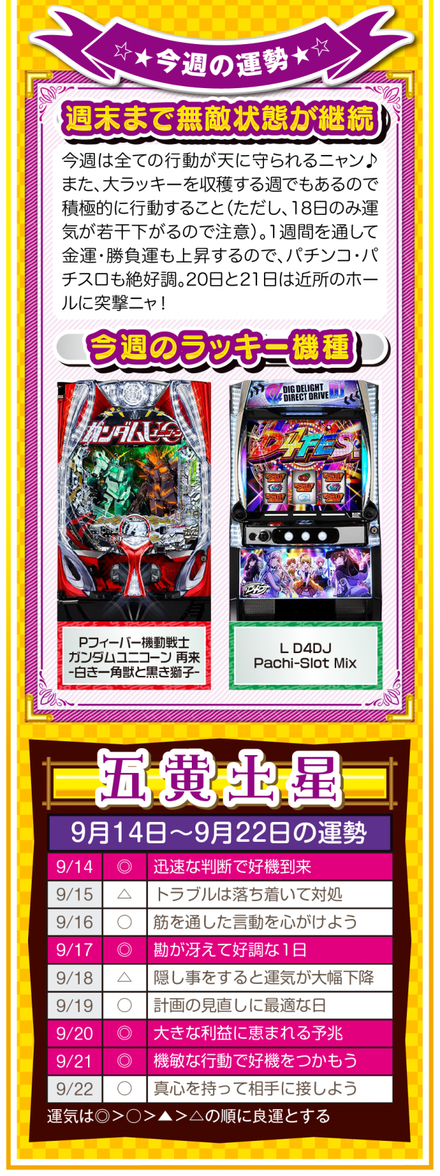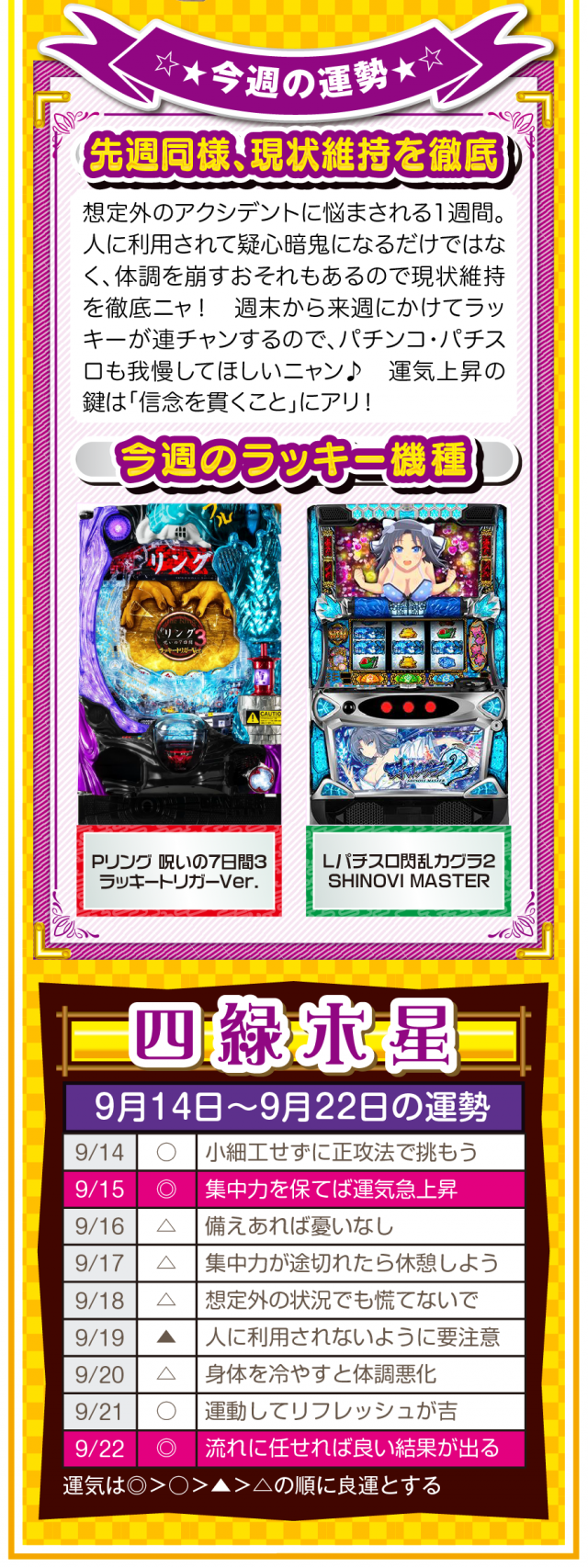 少しでも「ツイてないな」と思ったら、小さい幸せを見つけるアンテナを張って良い流れを呼び込むこと。運気を呼び込むことは難しくないし、小さい幸せを見つけることも難しくないことを覚えておいてほしいニャン♪ というわけで早速、9月16日から22日の1週間を鑑定ニャ(秋のGⅠに向けて小さな幸せを見つけまくるフォー・チュンチュンが、今週もオマケとして14日と15日の運勢も鑑定したニャン♡)!
