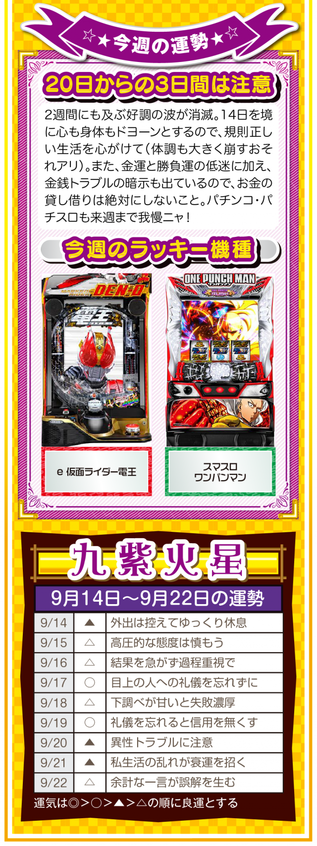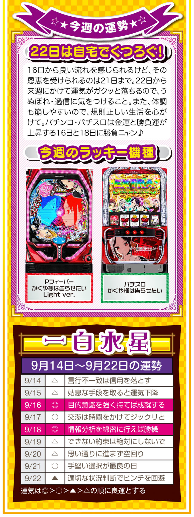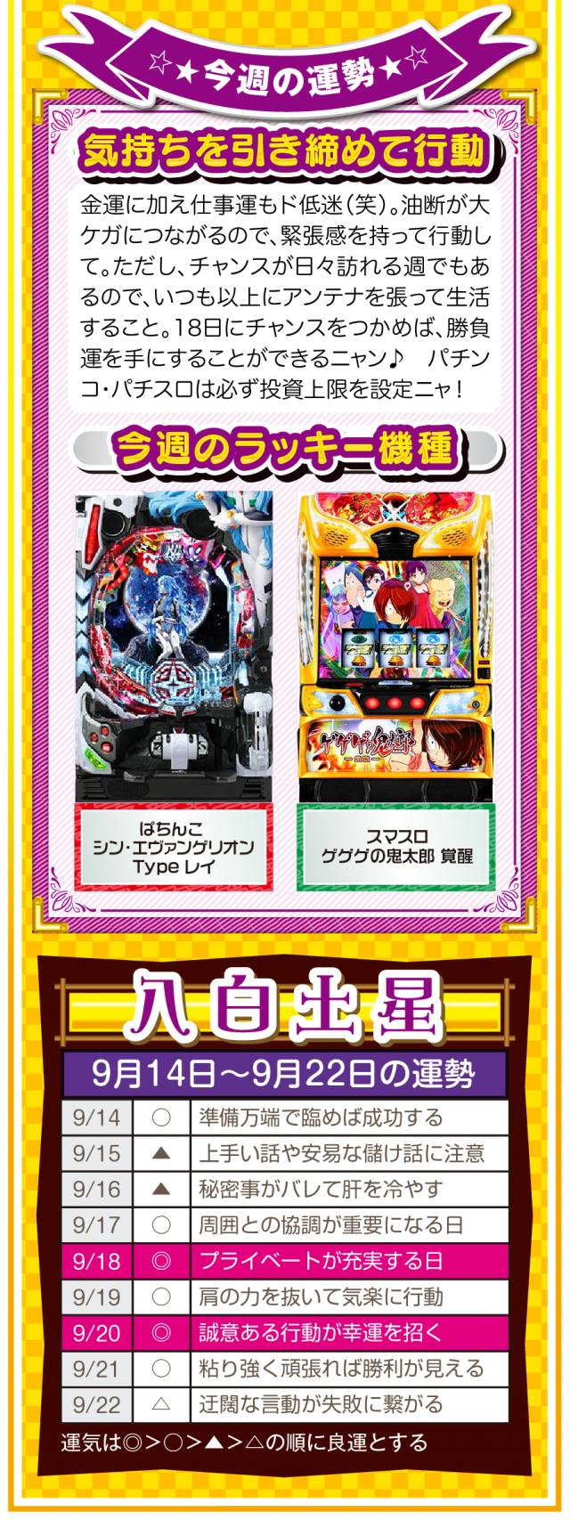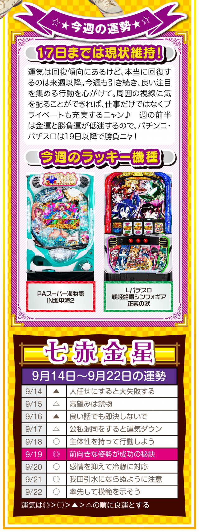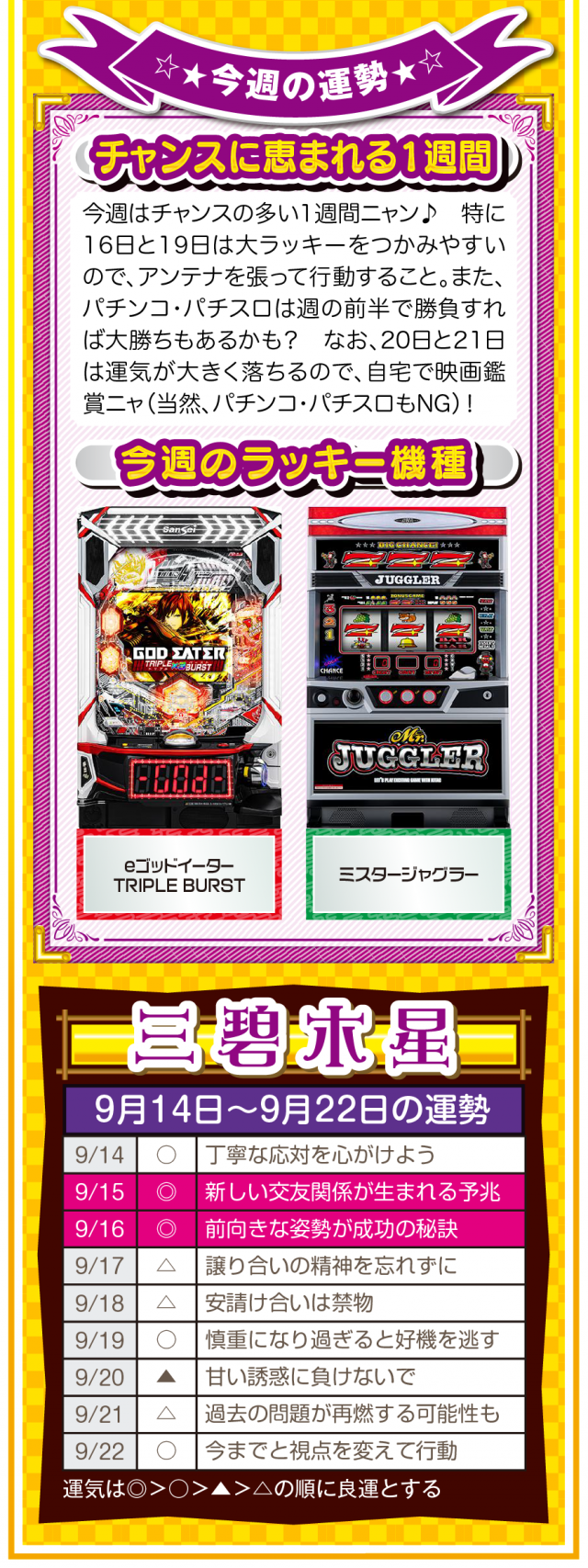 少しでも「ツイてないな」と思ったら、小さい幸せを見つけるアンテナを張って良い流れを呼び込むこと。運気を呼び込むことは難しくないし、小さい幸せを見つけることも難しくないことを覚えておいてほしいニャン♪ というわけで早速、9月16日から22日の1週間を鑑定ニャ(秋のGⅠに向けて小さな幸せを見つけまくるフォー・チュンチュンが、今週もオマケとして14日と15日の運勢も鑑定したニャン♡)!