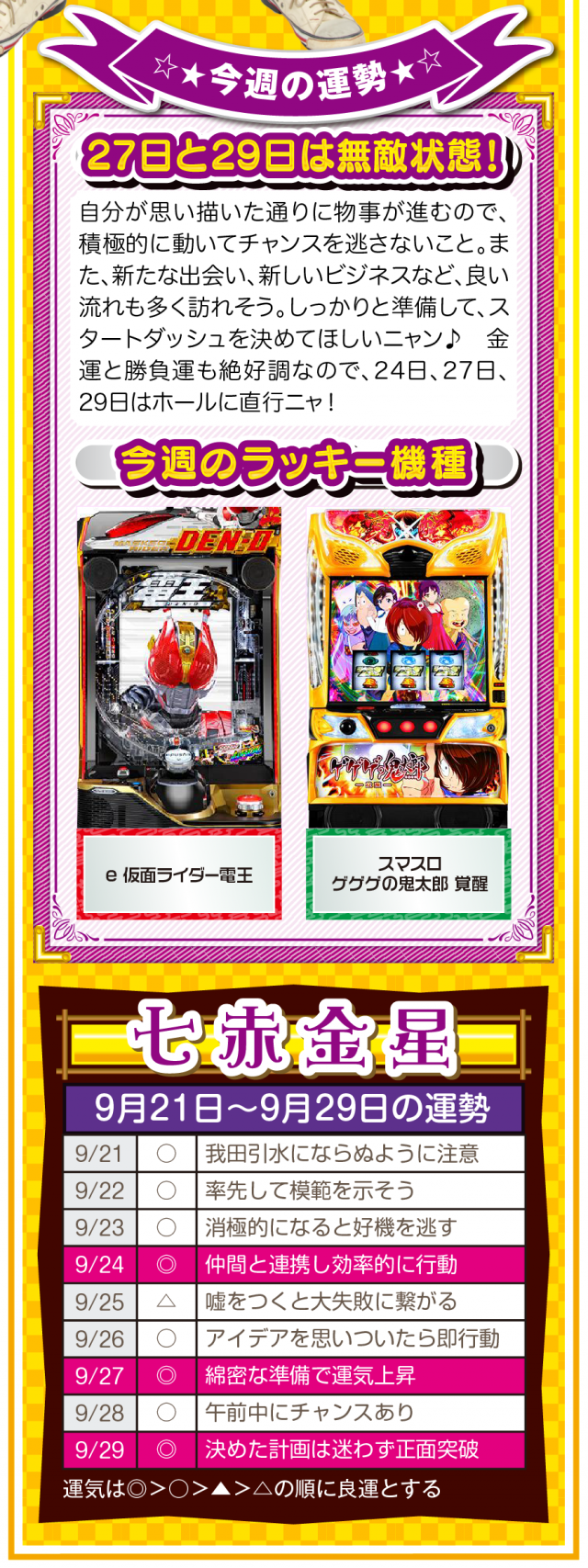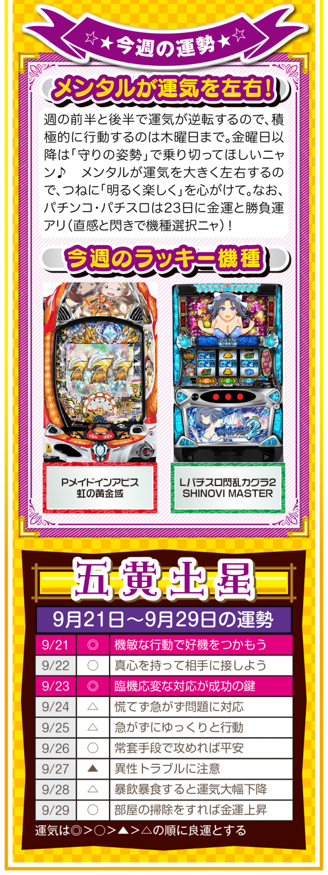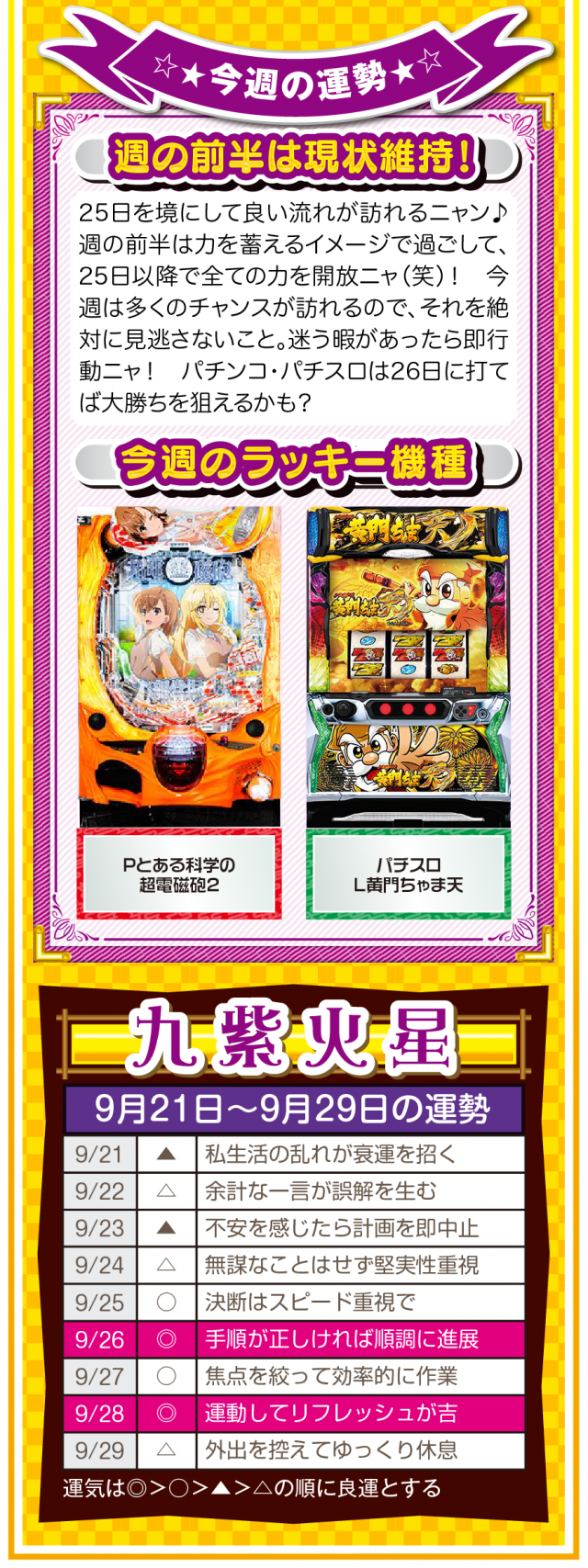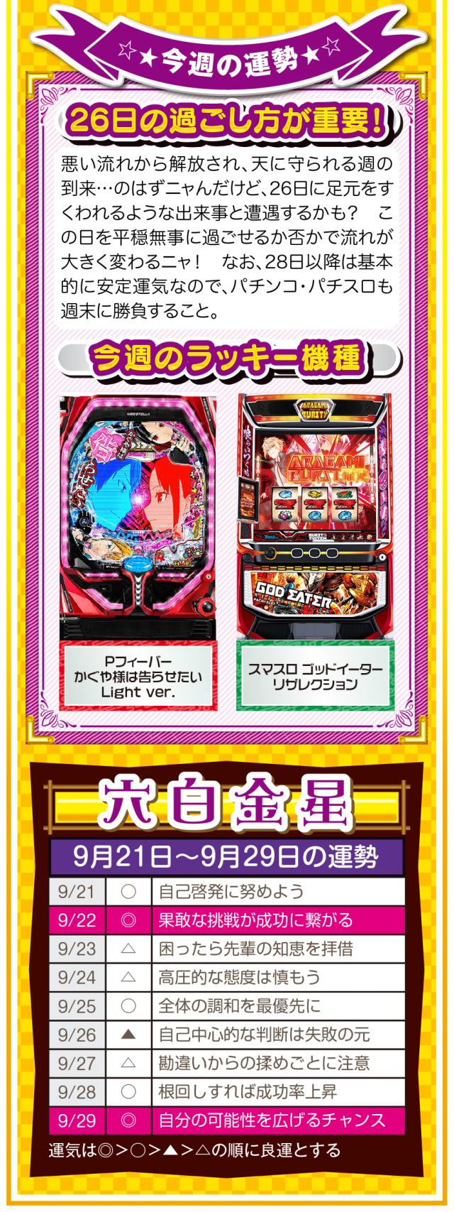 だから、どんな場面においても「前向きな言葉」を忘れちゃダメ。パチンコ・パチスロで負けても「この程度で済んだのなら運が良い」と言ってみて(笑)。運の捉え方は人それぞれだけど、ツキと流れは確実に存在することを覚えておいてほしいニャン♪ というわけで早速、9月23日から9月29日の1週間を鑑定ニャ(秋のGⅠに向けて前向き発言を繰り返すフォー・チュンチュンが、今週もオマケとして21日と22日の運勢も鑑定したニャン♡)!