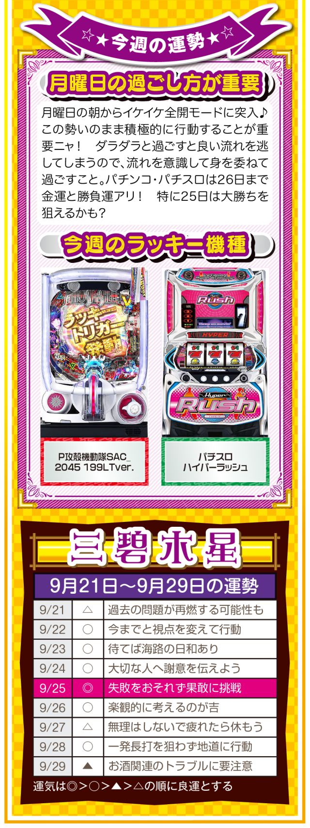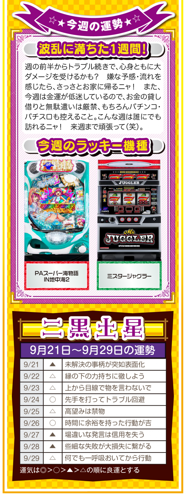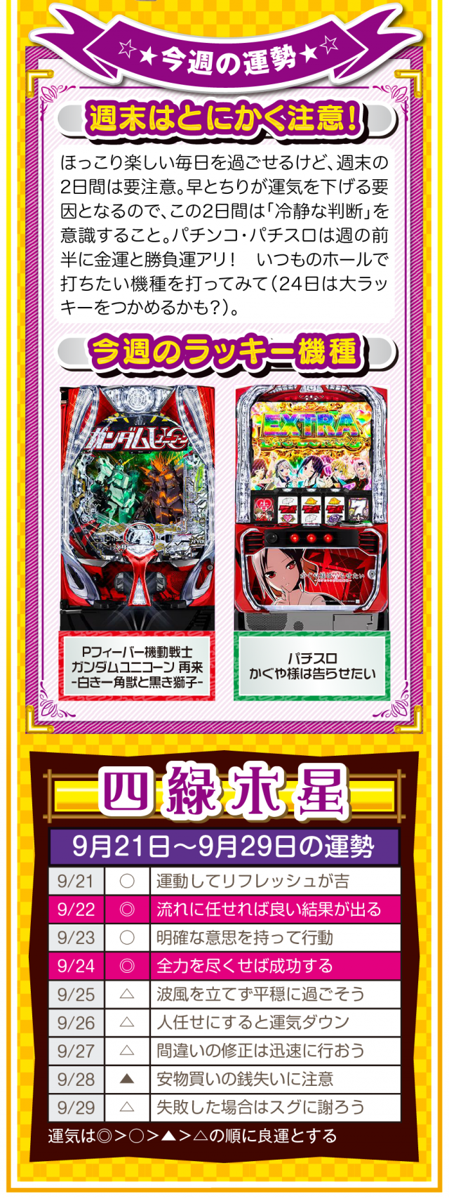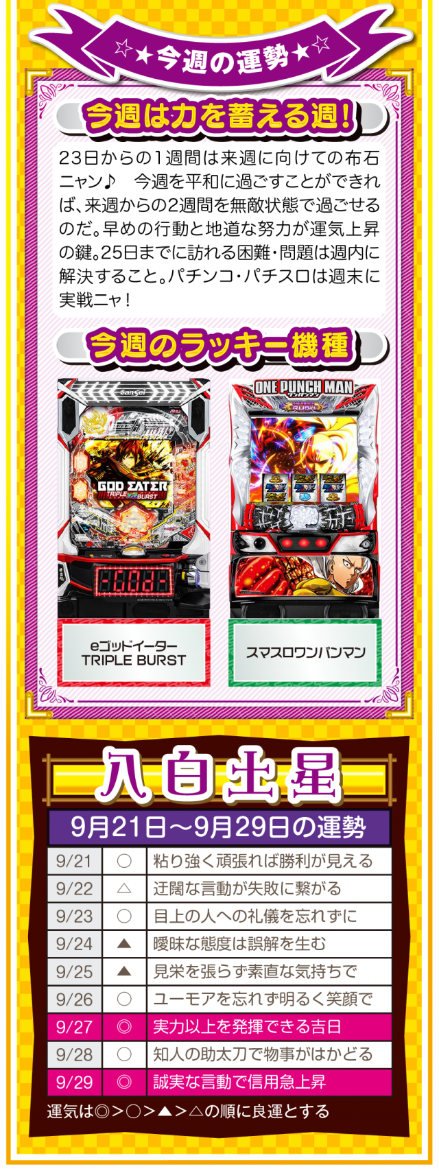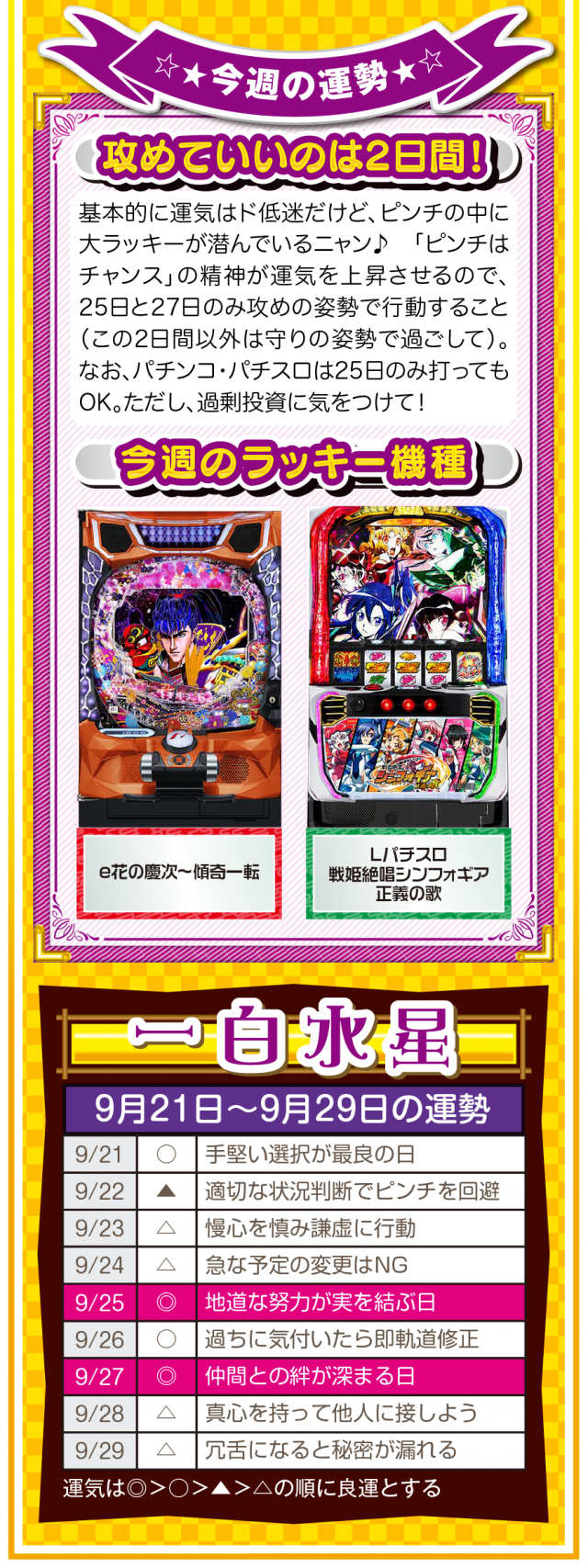 だから、どんな場面においても「前向きな言葉」を忘れちゃダメ。パチンコ・パチスロで負けても「この程度で済んだのなら運が良い」と言ってみて(笑)。運の捉え方は人それぞれだけど、ツキと流れは確実に存在することを覚えておいてほしいニャン♪ というわけで早速、9月23日から9月29日の1週間を鑑定ニャ(秋のGⅠに向けて前向き発言を繰り返すフォー・チュンチュンが、今週もオマケとして21日と22日の運勢も鑑定したニャン♡)!