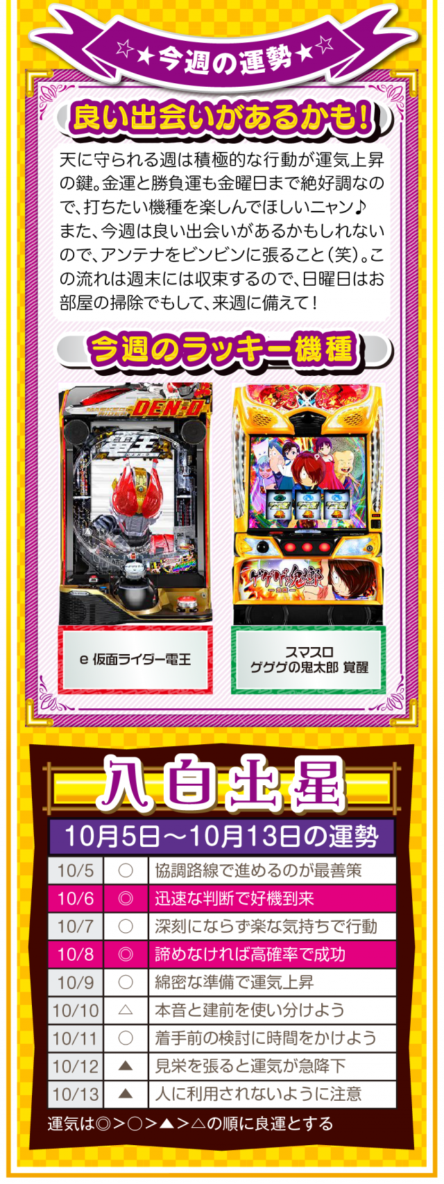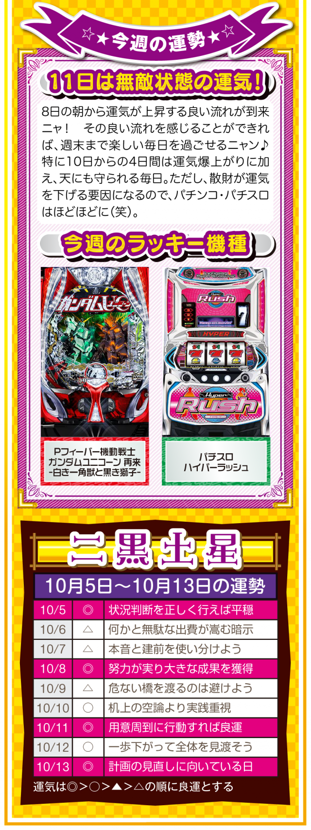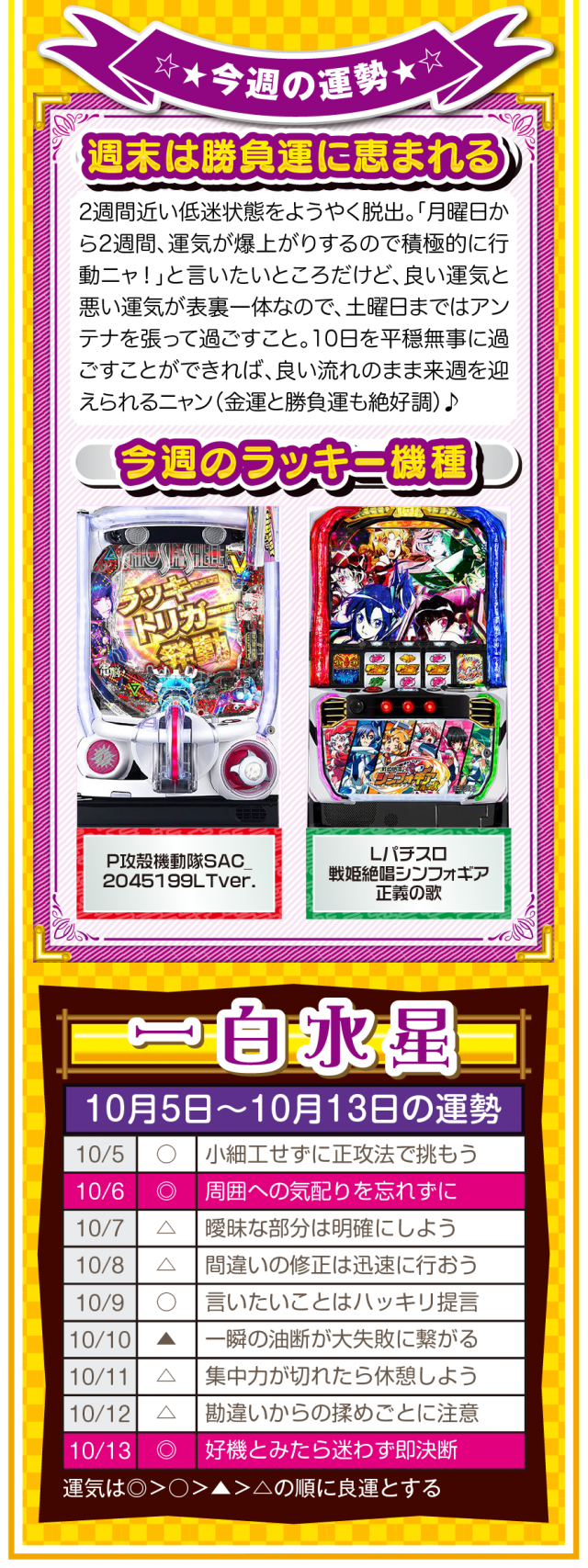 「運が良い!」、「今日はめっちゃツイてる!」は魔法の合言葉。意識的な発言は無意識を凌駕することを覚えておいてほしいニャン♪ というわけで早速、10月7日から13日の1週間を鑑定ニャ(恋愛に関するポジティブワードに否定的なフォー・チュンチュンが、今週もオマケとして5日と6日の運勢も鑑定したニャン♡)!
