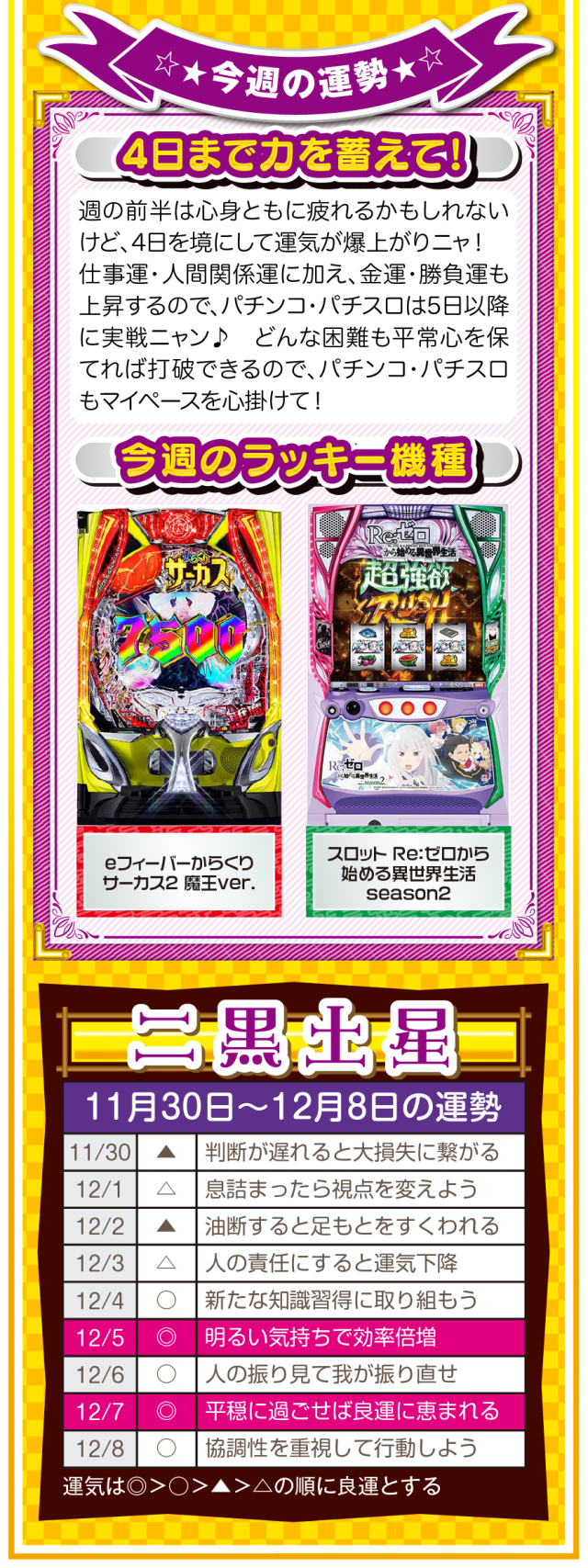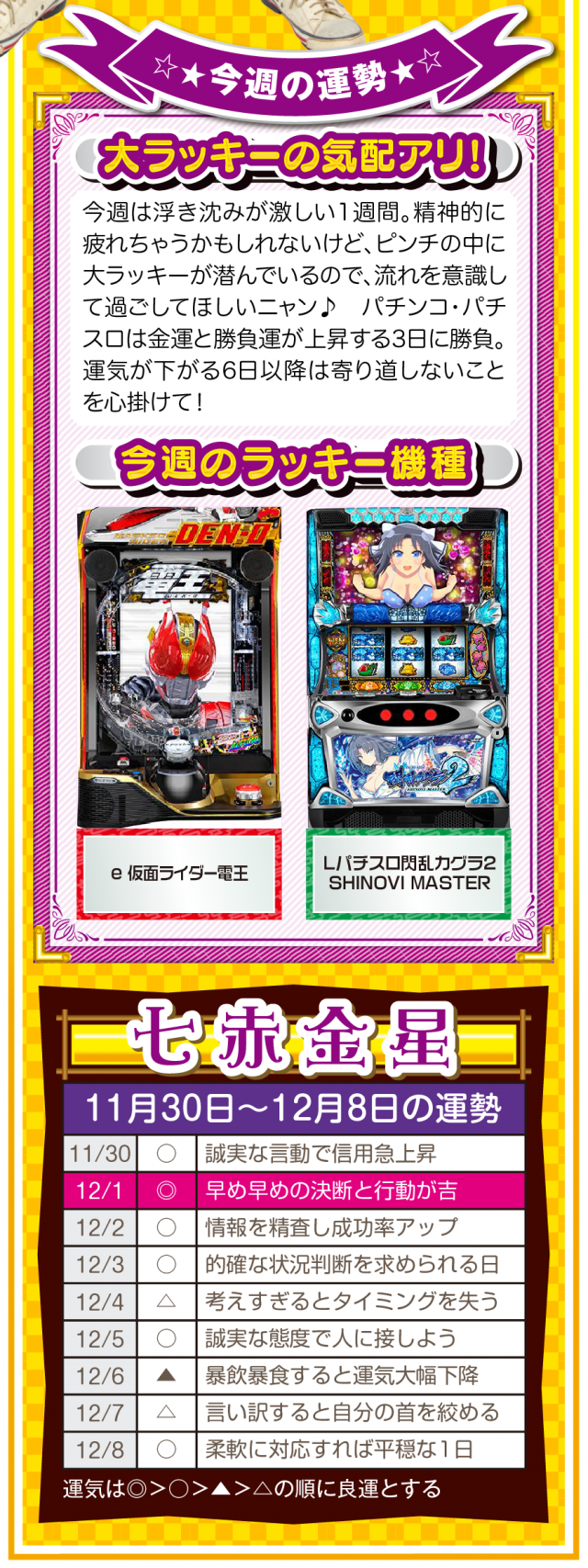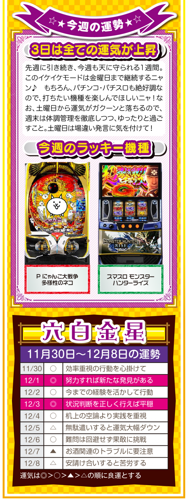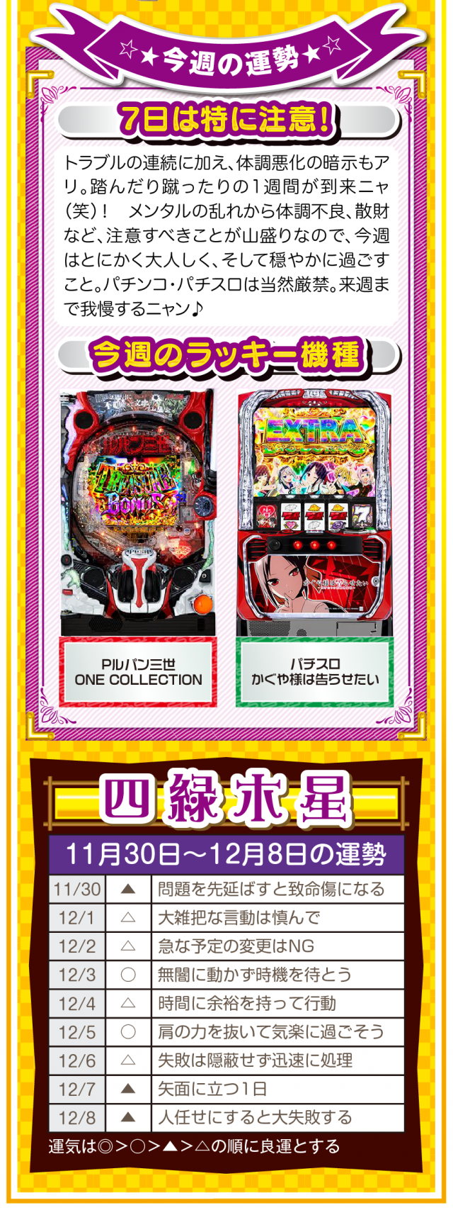 金運も幸せもすぐに手に入るわけではなく、「日々の積み重ねとポジティブに生きた結果」として手に入れることが出来ることを覚えておいてほしいニャン♪ というわけで早速、12月2日から8日の1週間を鑑定ニャ(無駄な買い物好きのフォー・チュンチュンが、オマケとして11月30日と12月1日の運勢も鑑定したニャン♡)!