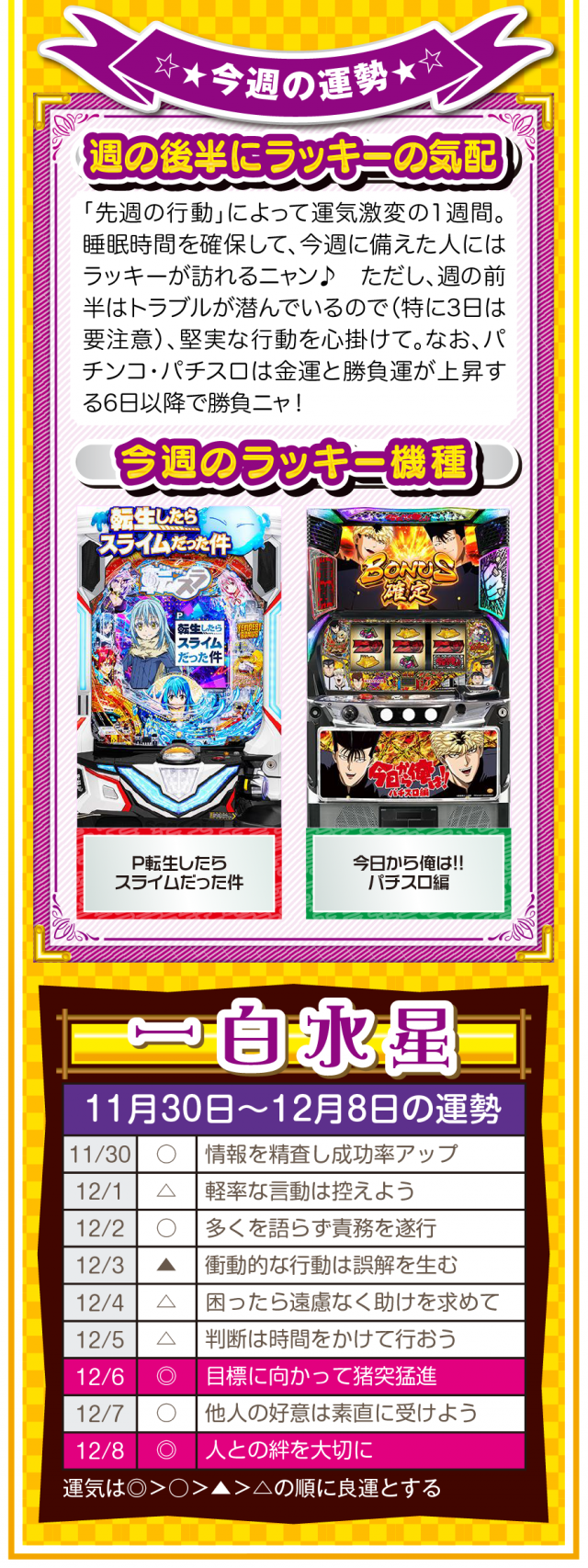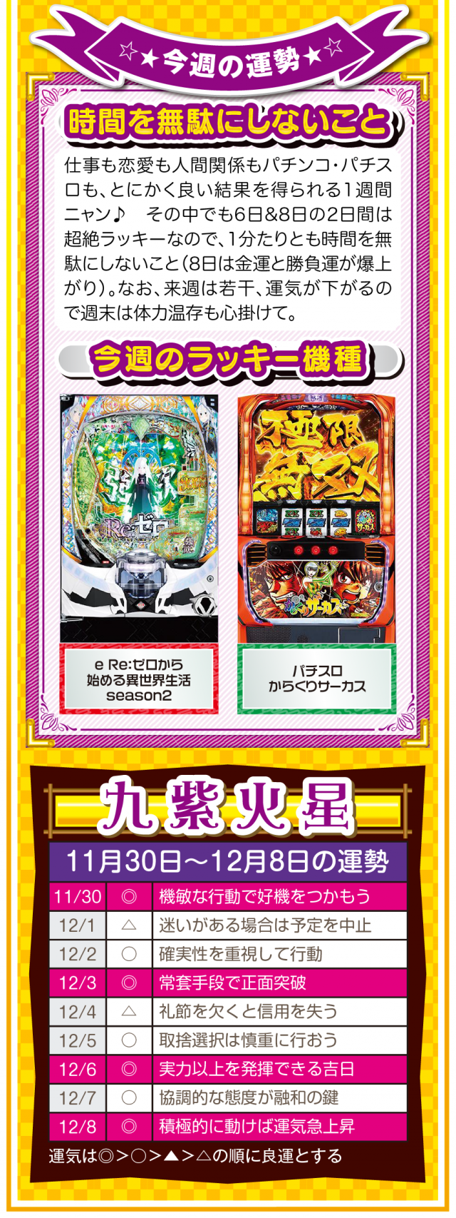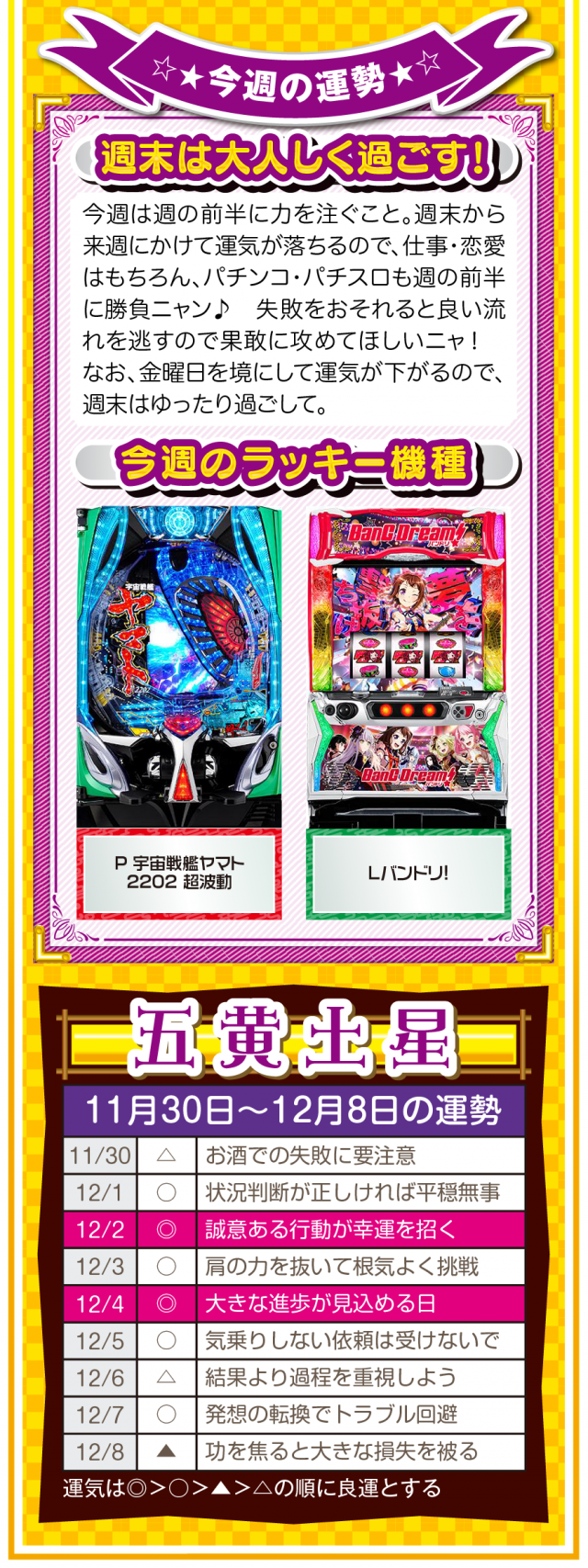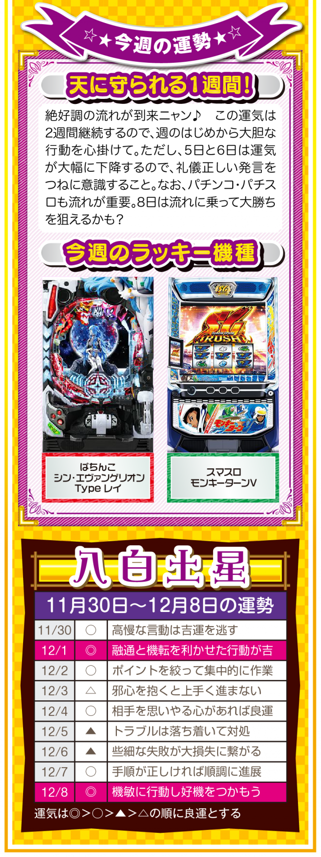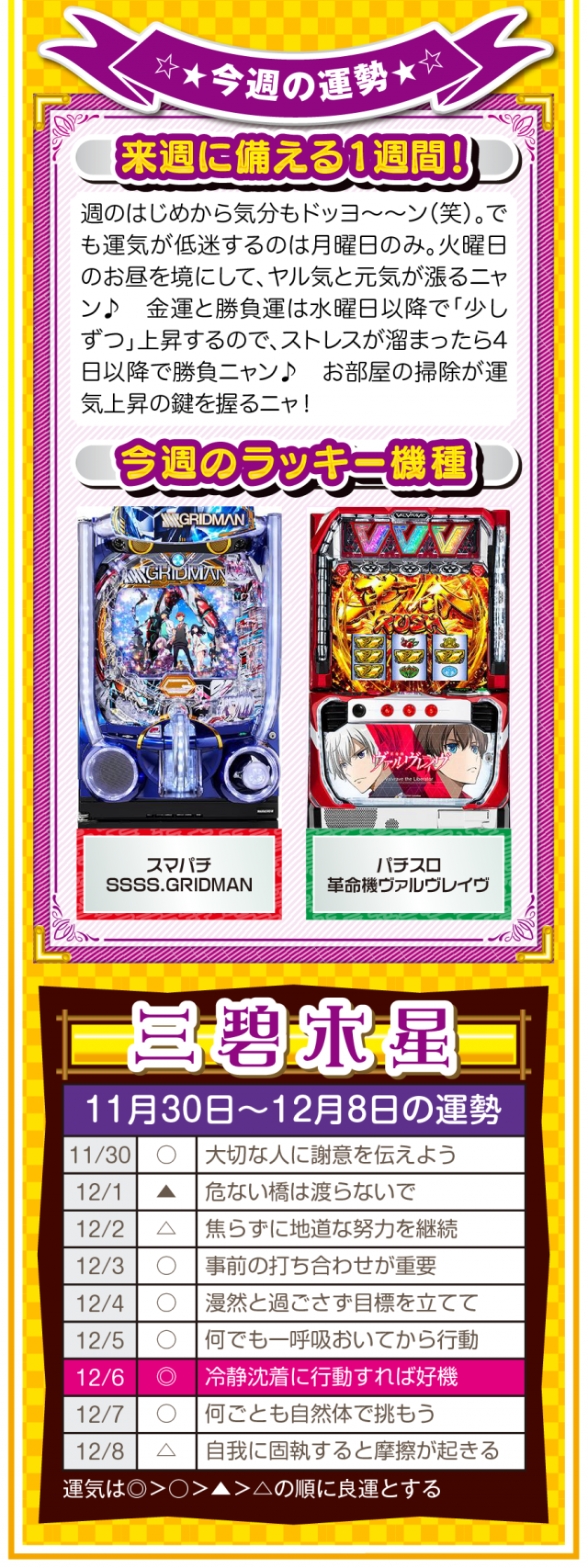 金運も幸せもすぐに手に入るわけではなく、「日々の積み重ねとポジティブに生きた結果」として手に入れることが出来ることを覚えておいてほしいニャン♪ というわけで早速、12月2日から8日の1週間を鑑定ニャ(無駄な買い物好きのフォー・チュンチュンが、オマケとして11月30日と12月1日の運勢も鑑定したニャン♡)!