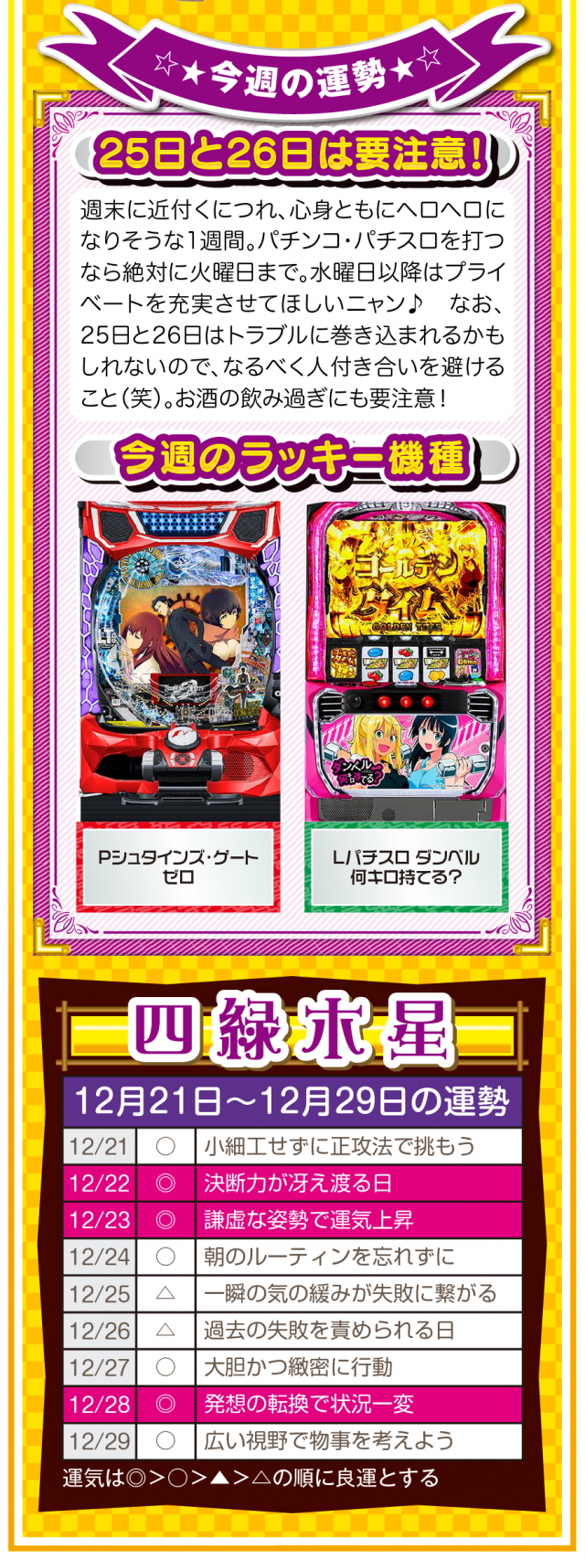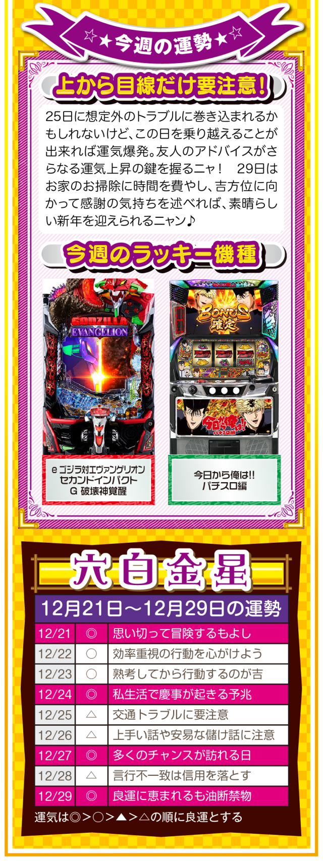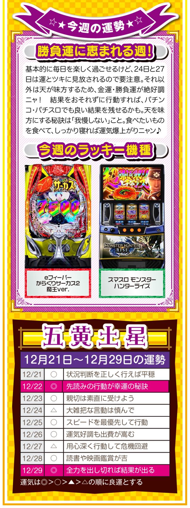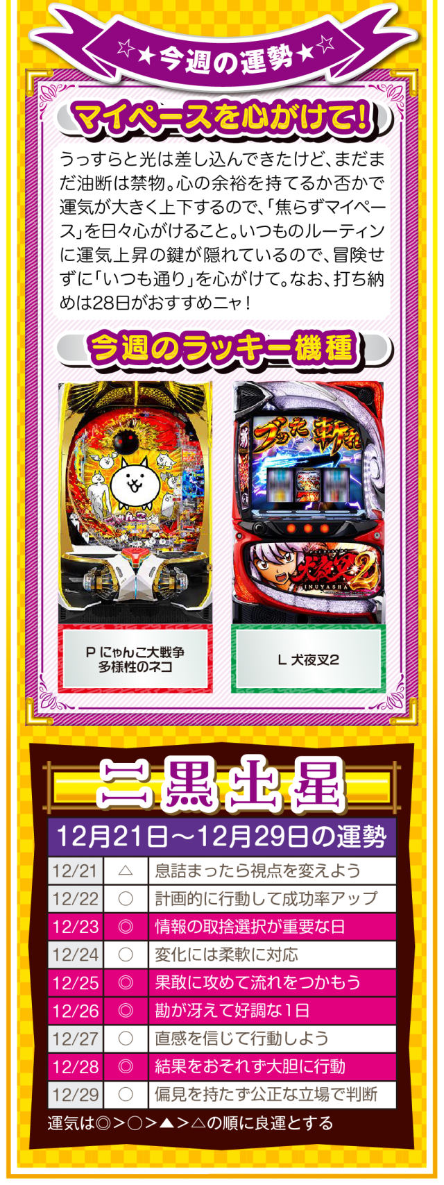 負けた時こそ、買いたい洋服を買って豪勢な夕飯を食べて友達と遊びに行く。惜しみなく出し切る人に幸運が訪れることを覚えておいてほしいニャン♪ というわけで早速、12月23日から29日の1週間を鑑定ニャ(有馬記念で全て出し切る予定のフォー・チュンチュンが、オマケとして12月21日と22日の運勢も鑑定したニャン♡)!