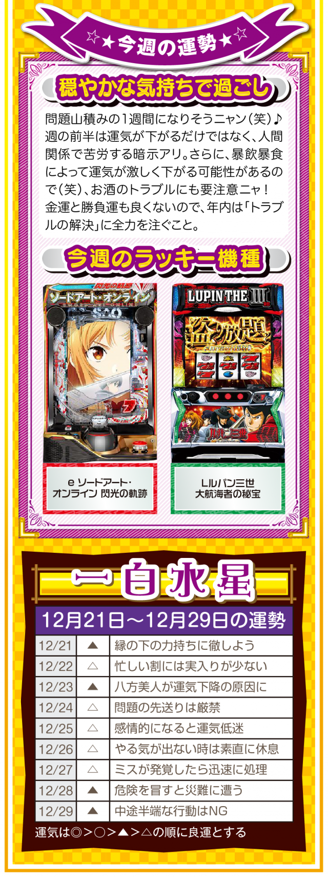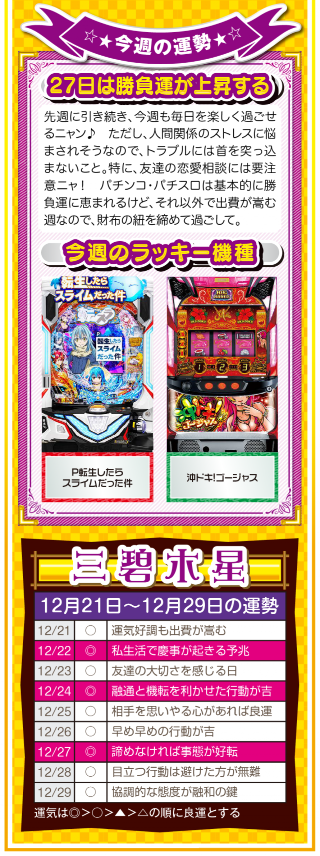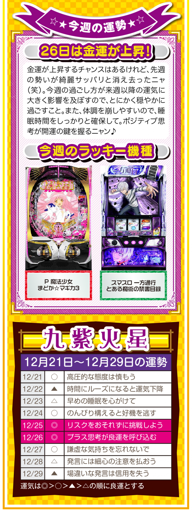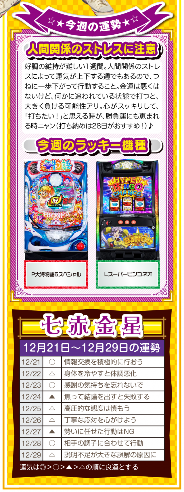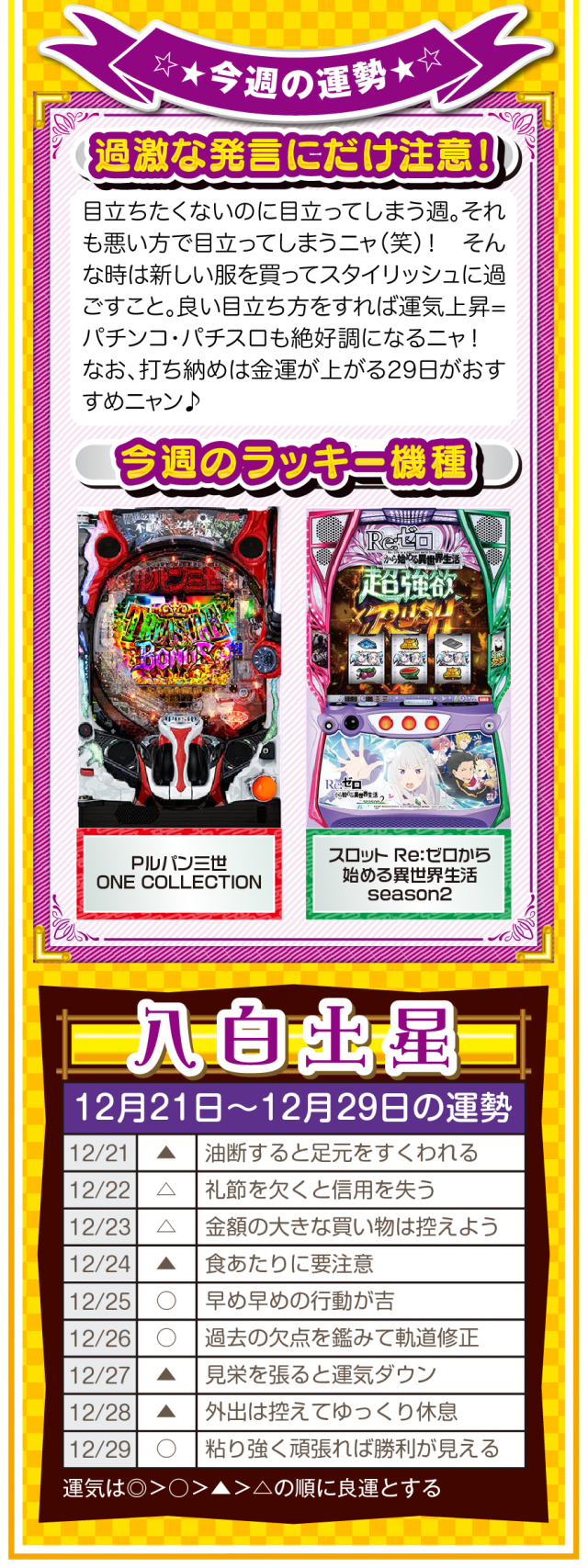 負けた時こそ、買いたい洋服を買って豪勢な夕飯を食べて友達と遊びに行く。惜しみなく出し切る人に幸運が訪れることを覚えておいてほしいニャン♪ というわけで早速、12月23日から29日の1週間を鑑定ニャ(有馬記念で全て出し切る予定のフォー・チュンチュンが、オマケとして12月21日と22日の運勢も鑑定したニャン♡)!