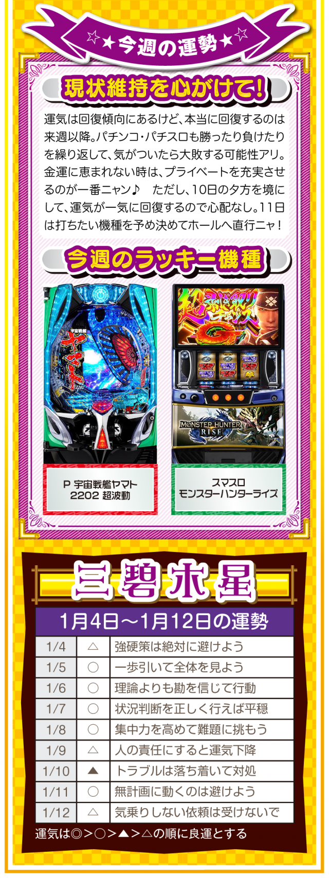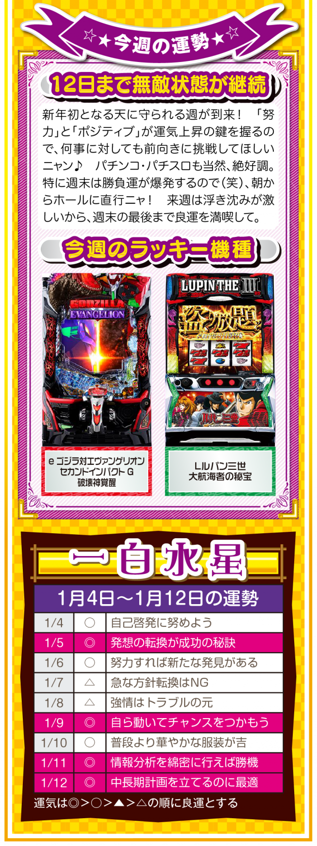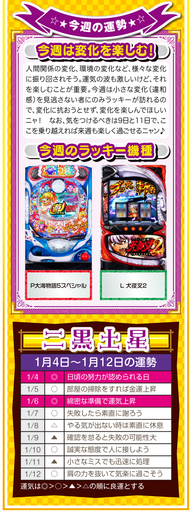 九星気学の新年は2月4日。素晴らしいスタートダッシュを切るためにも、「運」を意識して「運」に好かれる努力をしてほしいニャン♪ というわけで早速、1月6日から1月12日の1週間を鑑定ニャ(他人の目だけはどうしても気になるフォー・チュンチュンが、オマケとして1月4日と5日の運勢も鑑定したニャン♡)!