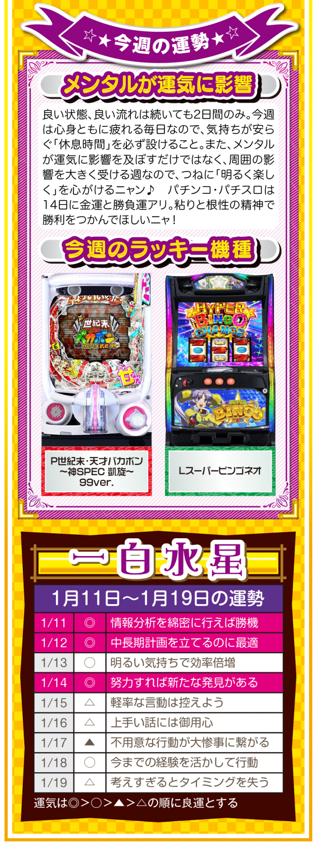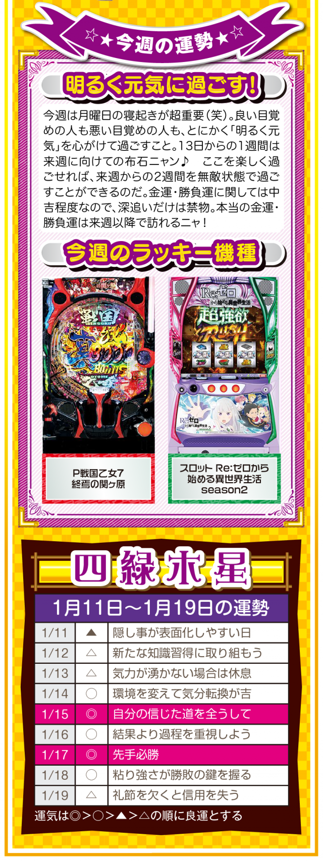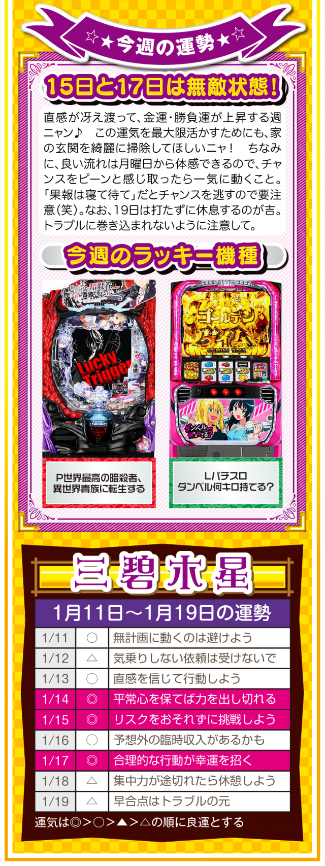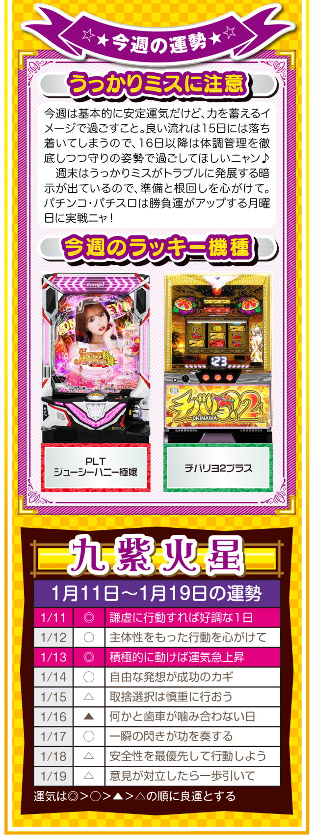 言葉を置き換えるだけで運気は上がるし、「無理」、「難しい」、「お金がない」を口にしないことが大ラッキーの始まりであることを覚えておいてほしいニャン♪ というわけで早速、1月13日から19日の1週間を鑑定ニャ(恋愛だけは難しいと思っているフォー・チュンチュンが、オマケとして11日と12日の運勢も鑑定したニャン♡)!