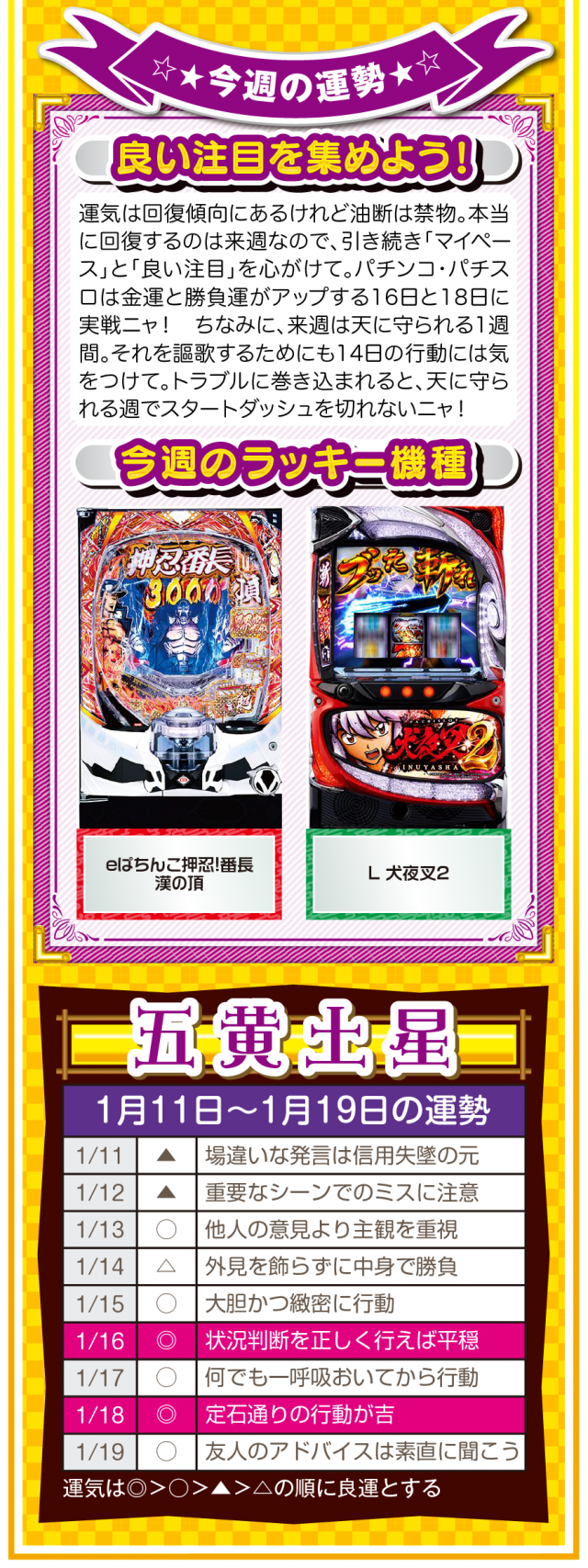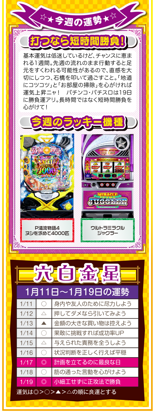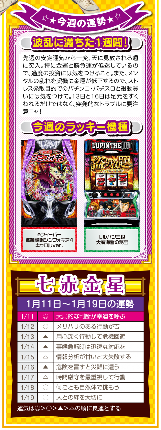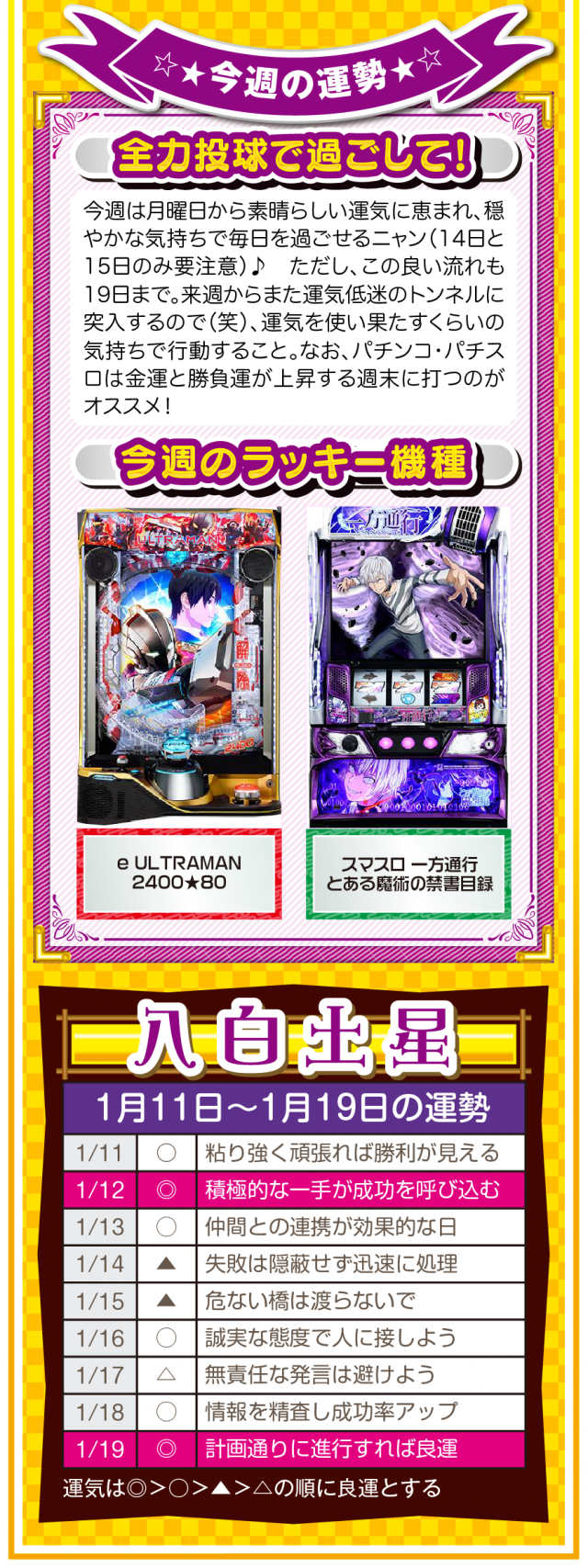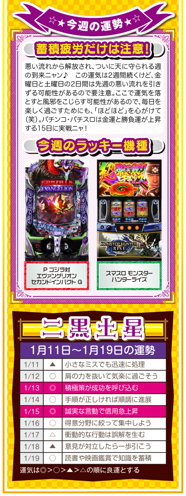 言葉を置き換えるだけで運気は上がるし、「無理」、「難しい」、「お金がない」を口にしないことが大ラッキーの始まりであることを覚えておいてほしいニャン♪ というわけで早速、1月13日から19日の1週間を鑑定ニャ(恋愛だけは難しいと思っているフォー・チュンチュンが、オマケとして11日と12日の運勢も鑑定したニャン♡)!