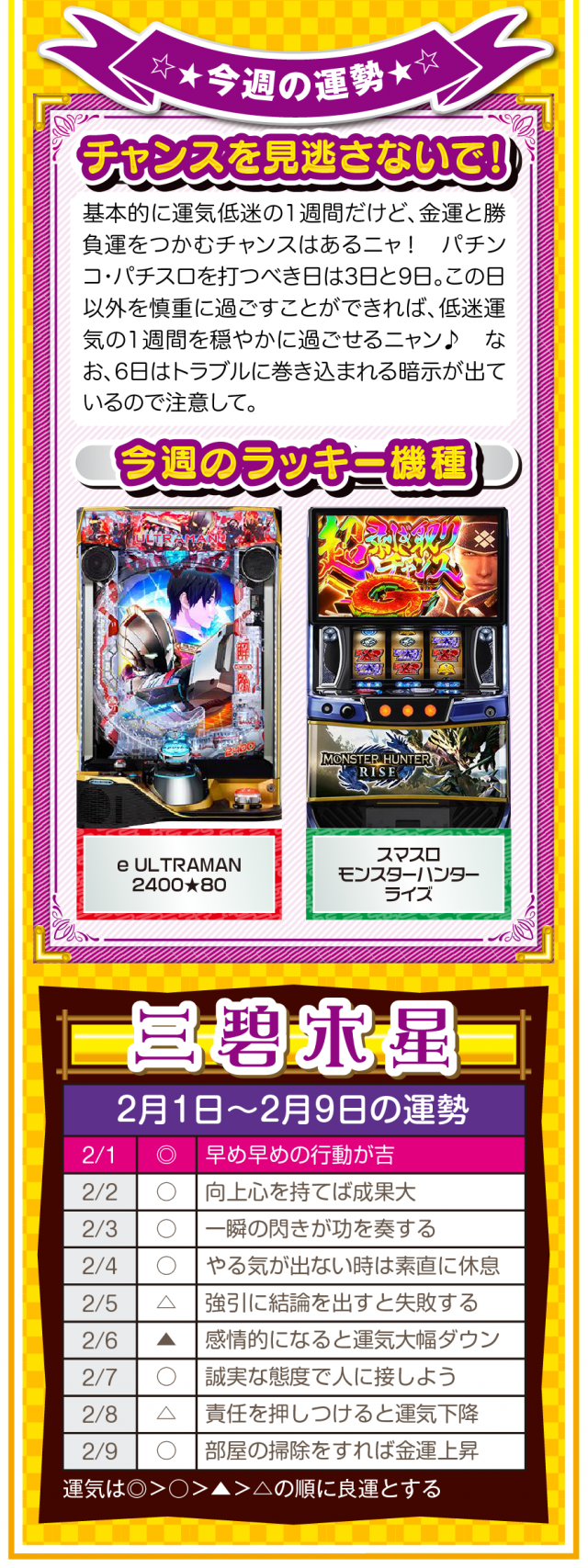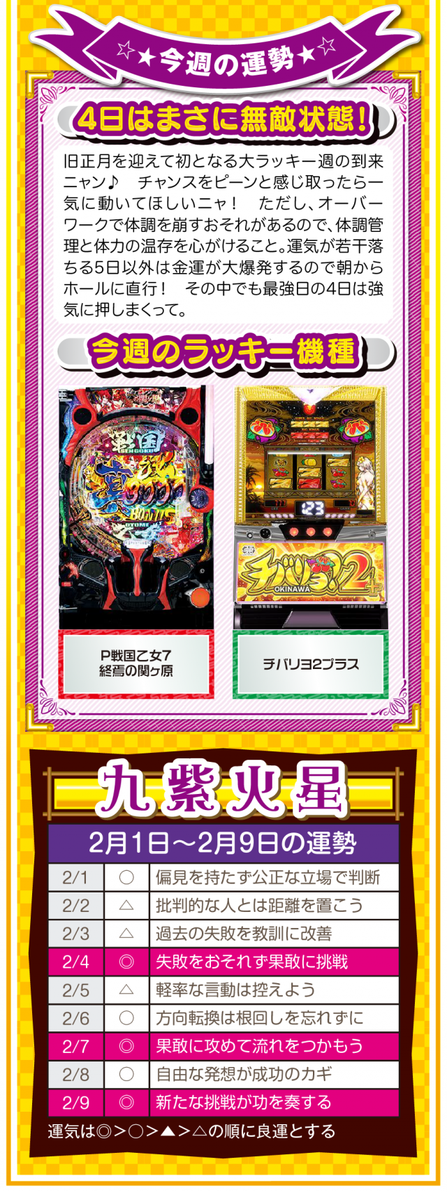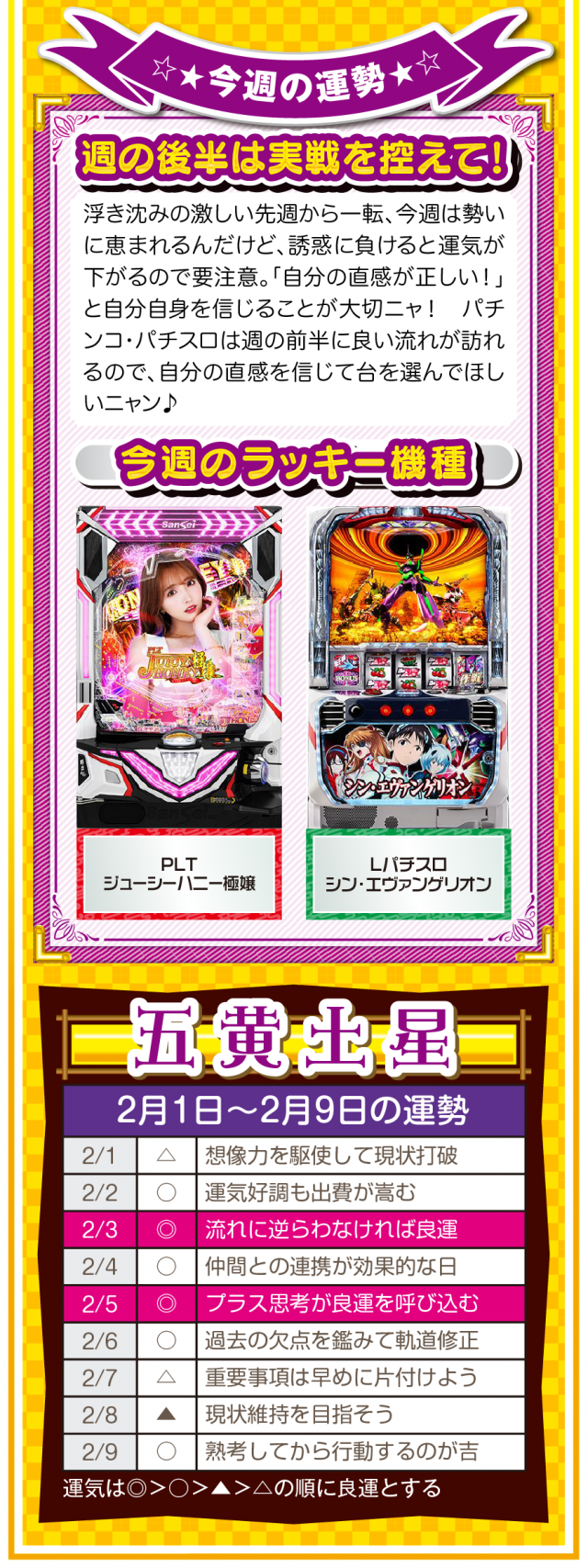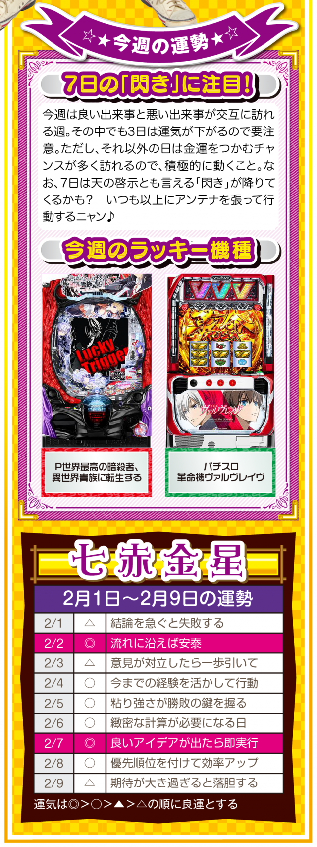 未来を見据えるルールが、アナタの人生を華やかにすることを覚えておいてほしいニャン♪ というわけで早速、2月3日から9日の1週間を鑑定ニャ(お酒を飲むと思い出話しか口にしないフォー・チュンチュンが、オマケとして1日と2日の運勢も鑑定したニャン♡)!