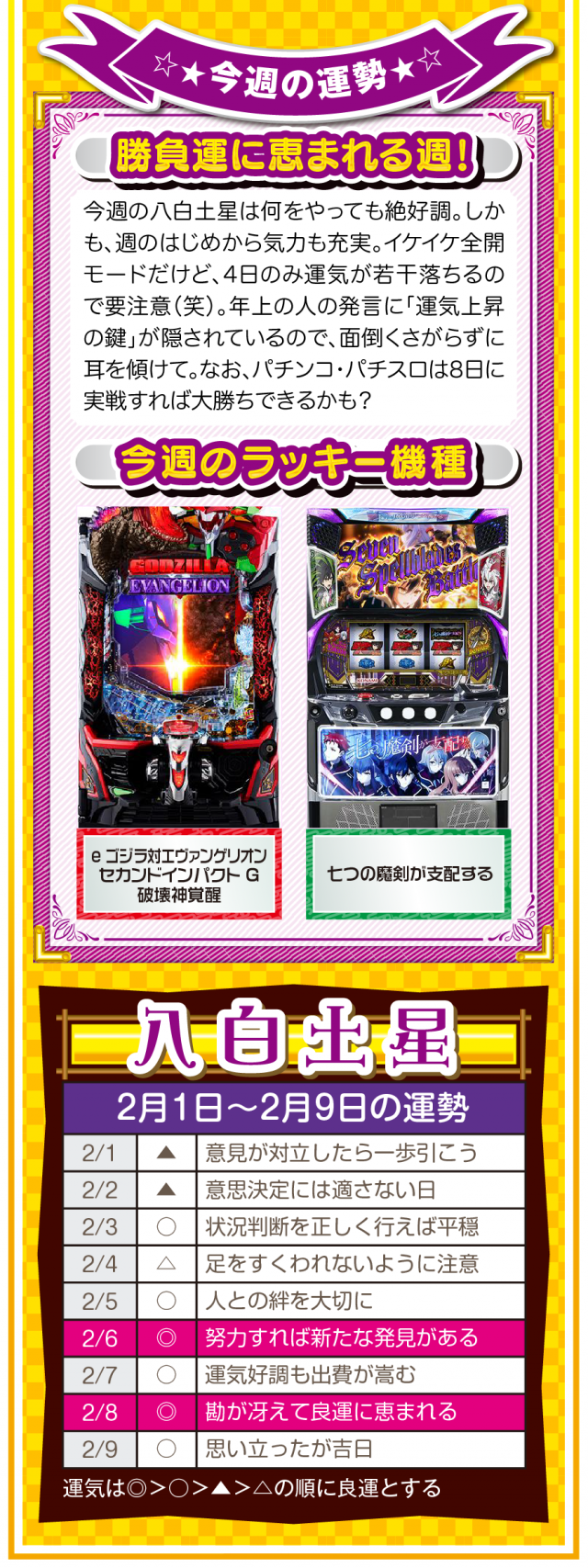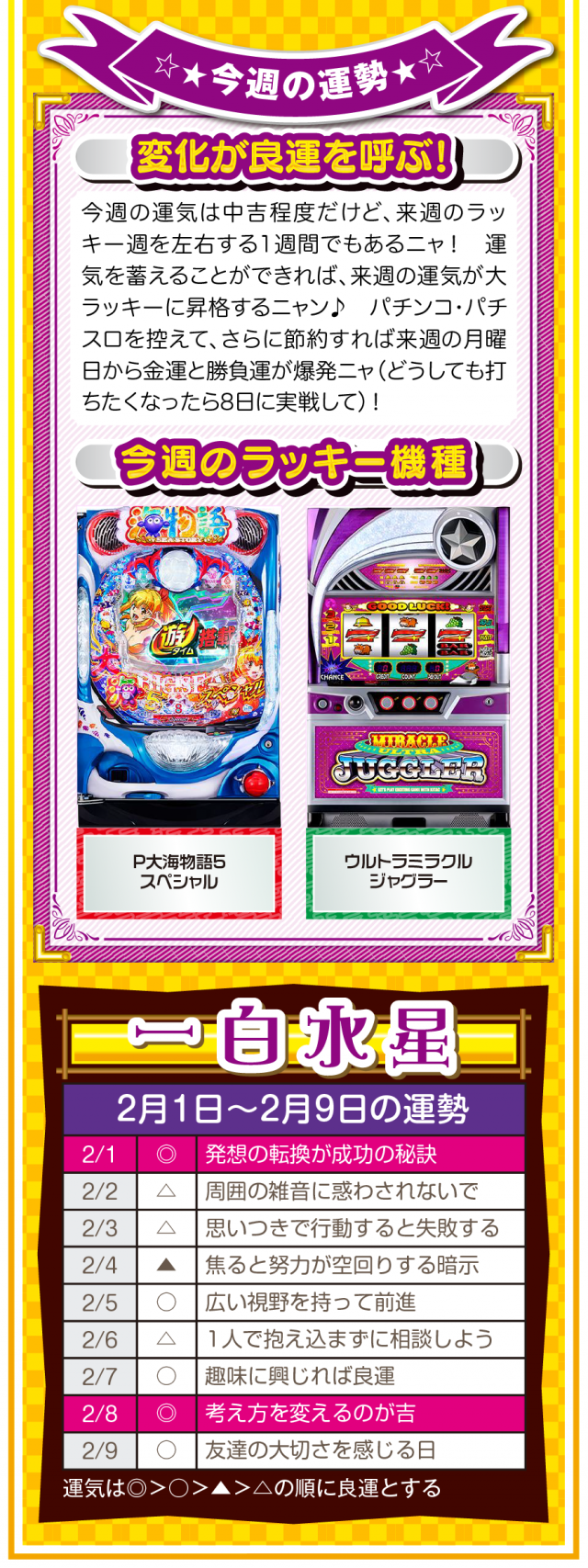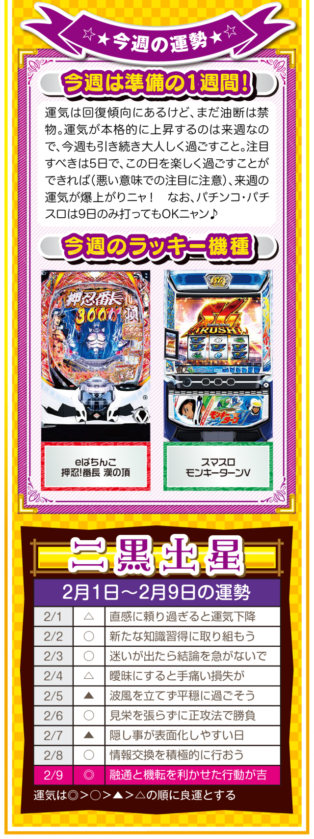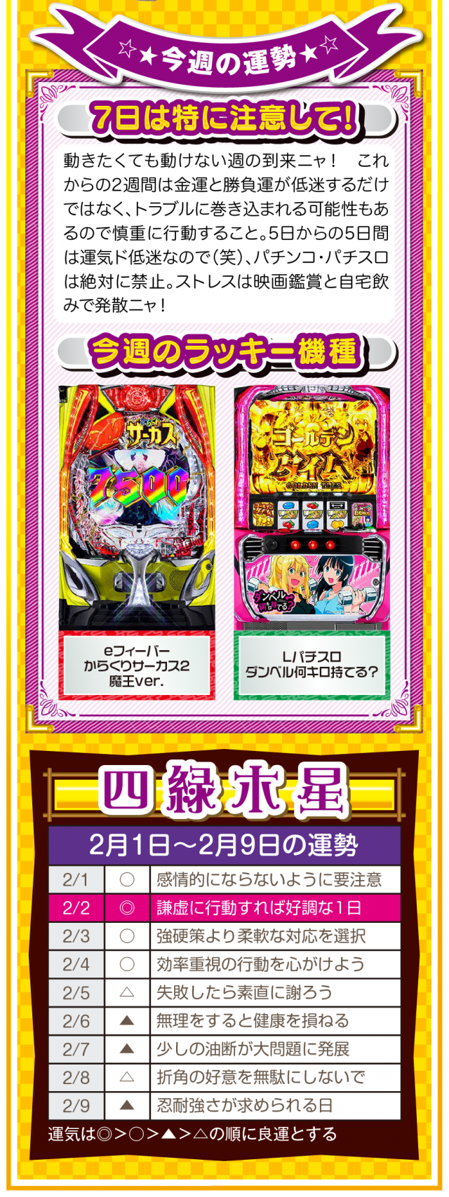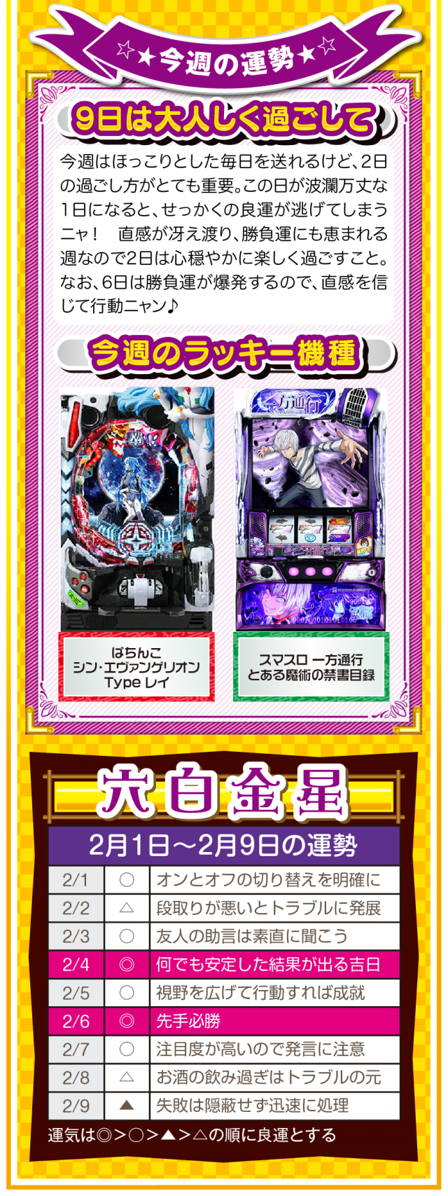 未来を見据えるルールが、アナタの人生を華やかにすることを覚えておいてほしいニャン♪ というわけで早速、2月3日から9日の1週間を鑑定ニャ(お酒を飲むと思い出話しか口にしないフォー・チュンチュンが、オマケとして1日と2日の運勢も鑑定したニャン♡)!