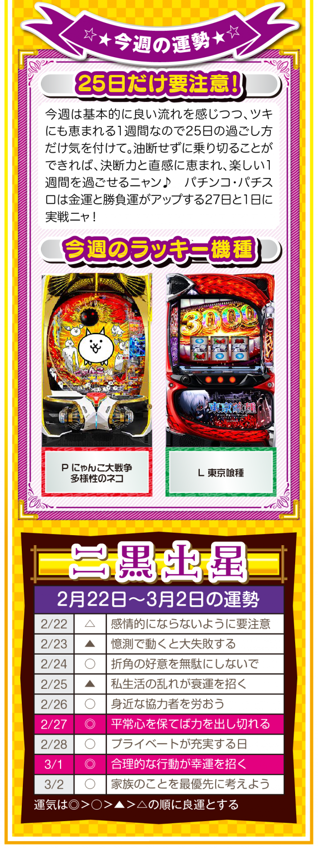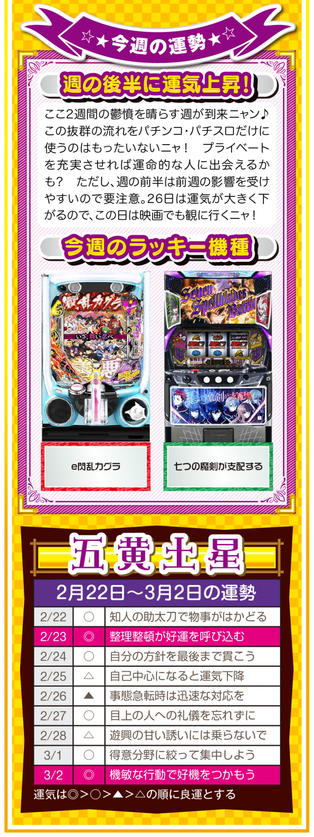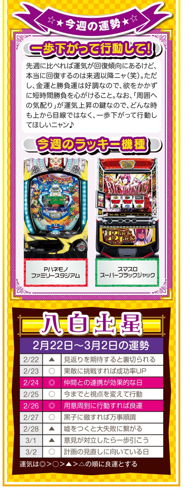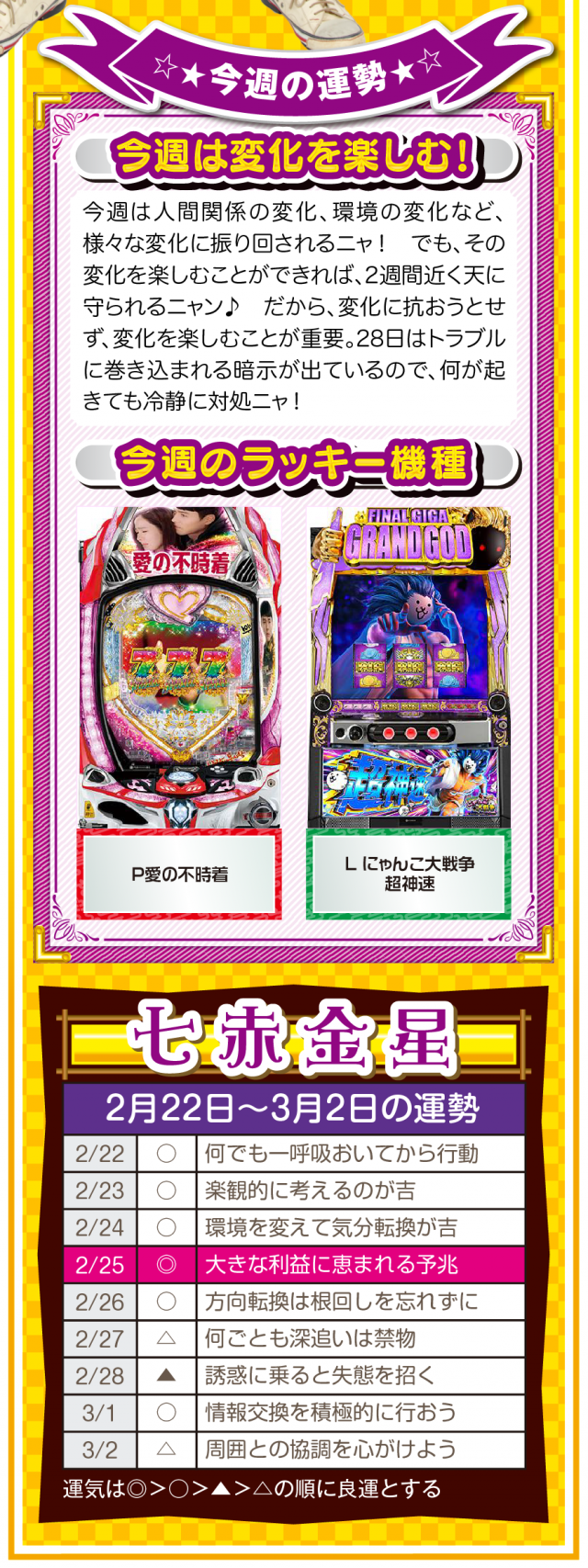 見栄とプライドに支配されると運気を落とし、愛されるバカは極上の運気を手に入れる。生きづらさを少しでも感じたら、開き直ってバカになる。愛されるバカは愛に満ち溢れていることを覚えておいてほしいニャン♪ というわけで早速、2月24日から3月2日の1週間を鑑定ニャ(とにかく愛されるバカを自負するフォー・チュンチュンが、オマケとして2月22日と23日の運勢も鑑定したニャ♡)!