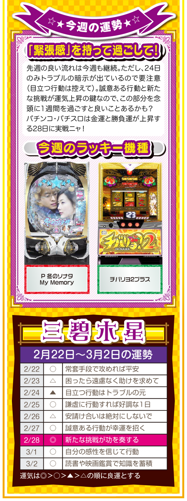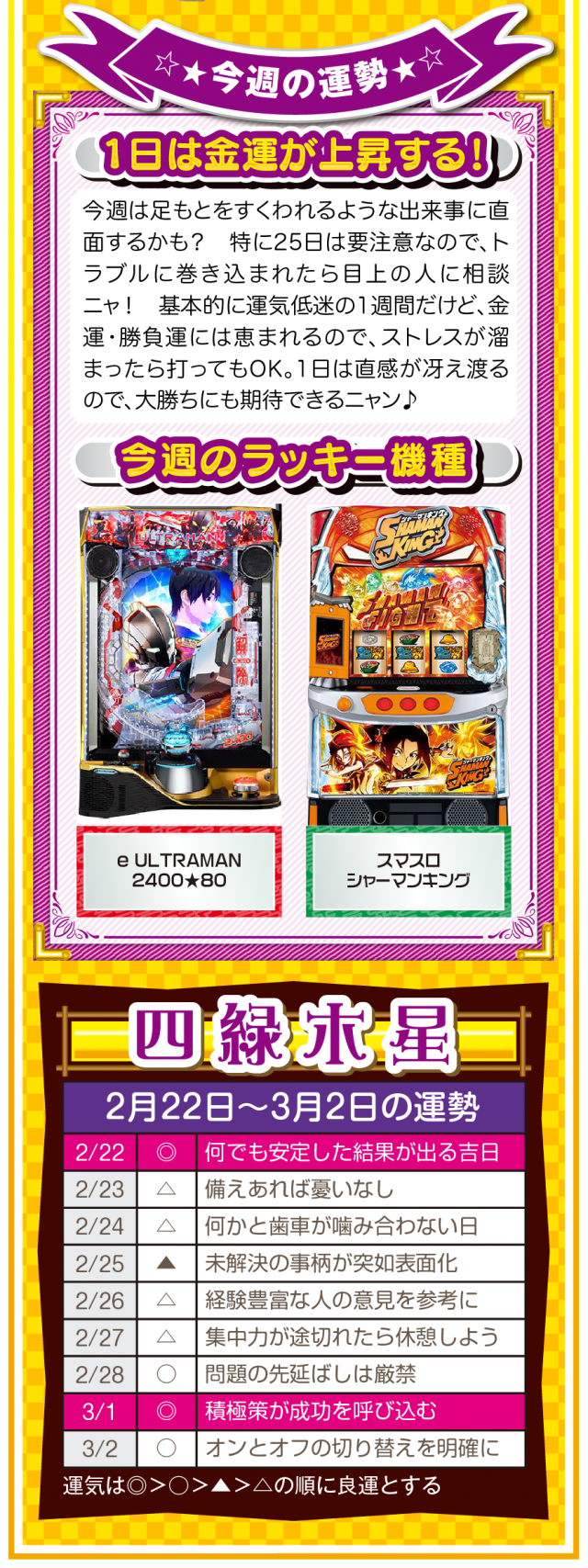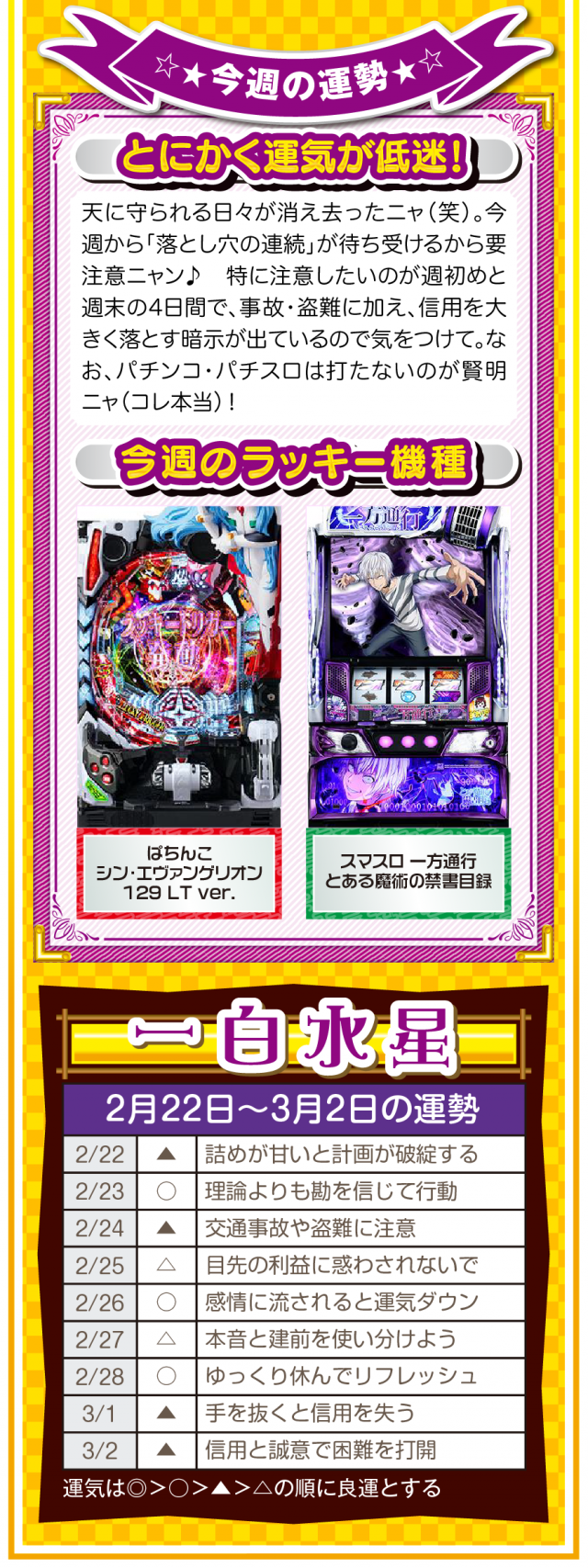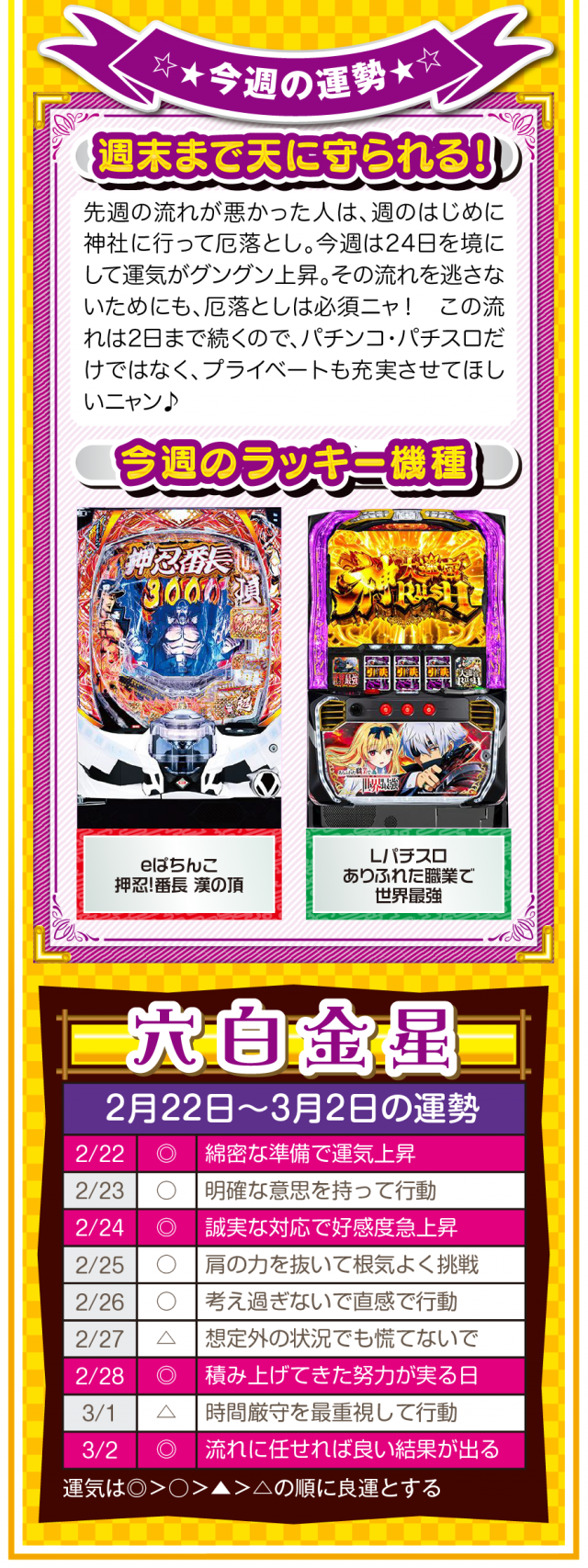 見栄とプライドに支配されると運気を落とし、愛されるバカは極上の運気を手に入れる。生きづらさを少しでも感じたら、開き直ってバカになる。愛されるバカは愛に満ち溢れていることを覚えておいてほしいニャン♪ というわけで早速、2月24日から3月2日の1週間を鑑定ニャ(とにかく愛されるバカを自負するフォー・チュンチュンが、オマケとして2月22日と23日の運勢も鑑定したニャ♡)!