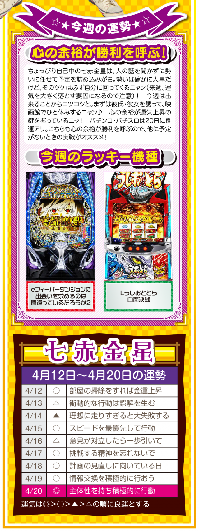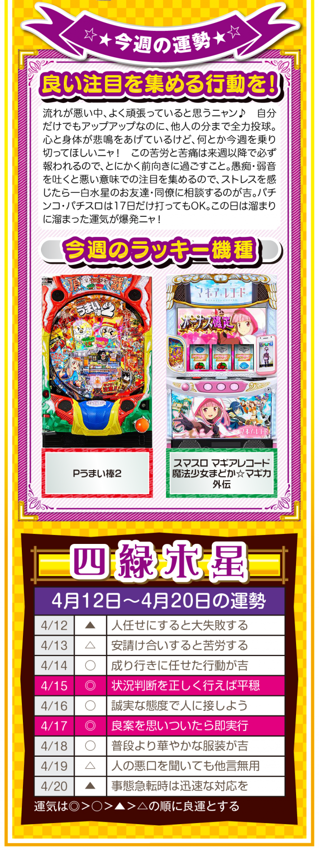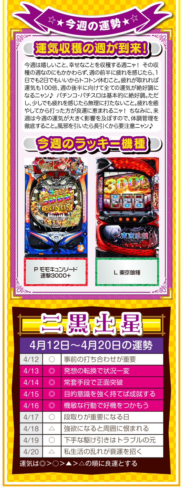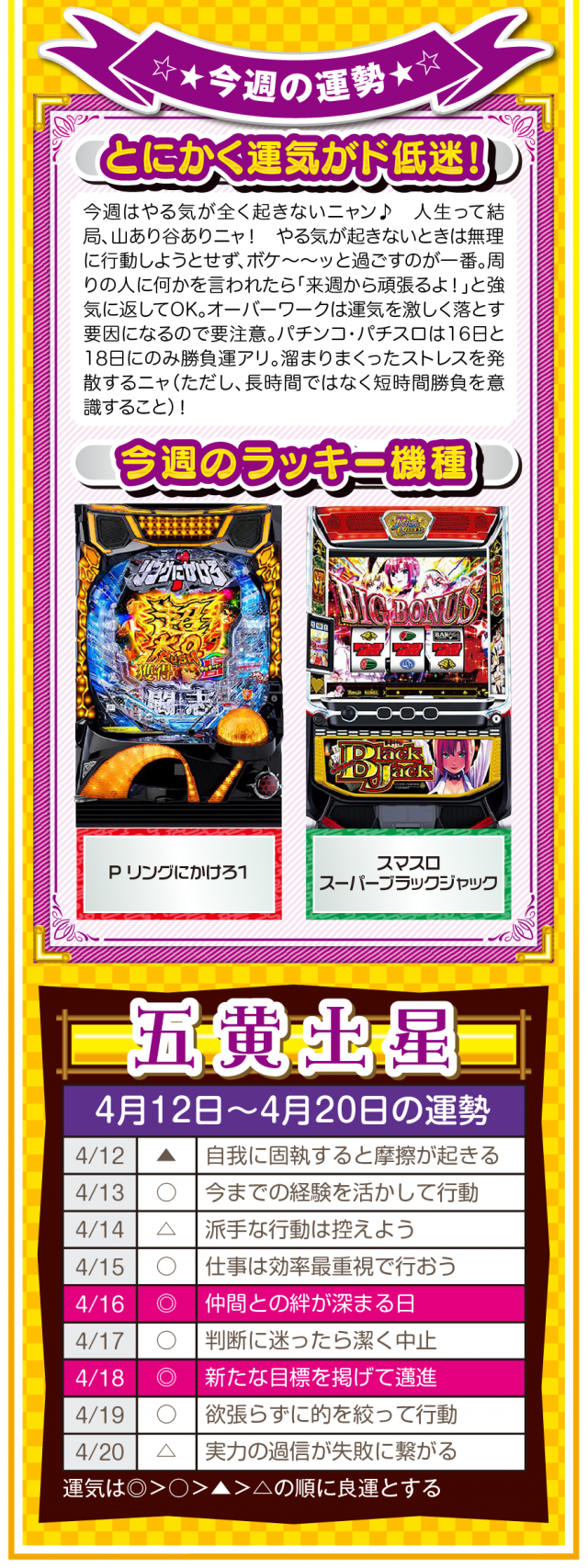 許せば心が解放され、あなた自身も楽になり、もっともっと前に進める。許せない自分自身も許して、今日もポジティブに頑張るニャン♪ というわけで早速、4月14日から20日の1週間を鑑定ニャ(『スマスロスーパーブラックジャック』にイライラが止まらないフォー・チュンチュンが、オマケとして4月12日と13日の運勢も鑑定したニャン♡)!