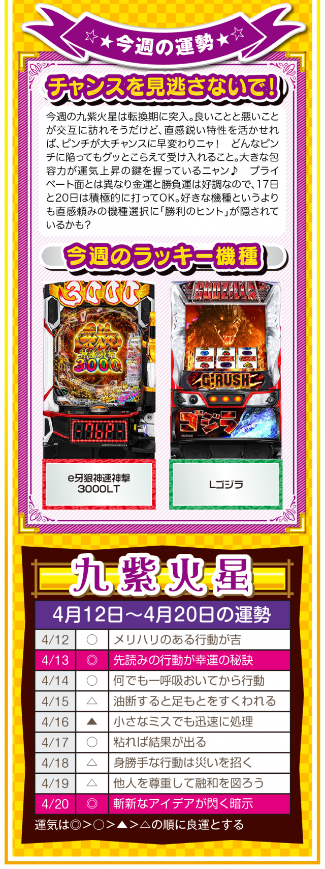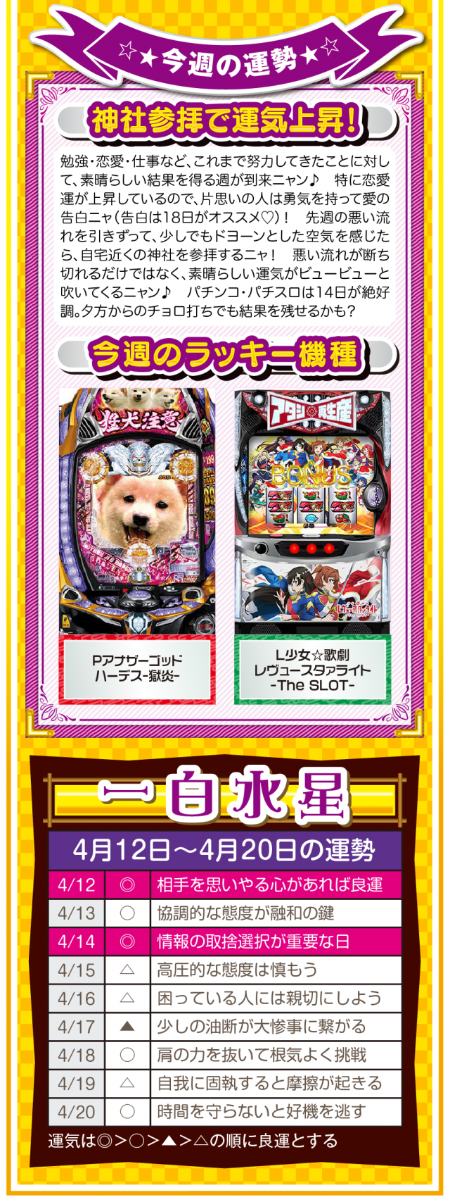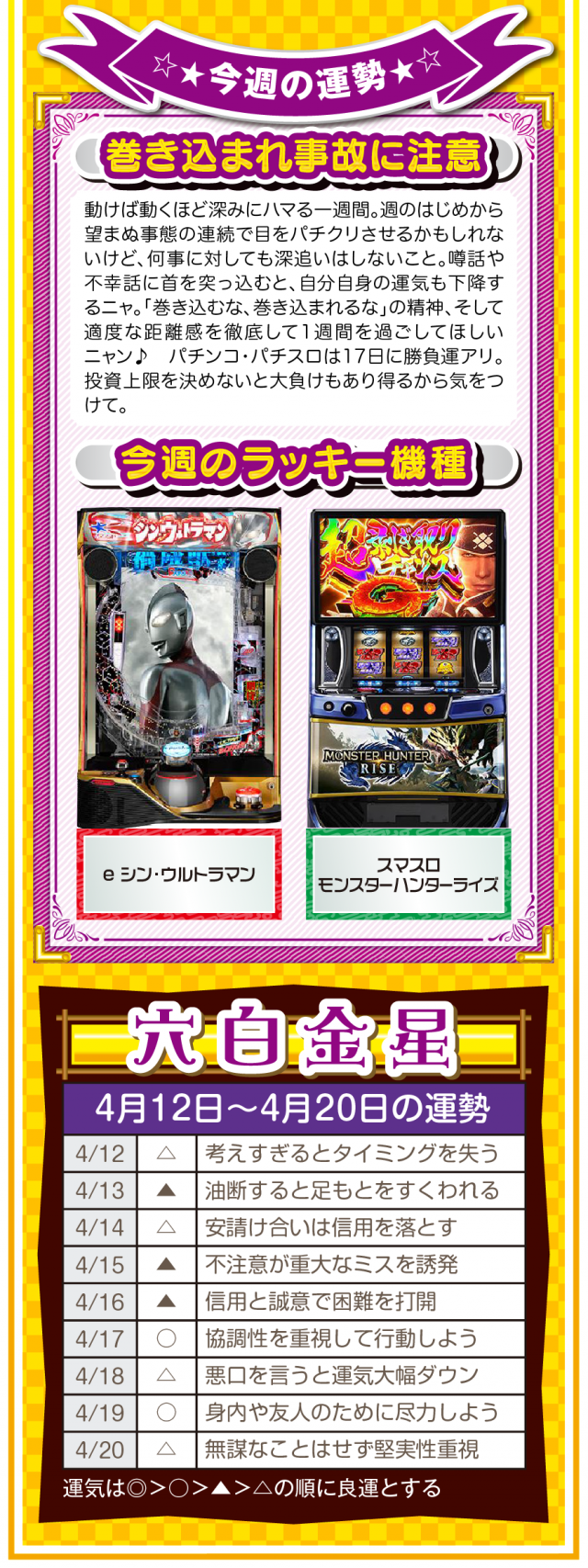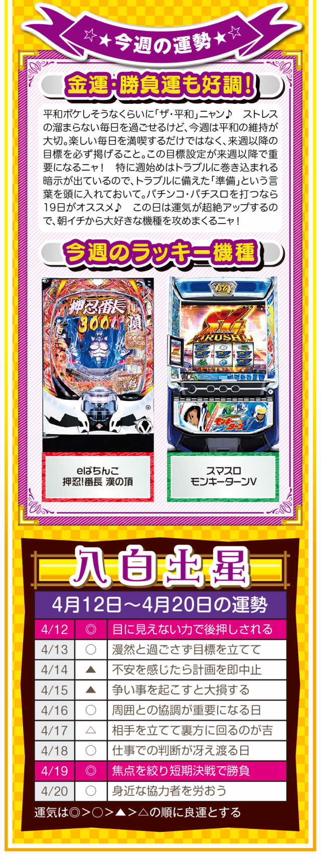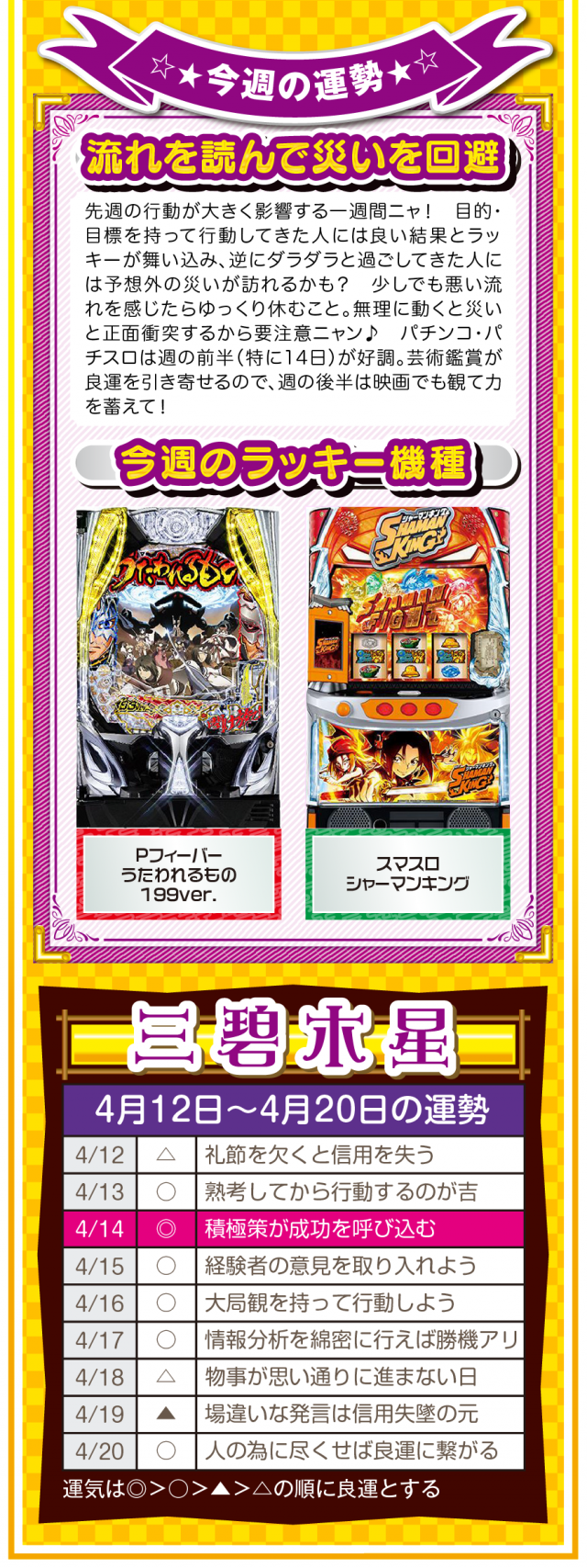 許せば心が解放され、あなた自身も楽になり、もっともっと前に進める。許せない自分自身も許して、今日もポジティブに頑張るニャン♪ というわけで早速、4月14日から20日の1週間を鑑定ニャ(『スマスロスーパーブラックジャック』にイライラが止まらないフォー・チュンチュンが、オマケとして4月12日と13日の運勢も鑑定したニャン♡)!