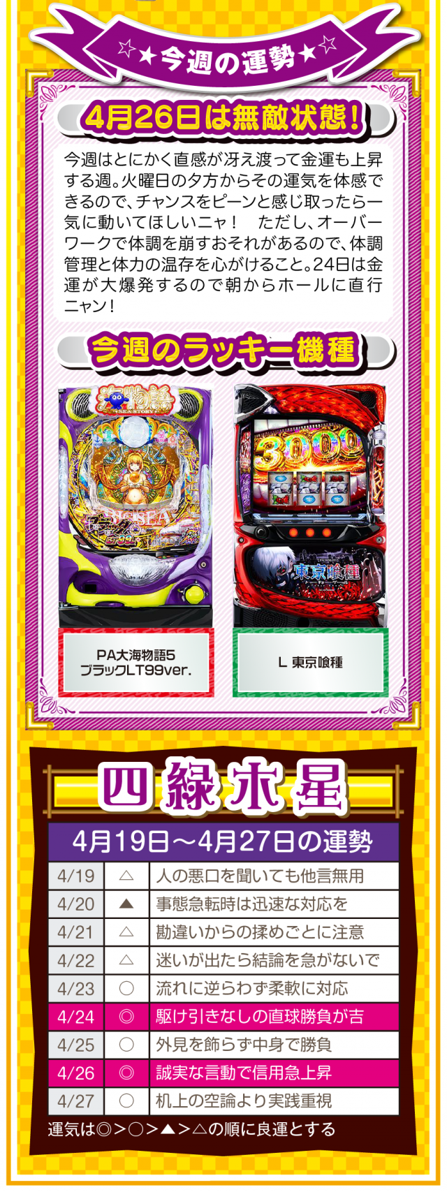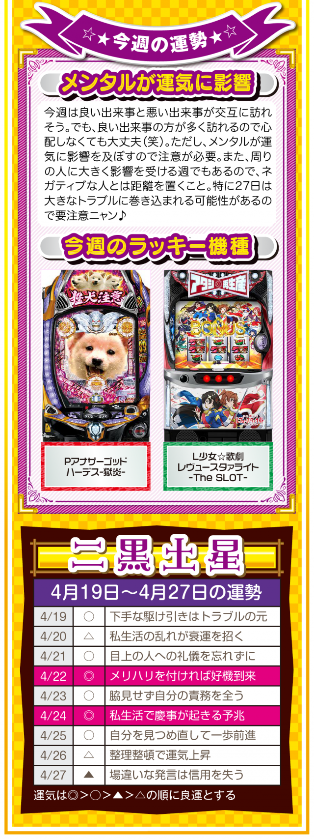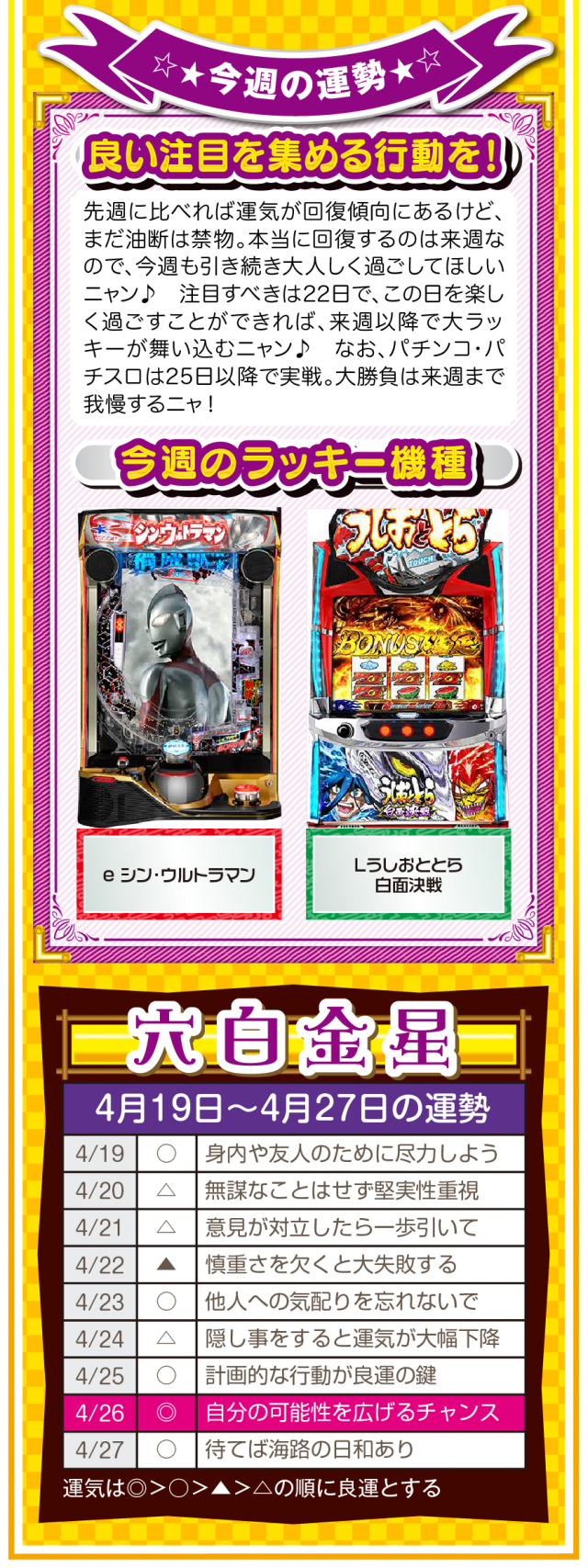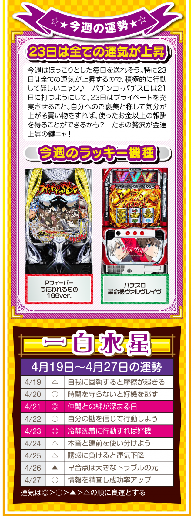 人生はつねに真剣勝負。時間の浪費を少なくすれば、夢や希望もどんどん近付いてくることを覚えておいてほしいニャン♪ というわけで早速、4月21日から27日の1週間を鑑定ニャ(13時間も寝てしまったフォー・チュンチュンが、オマケとして4月19日と20日の運勢も鑑定したニャン♡)!