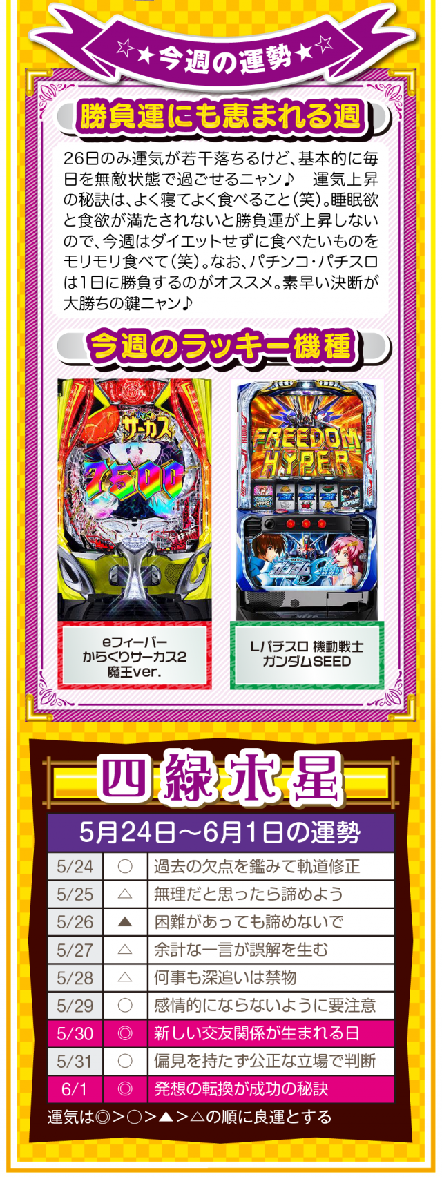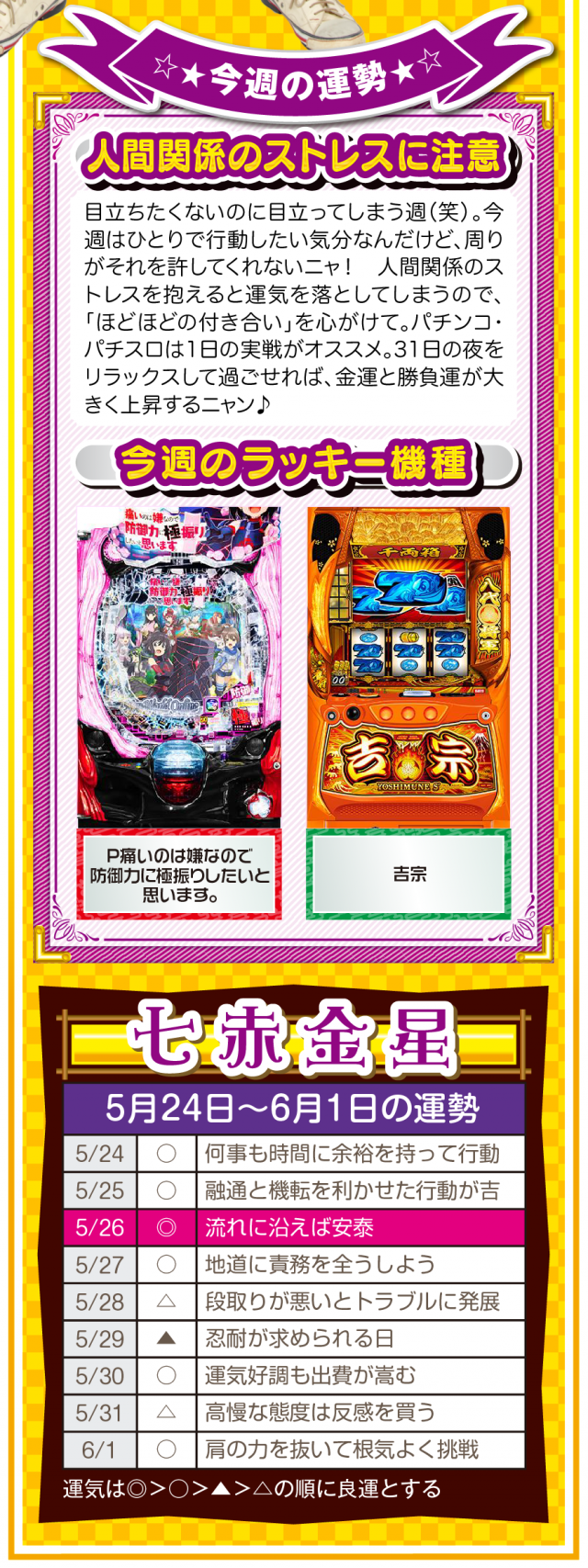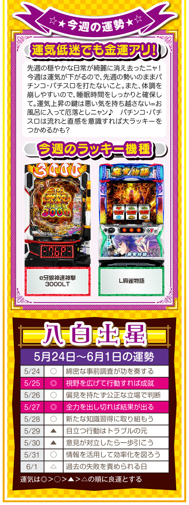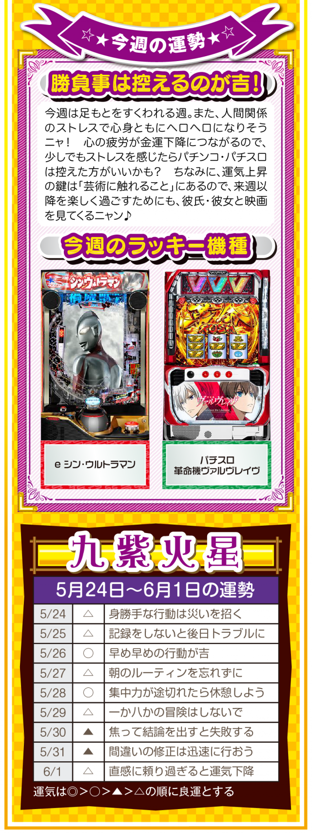 金運を継続的に上げたいのなら、自宅の西側に黄色いものを置きつつ、日々活字に触れる。信じるか信じないかはアナタ次第だけど(笑)、風水の源流は動の運命学である九星気学ということを覚えておいてほしいニャン♪ というわけで早速、5月26日から6月1日の1週間を鑑定ニャ(自宅の西側に金色の招き猫を置いているフォー・チュンチュンが、オマケとして5月24日と25日の運勢も鑑定したニャン♡)!