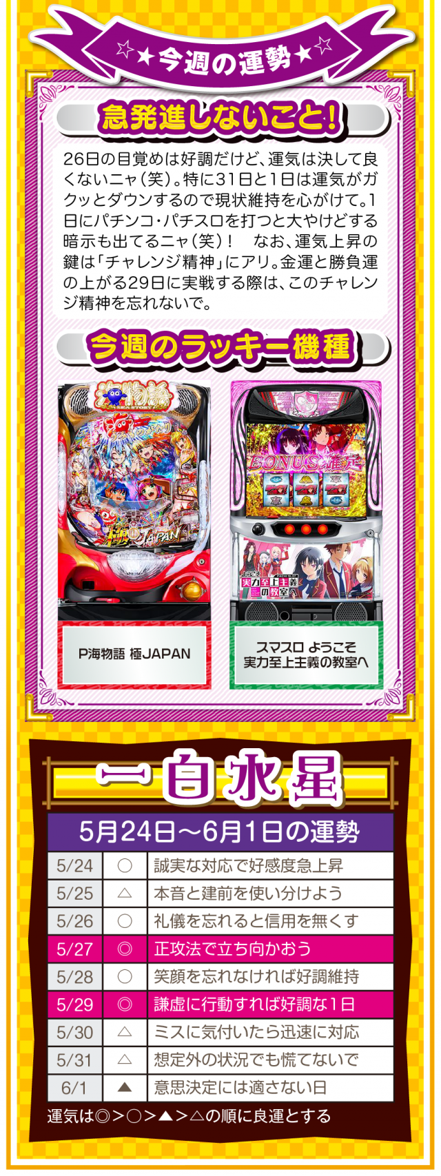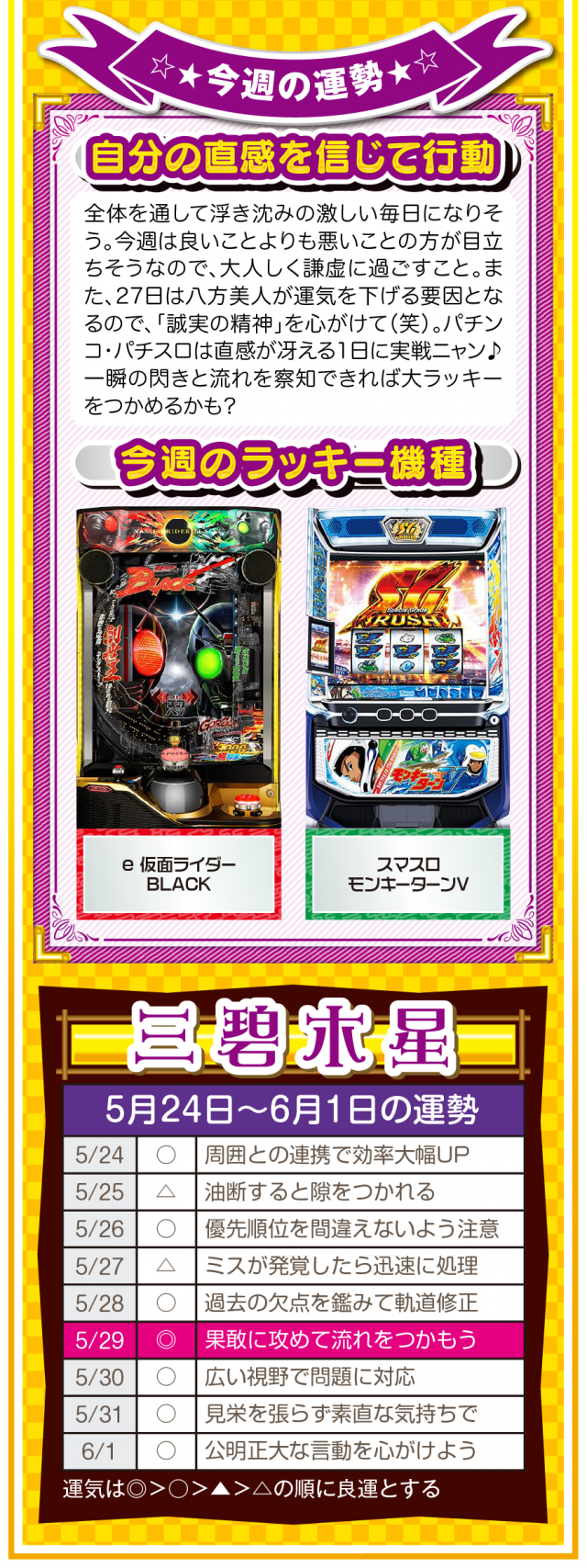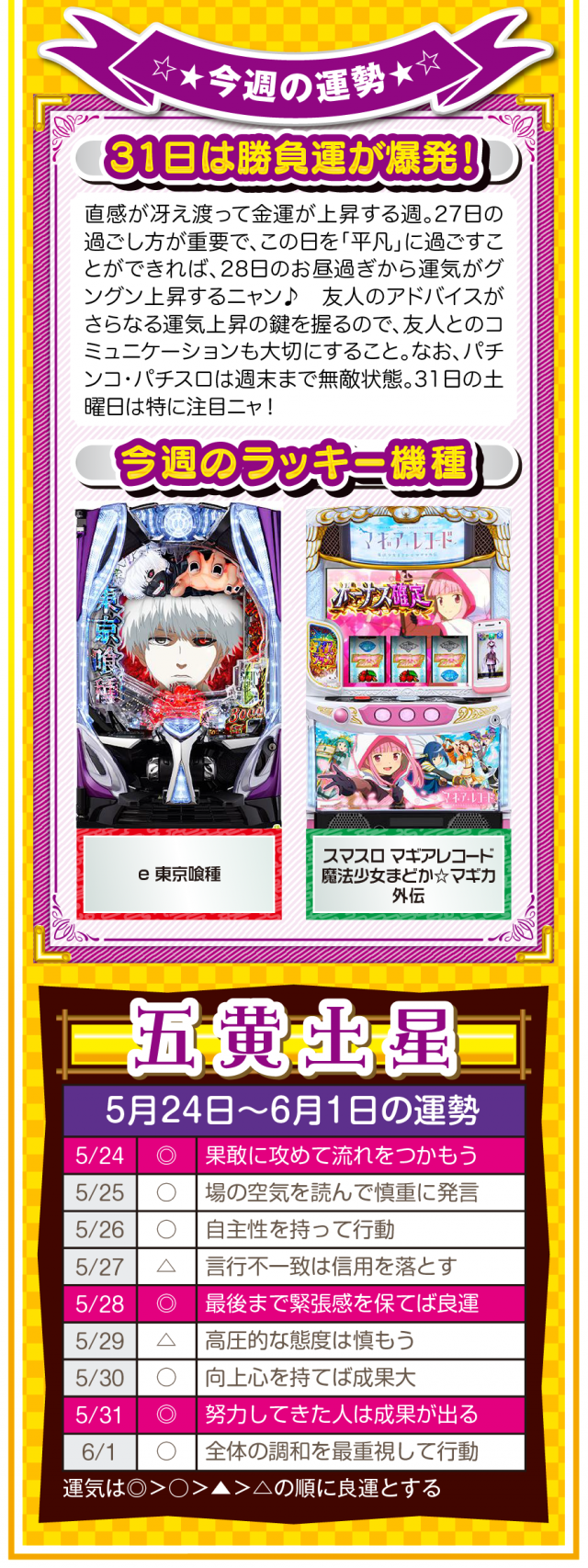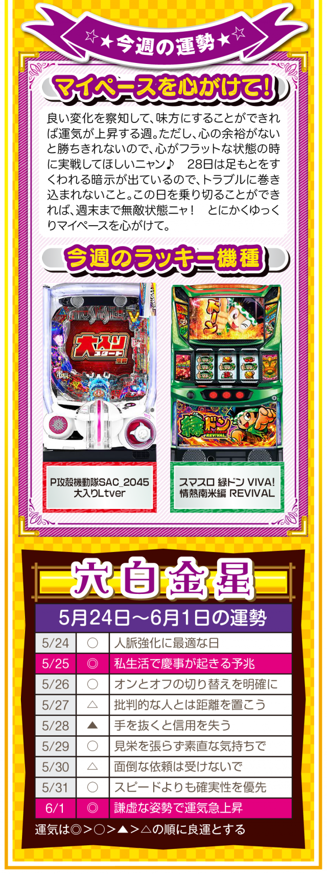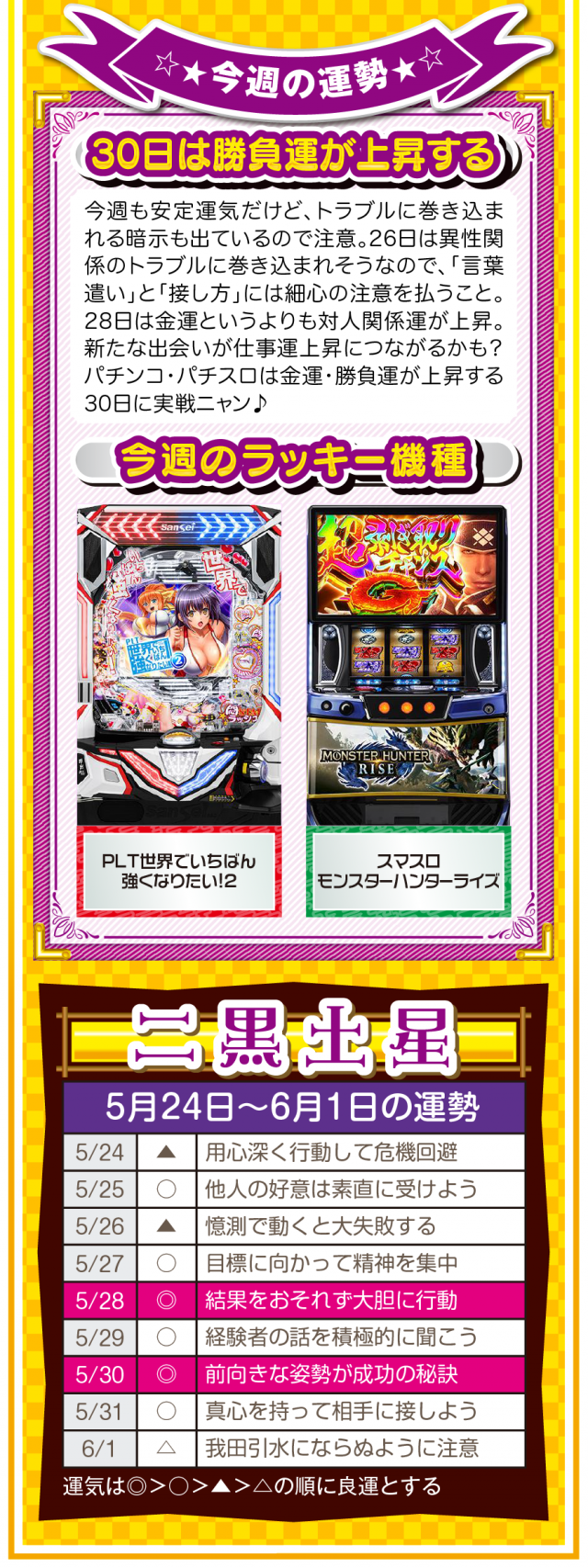 金運を継続的に上げたいのなら、自宅の西側に黄色いものを置きつつ、日々活字に触れる。信じるか信じないかはアナタ次第だけど(笑)、風水の源流は動の運命学である九星気学ということを覚えておいてほしいニャン♪ というわけで早速、5月26日から6月1日の1週間を鑑定ニャ(自宅の西側に金色の招き猫を置いているフォー・チュンチュンが、オマケとして5月24日と25日の運勢も鑑定したニャン♡)!