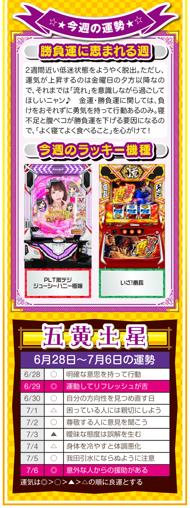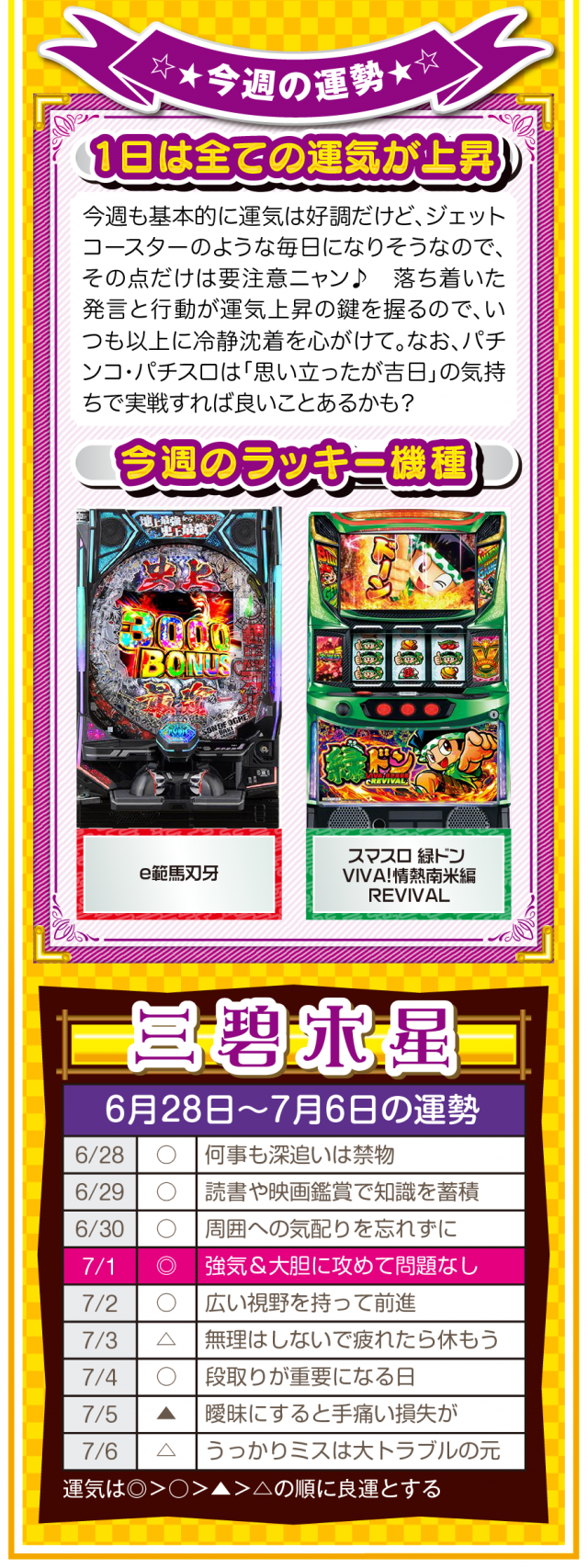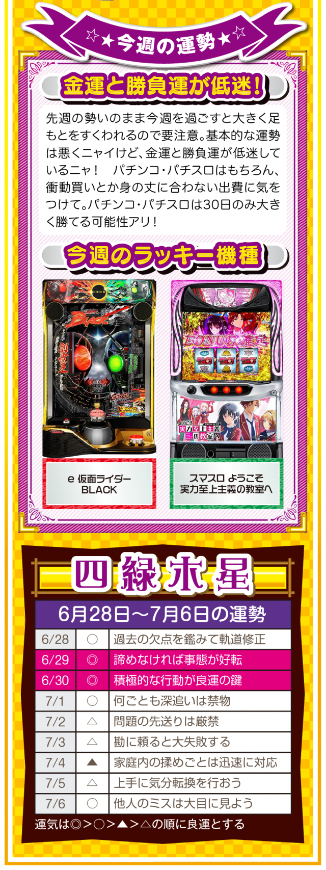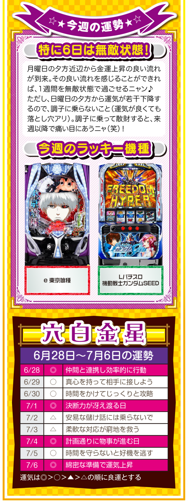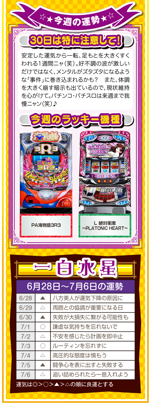 他人を嫉むことは簡単。でも、嫉みから生まれるのは「孤立」ということを覚えておいてほしいニャ! というわけで早速、6月30日から7月6日の1週間を鑑定ニャン(ベイスターズのバウアーをとにかくリスペクトするフォー・チュンチュンが、オマケとして6月28日と29日の運勢も鑑定したニャ!)♪