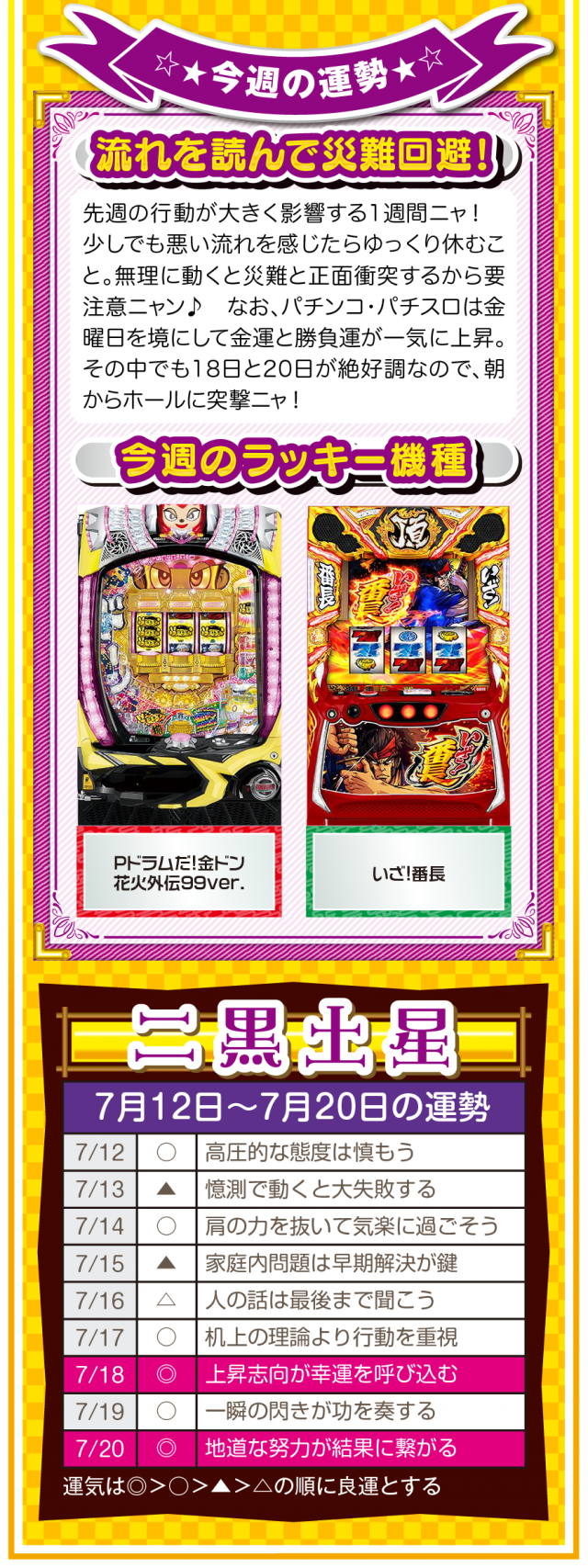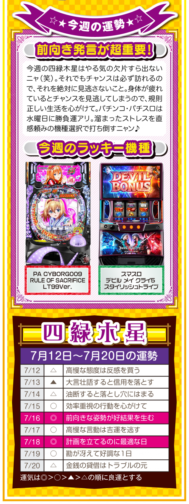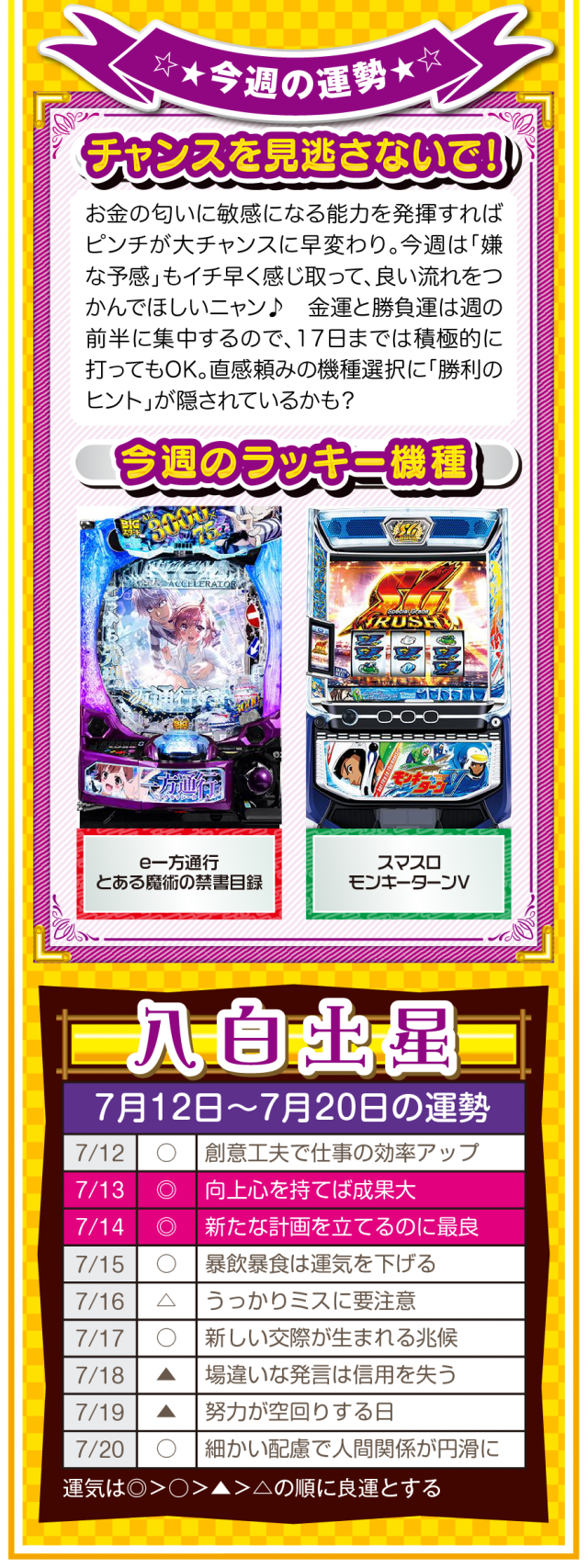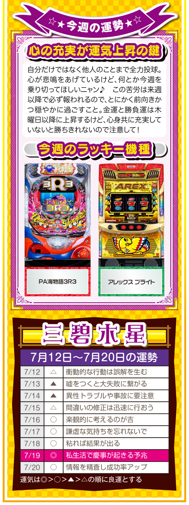 人生に失敗など存在せず、全ては経験なだけ。諦めることから得られる経験は、その後の人生でとても役立つことを覚えておいてほしいニャン♪ というわけで早速、7月14日から20日の1週間を鑑定ニャ(過去の恋愛を美化できないフォー・チュンチュンが、オマケとして12日と13日の運勢も鑑定したニャン♡)!