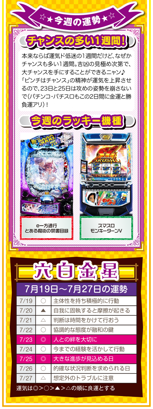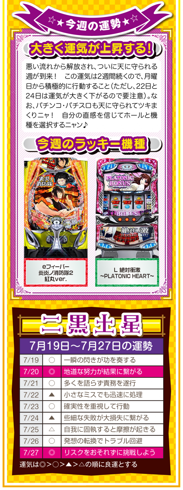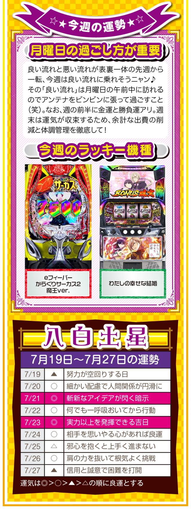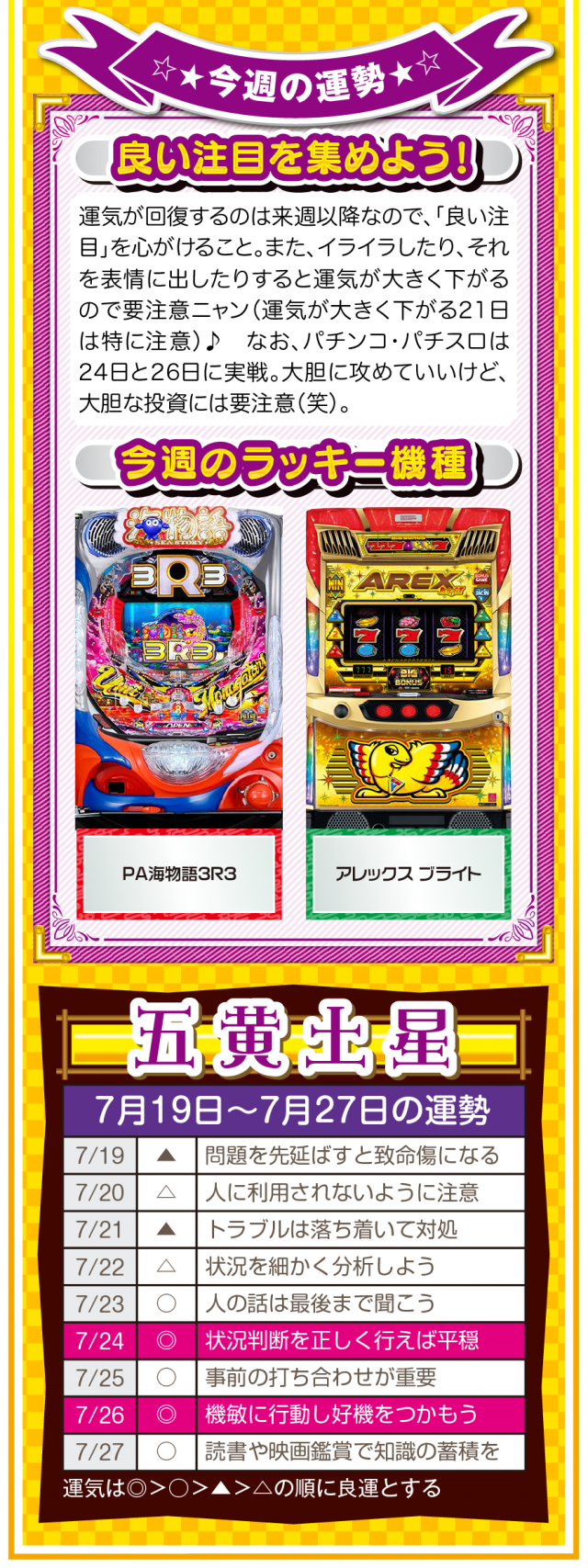 だから、流れを意識して真剣に生きること。どんな流れでもその流れを楽しむことが出来れば、必ず幸せに流れ着くことを覚えておいてほしいニャン♪ というわけで早速、7月21日から7月27日の1週間を鑑定ニャ(神奈川県の高校野球から目が離せないフォー・チュンチュンが、オマケとして19日と20日の運勢も鑑定したニャン♡)!