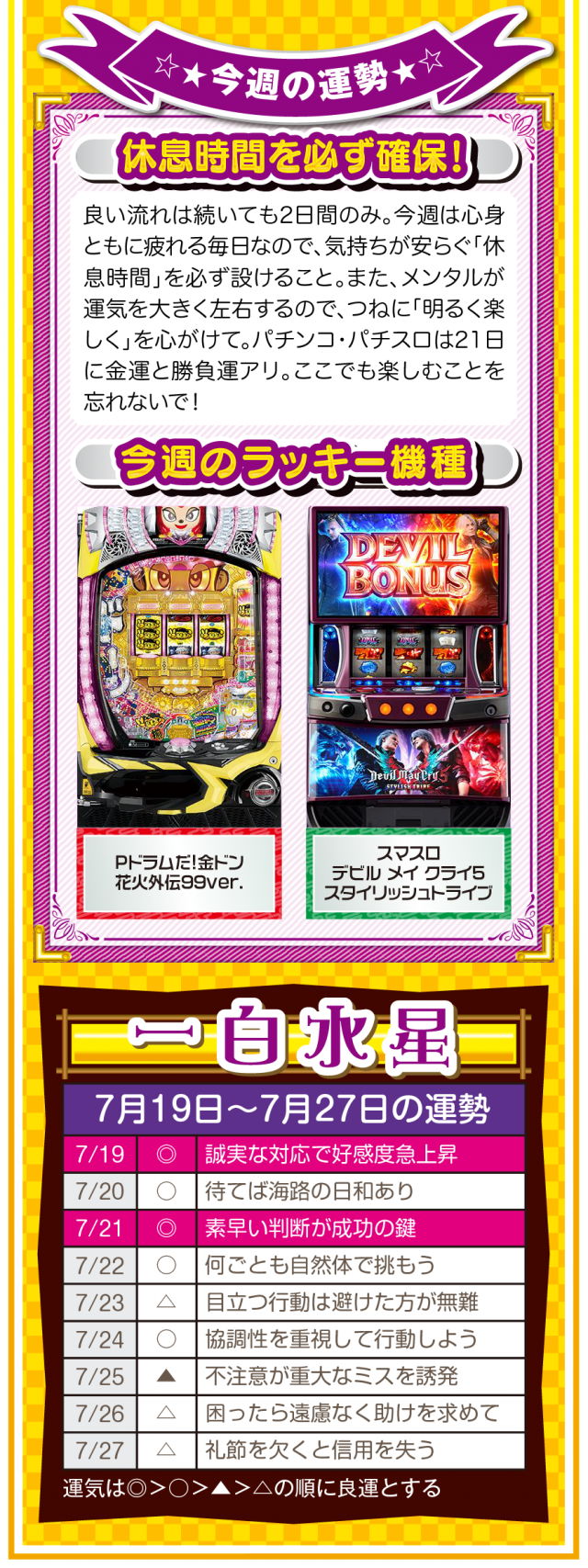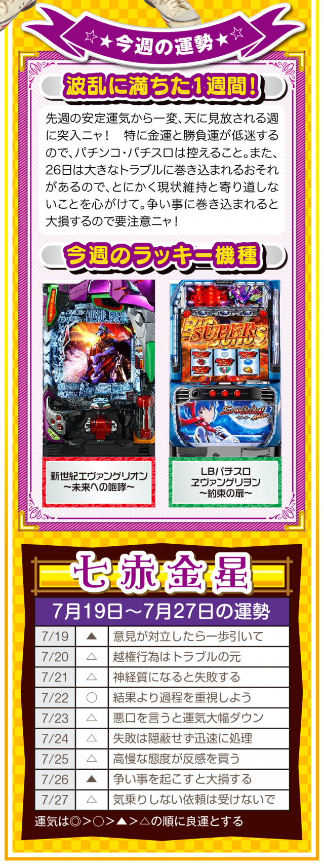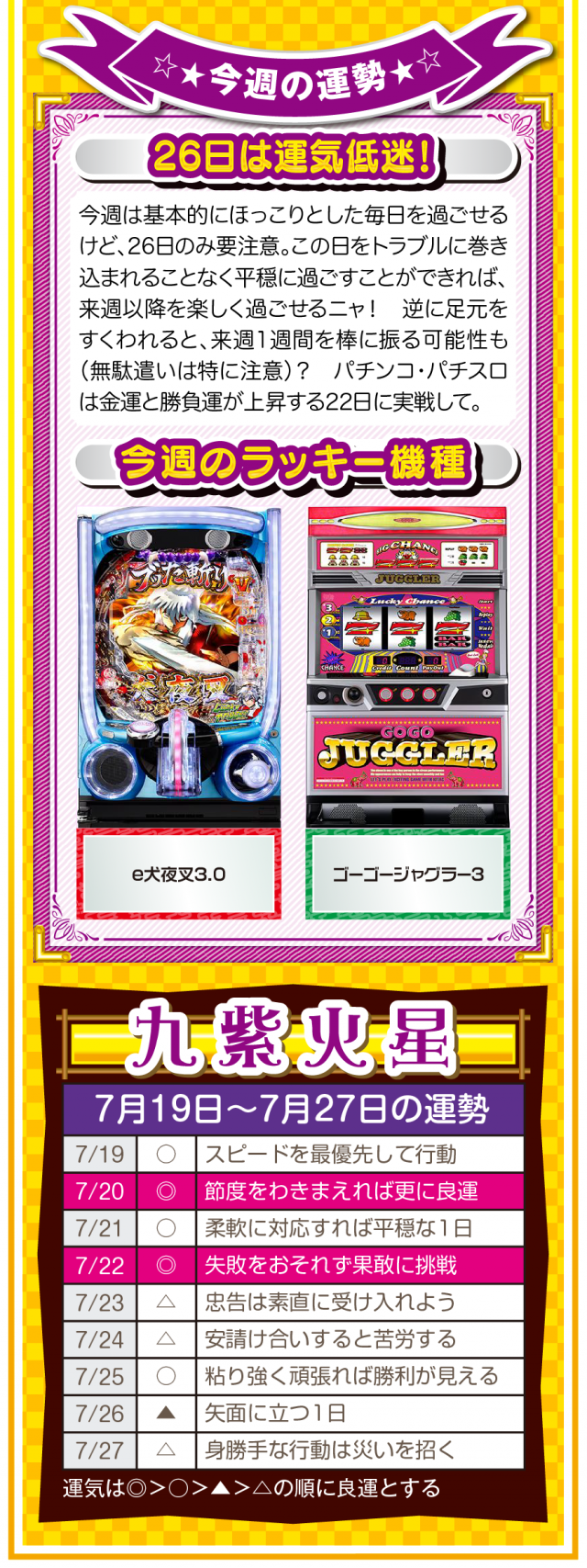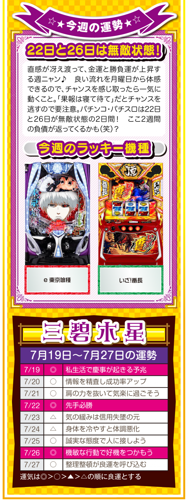 だから、流れを意識して真剣に生きること。どんな流れでもその流れを楽しむことが出来れば、必ず幸せに流れ着くことを覚えておいてほしいニャン♪ というわけで早速、7月21日から7月27日の1週間を鑑定ニャ(神奈川県の高校野球から目が離せないフォー・チュンチュンが、オマケとして19日と20日の運勢も鑑定したニャン♡)!