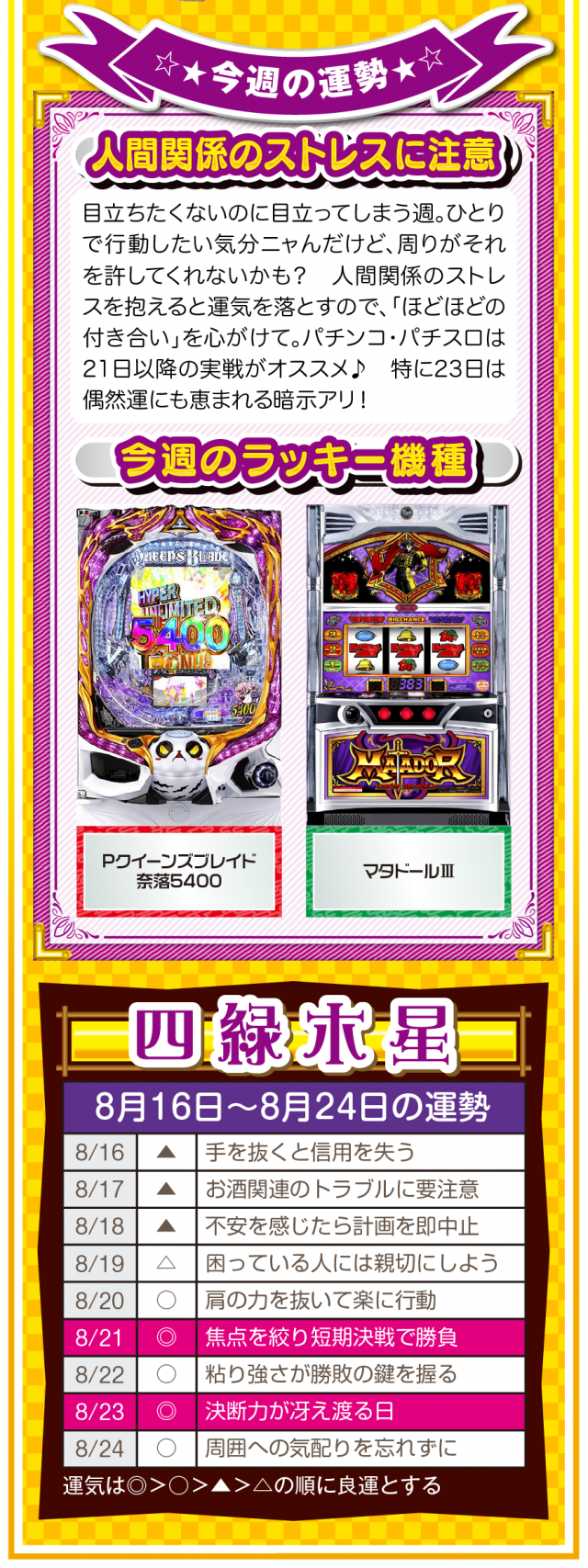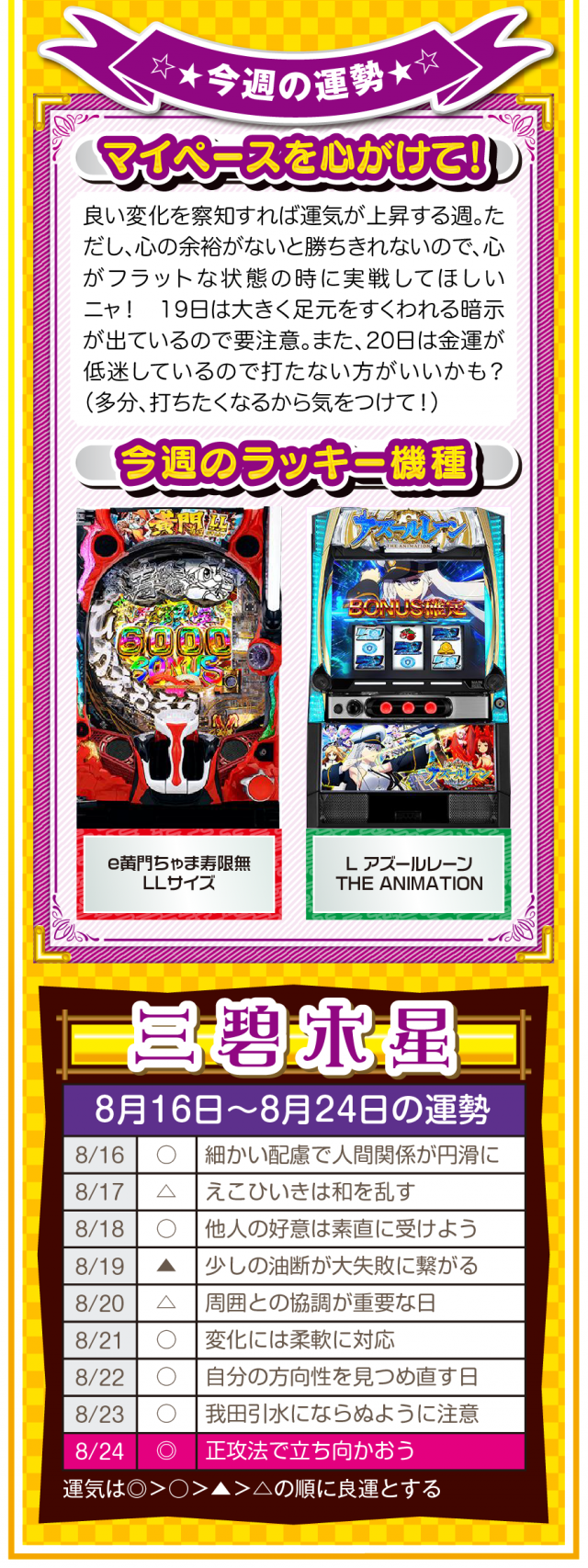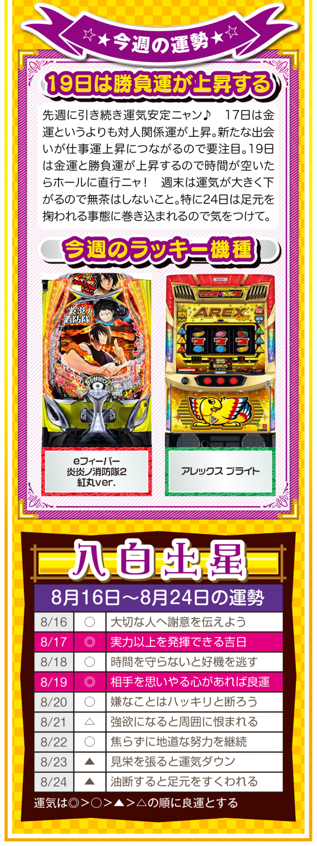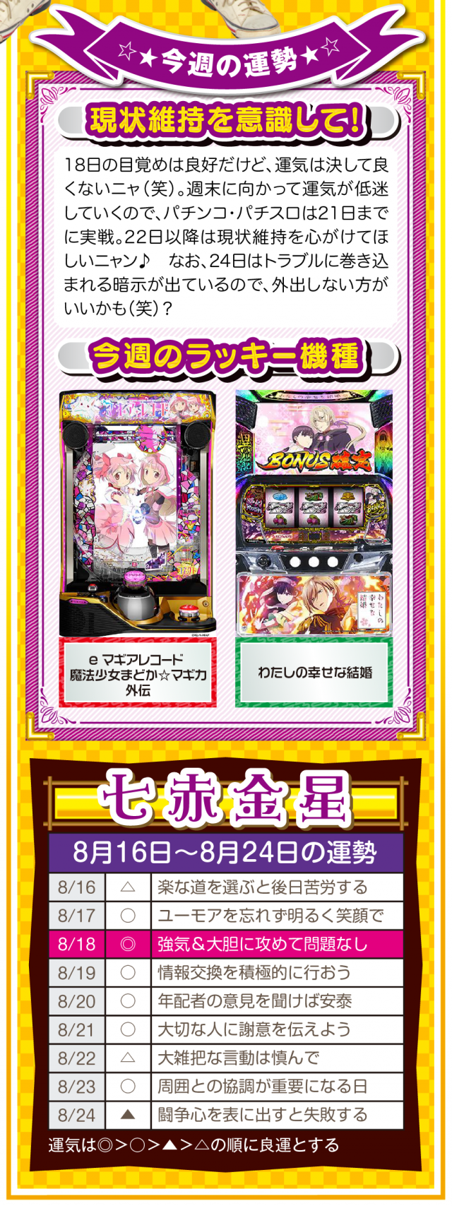 流れが少しでも悪いと思ったら、美意識について考えてみて。それがきっと幸運に繋がる第一歩ニャン♪ というわけで早速、8月18日から8月24日の1週間を鑑定ニャ(無駄毛の処理を面倒と思っているフォー・チュンチュンが、オマケとして8月16日と17日の運勢も鑑定したニャン♡)!
