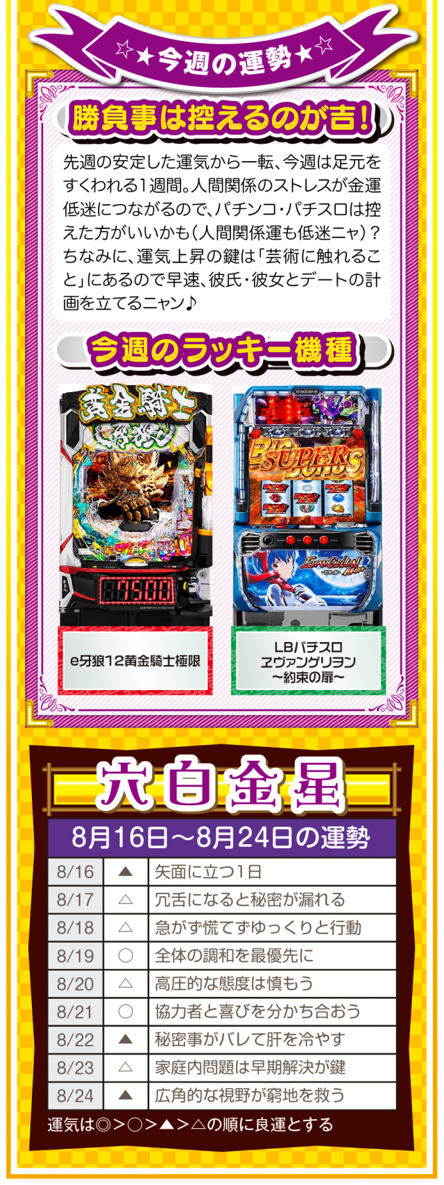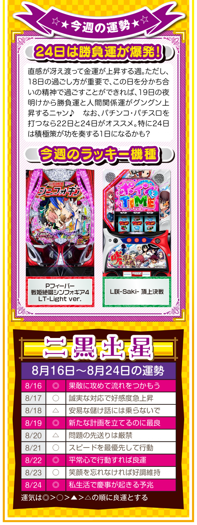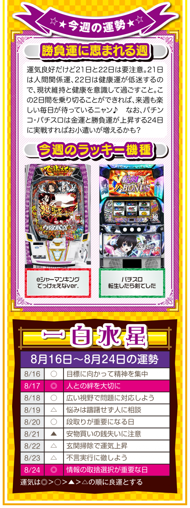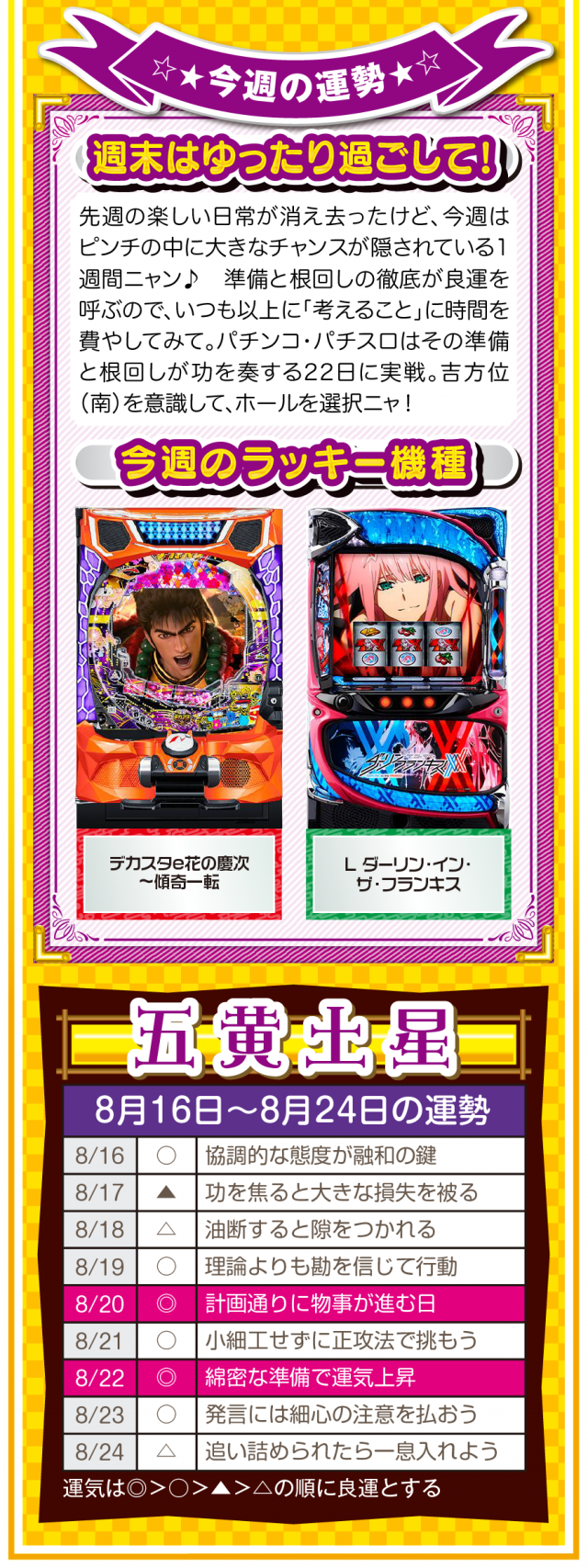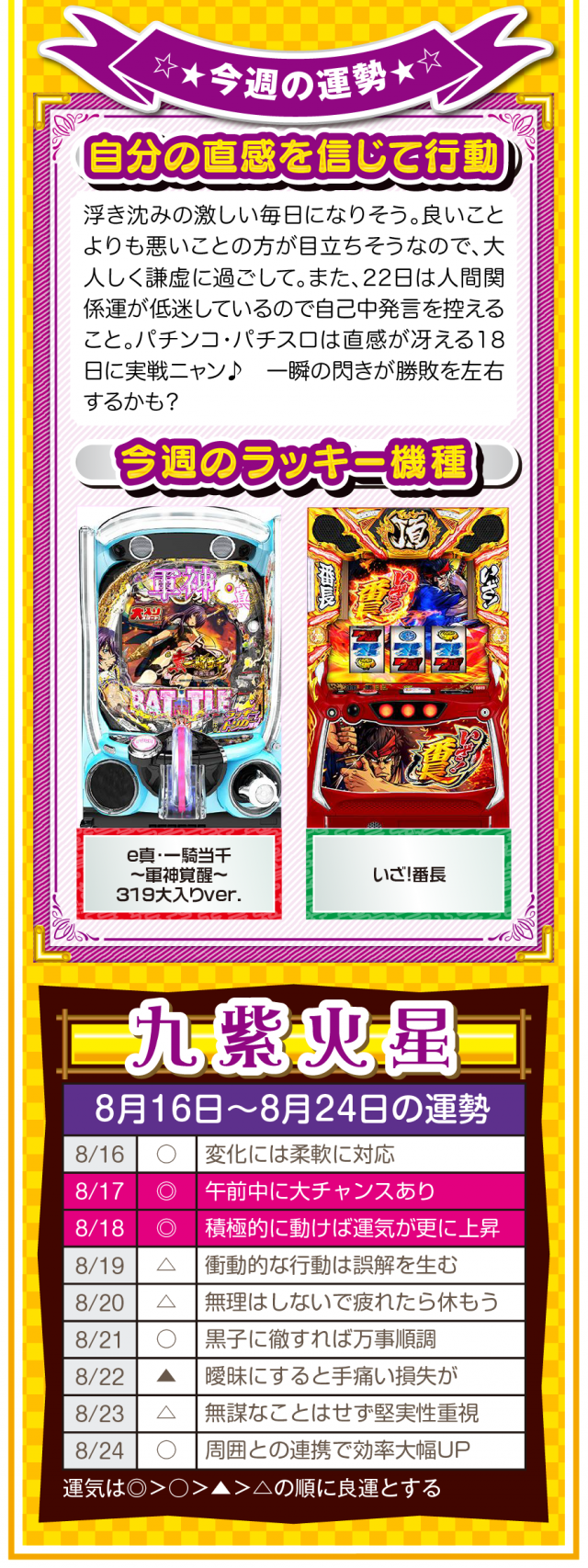 流れが少しでも悪いと思ったら、美意識について考えてみて。それがきっと幸運に繋がる第一歩ニャン♪ というわけで早速、8月18日から8月24日の1週間を鑑定ニャ(無駄毛の処理を面倒と思っているフォー・チュンチュンが、オマケとして8月16日と17日の運勢も鑑定したニャン♡)!