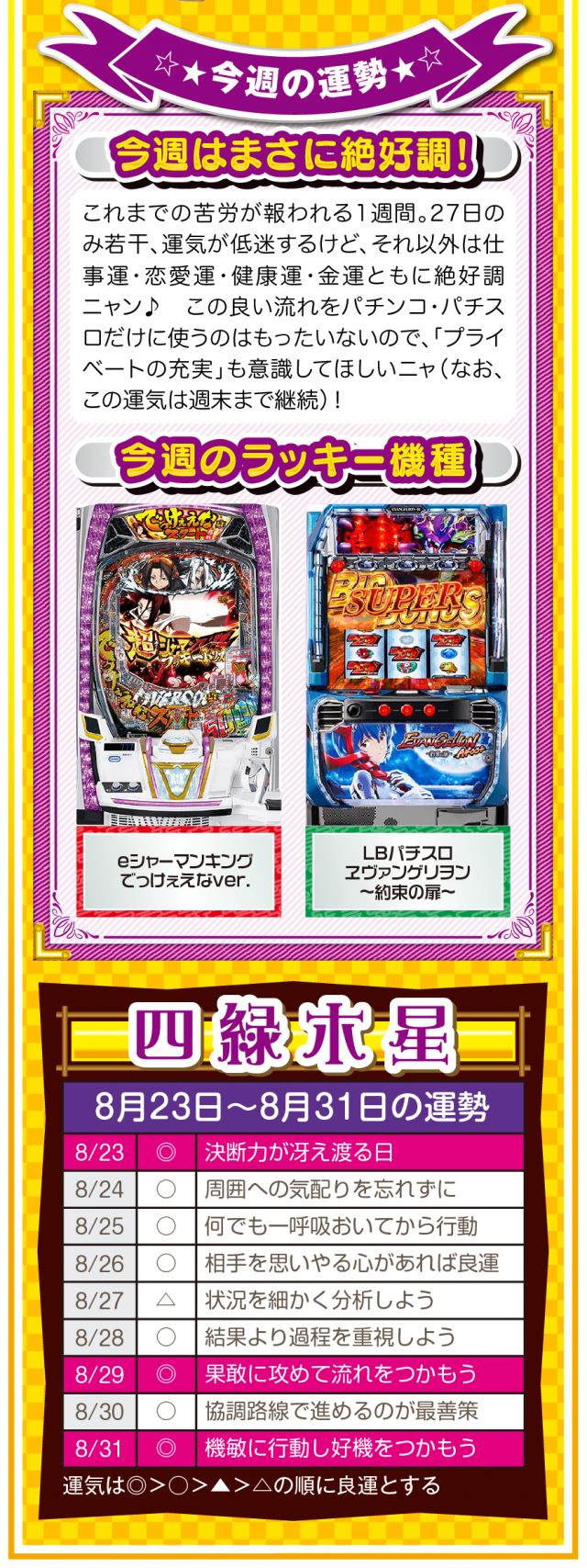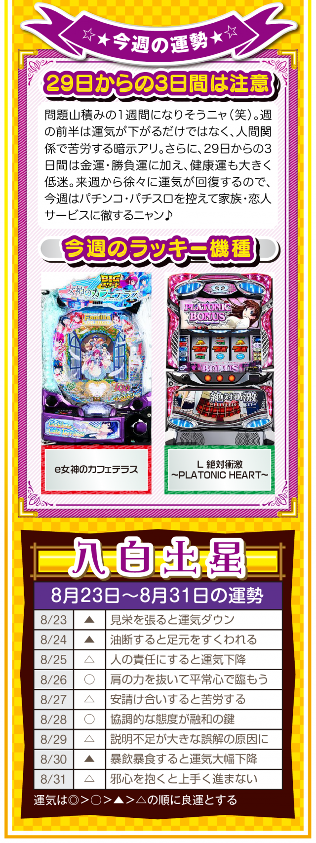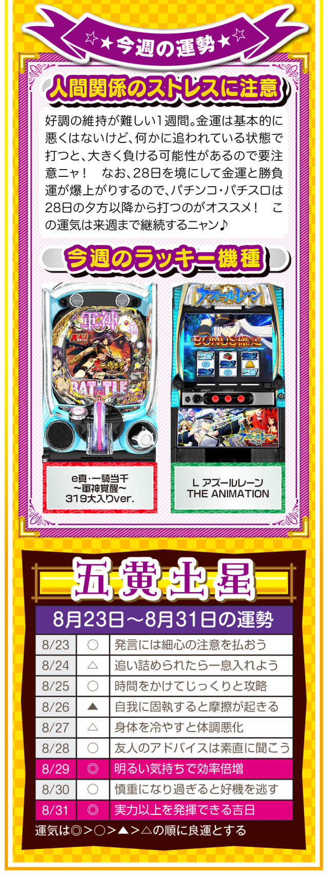 自分を信じて流されれば必ずハッピーが待ち受けることを覚えておいてほしいニャン♪ というわけで早速、8月25日から31日の1週間を鑑定ニャ(甲子園が楽しすぎてお家から一歩も出られないフォー・チュンチュンが、オマケとして8月23日と24日の運勢も鑑定したニャン♡)!