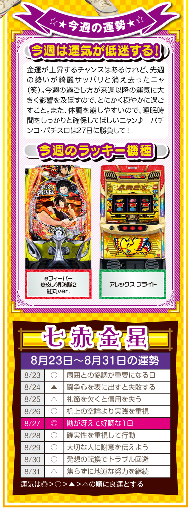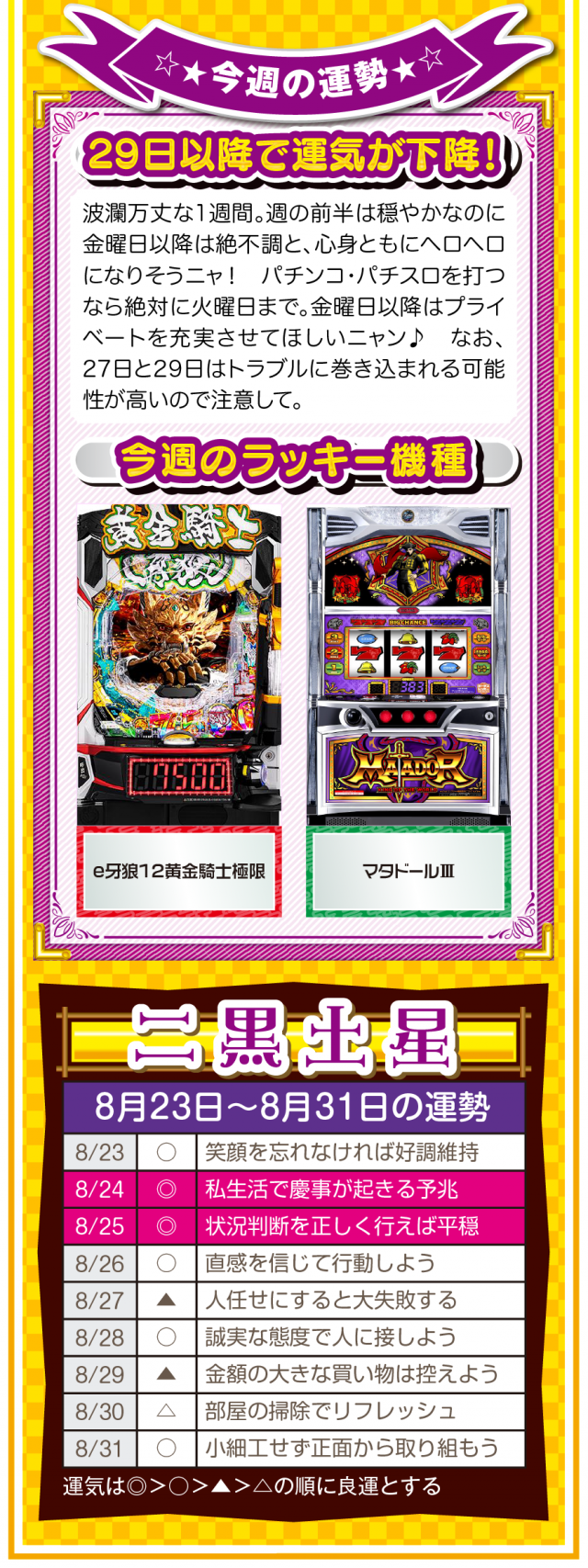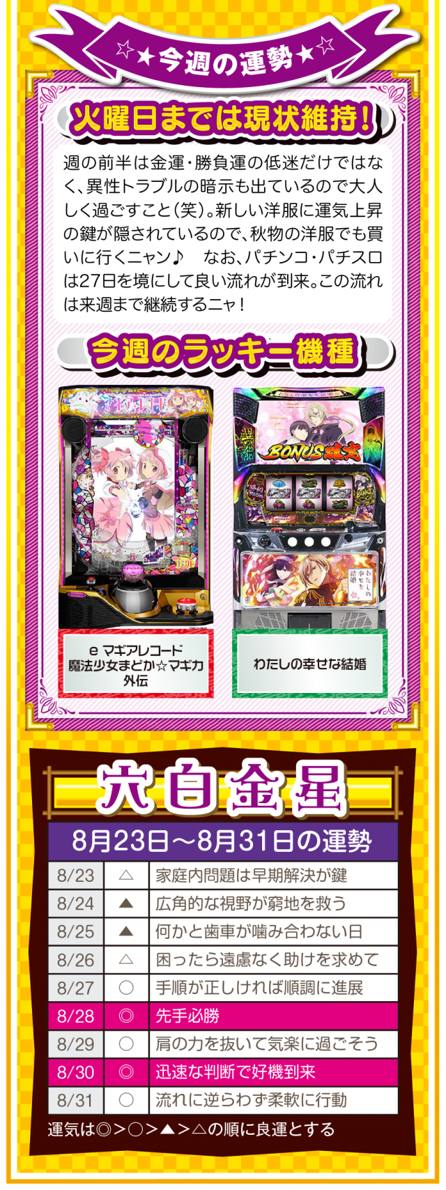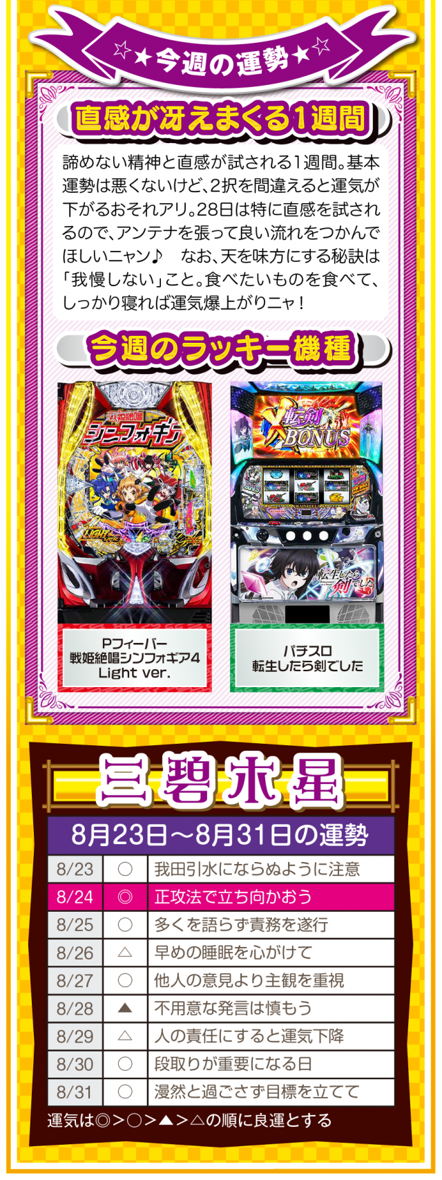自分を信じて流されれば必ずハッピーが待ち受けることを覚えておいてほしいニャン♪ というわけで早速、8月25日から31日の1週間を鑑定ニャ(甲子園が楽しすぎてお家から一歩も出られないフォー・チュンチュンが、オマケとして8月23日と24日の運勢も鑑定したニャン♡)!