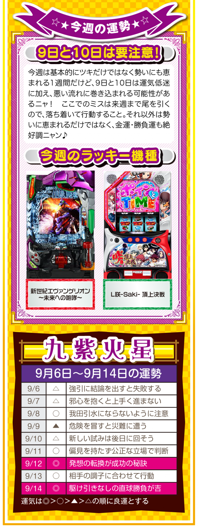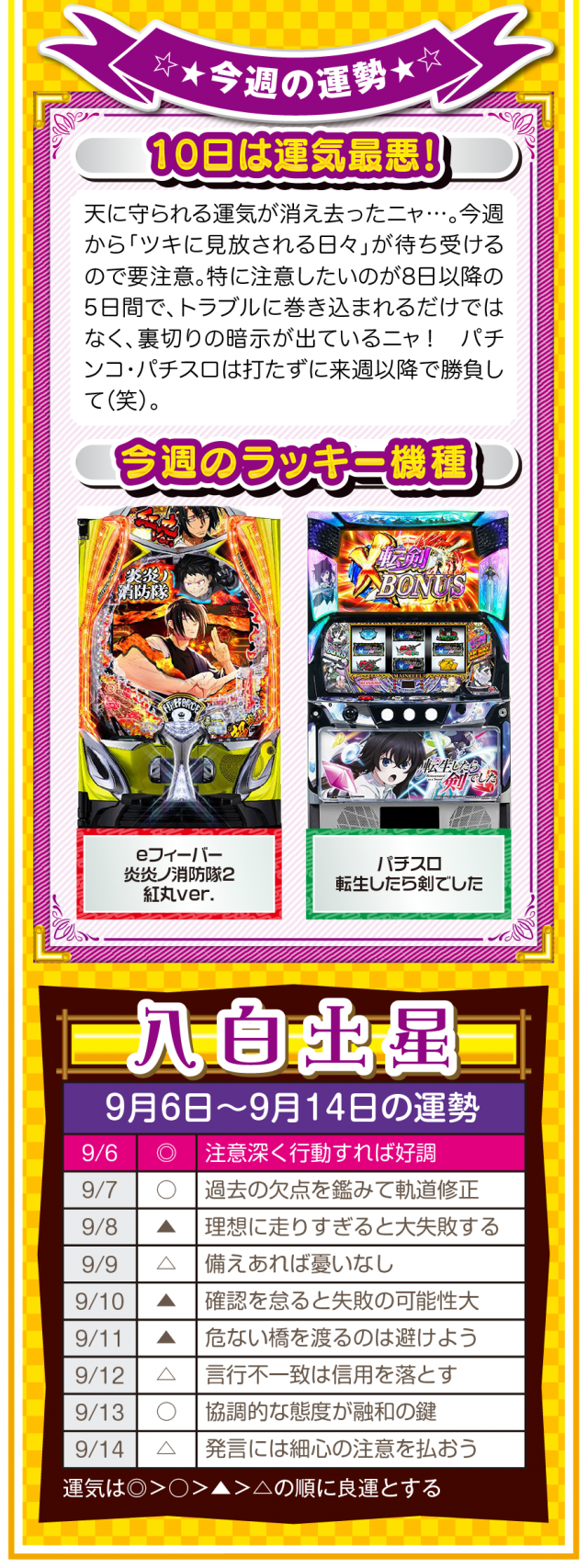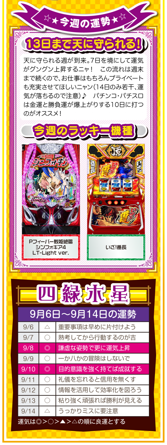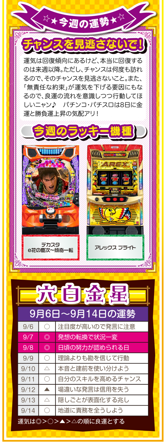 運気の悪い時期に、どれだけ他人に手を差し伸べることが出来るか。その試練を乗り越えた時、運気が大輪の花を咲かせることを覚えておいてほしいニャン♪ というわけで早速、9月8日から14日の1週間を鑑定ニャ(洗濯機と電子レンジが同時に壊れて運気ド低迷のフォー・チュンチュンが、今週もオマケとして6日と7日の運勢も鑑定したニャン♪)!