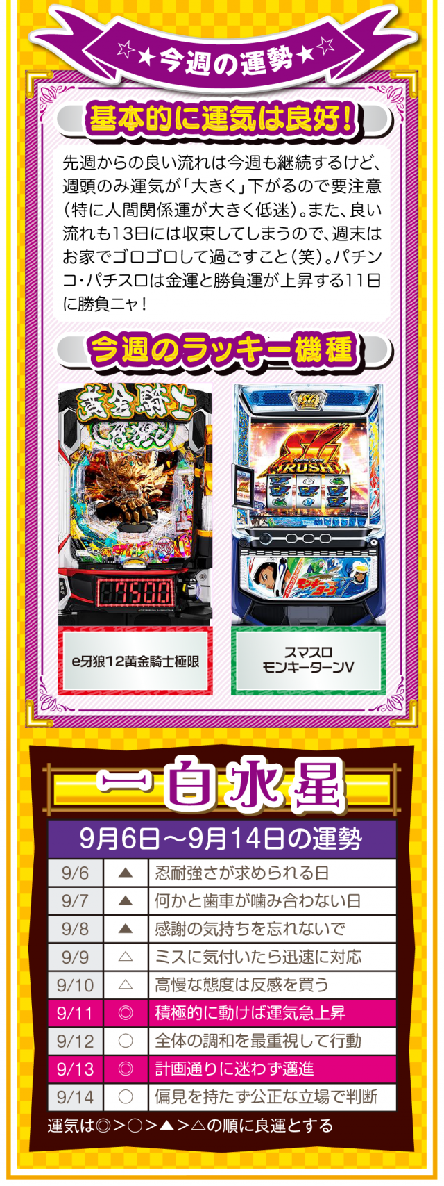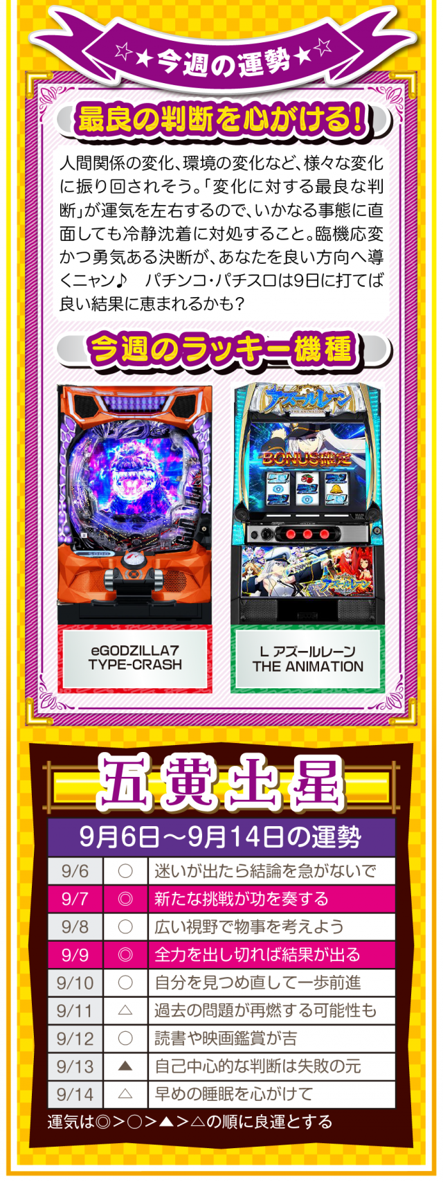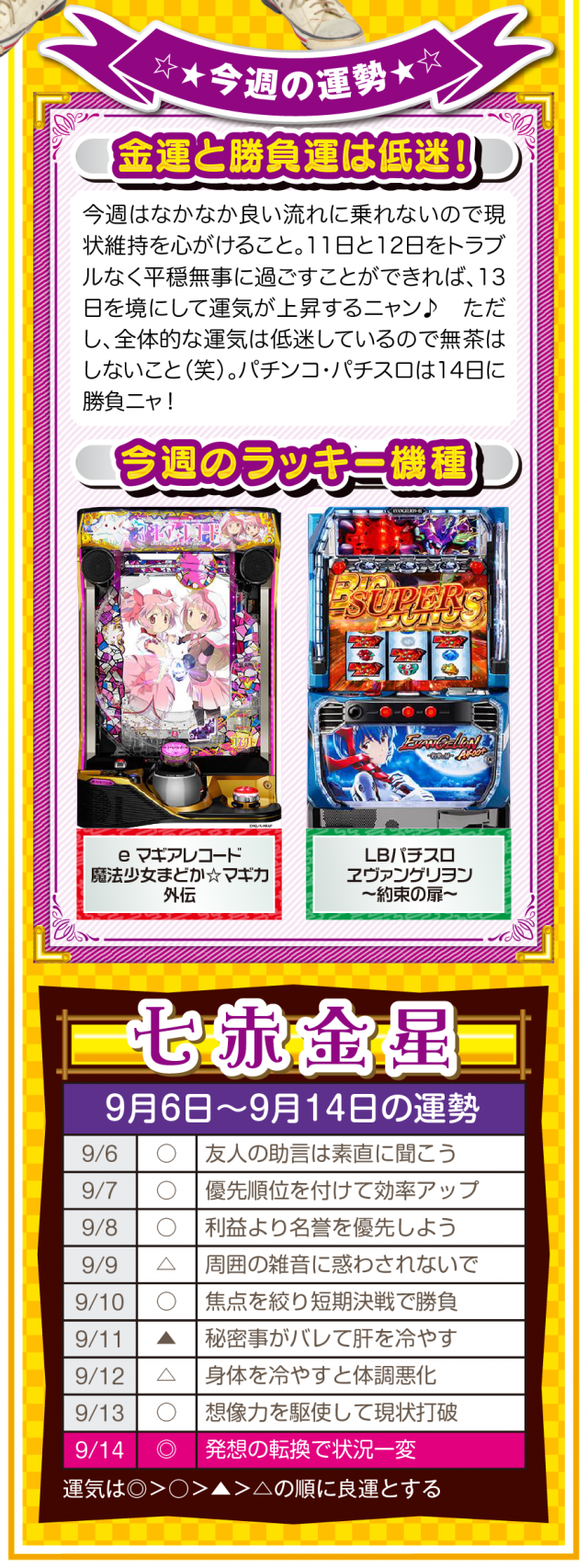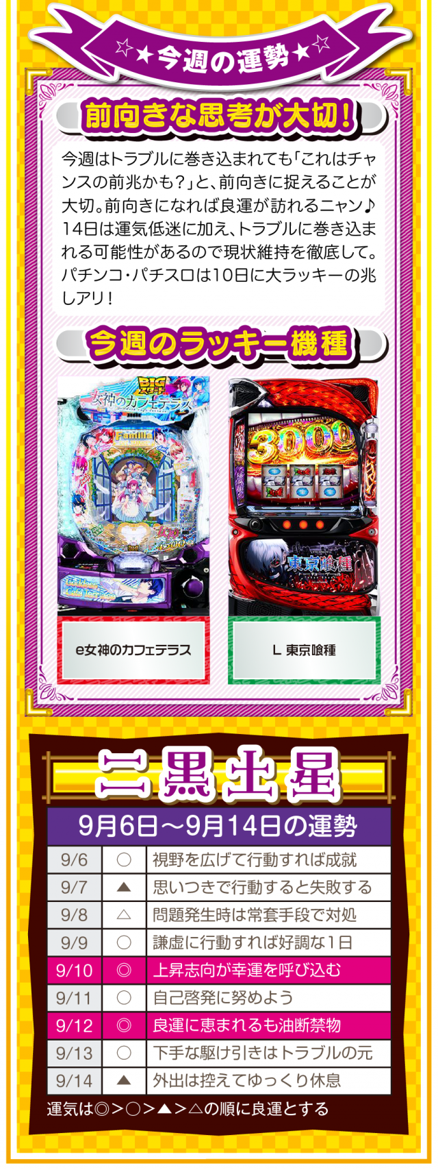 運気の悪い時期に、どれだけ他人に手を差し伸べることが出来るか。その試練を乗り越えた時、運気が大輪の花を咲かせることを覚えておいてほしいニャン♪ というわけで早速、9月8日から14日の1週間を鑑定ニャ(洗濯機と電子レンジが同時に壊れて運気ド低迷のフォー・チュンチュンが、今週もオマケとして6日と7日の運勢も鑑定したニャン♪)!
