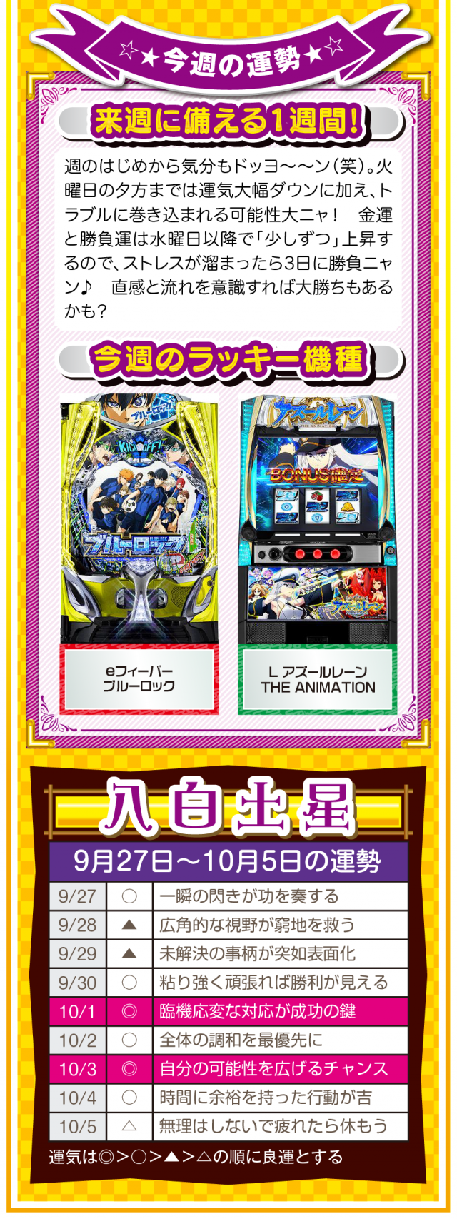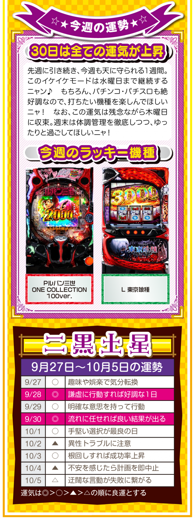 それがきっと未来の「答え合わせ」に繋がることを覚えておいてほしいニャン♪ というわけで早速、9月29日から10月5日の1週間を鑑定ニャ(去年のスプリンターズステークスの大敗をしっかり忘れたフォー・チュンチュンが、今週もオマケとして9月27日と28日の運勢も鑑定したニャン♡)!
