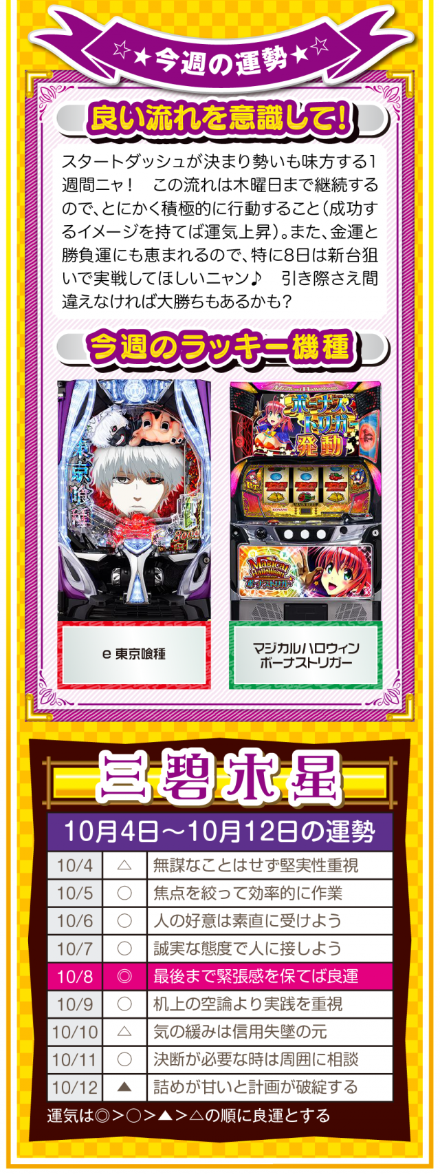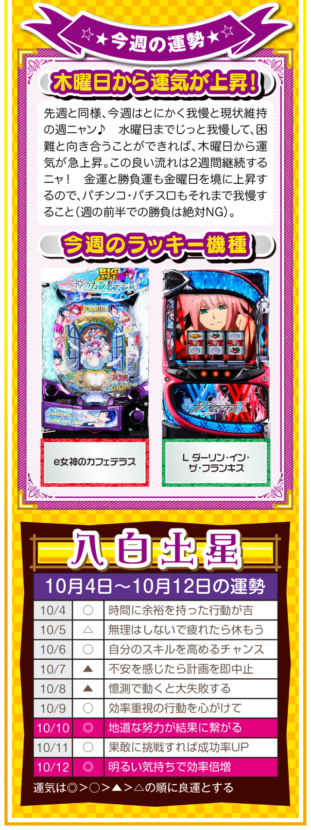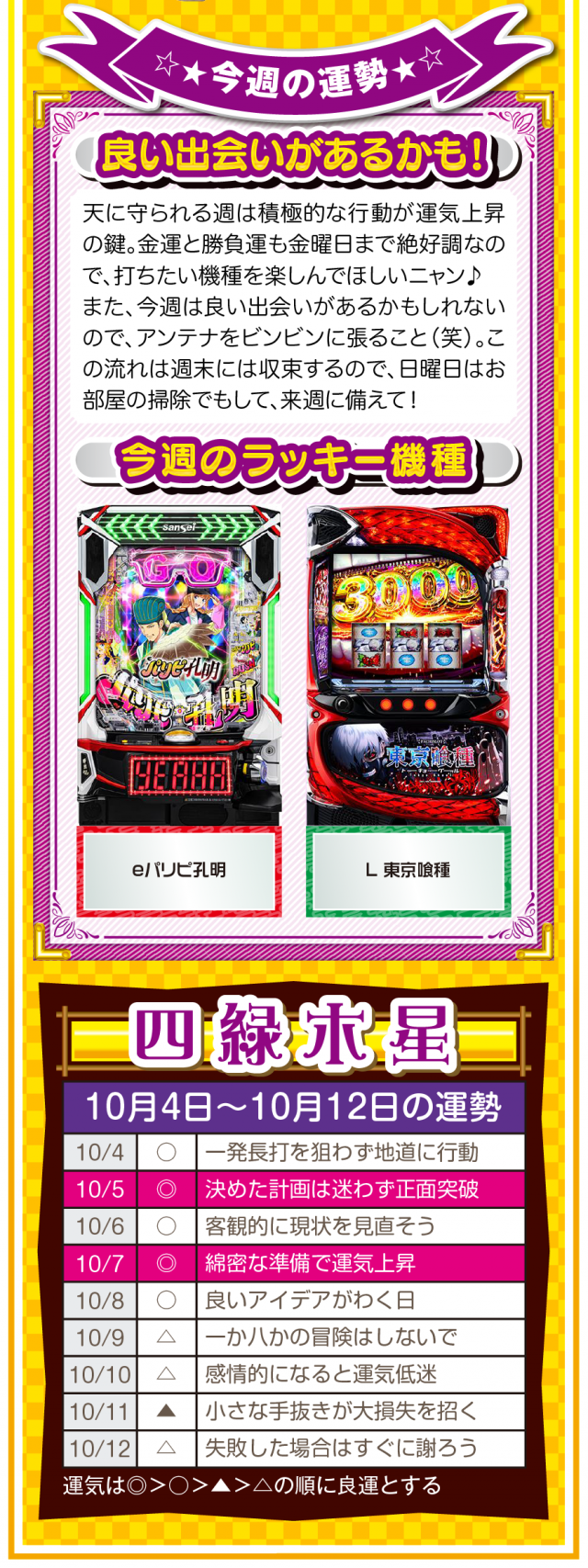 無駄な不幸をなくすためにも、期待することを諦めよう。そして、人間関係の断捨離・デトックスが運気上昇の鍵であることも覚えておいてほしいニャン♪ というわけで早速、10月6日から12日の1週間を鑑定ニャ(人間関係の断捨離をしすぎて友達が1人になったフォー・チュンチュンが、今週もオマケとして4日と5日の運勢も鑑定したニャン♡)!