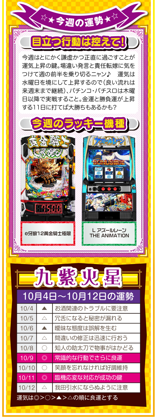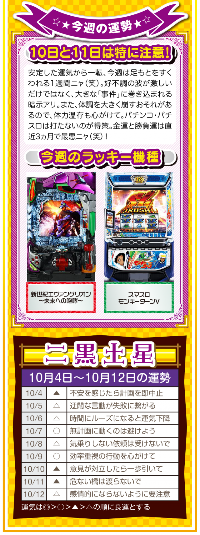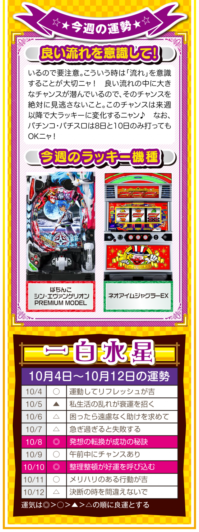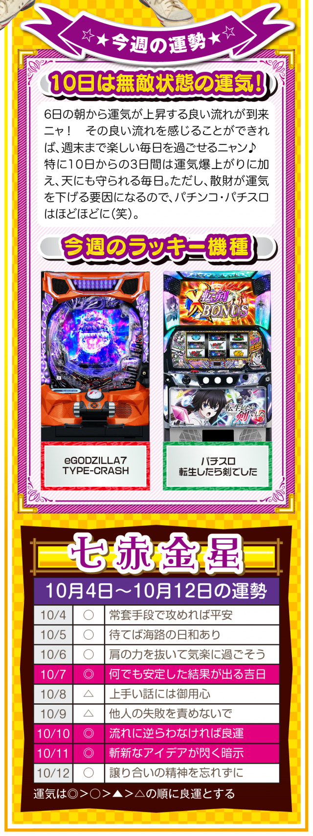 無駄な不幸をなくすためにも、期待することを諦めよう。そして、人間関係の断捨離・デトックスが運気上昇の鍵であることも覚えておいてほしいニャン♪ というわけで早速、10月6日から12日の1週間を鑑定ニャ(人間関係の断捨離をしすぎて友達が1人になったフォー・チュンチュンが、今週もオマケとして4日と5日の運勢も鑑定したニャン♡)!