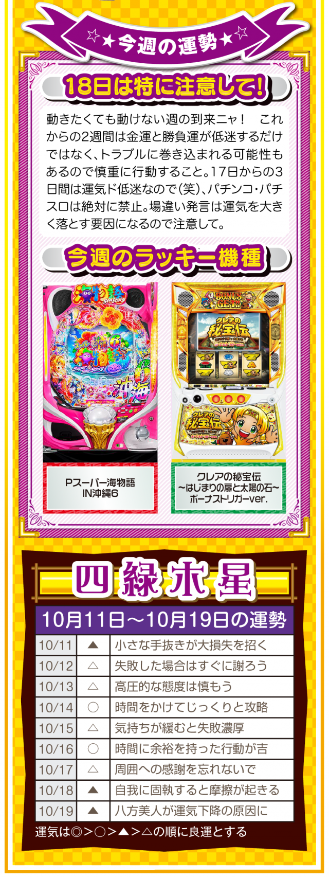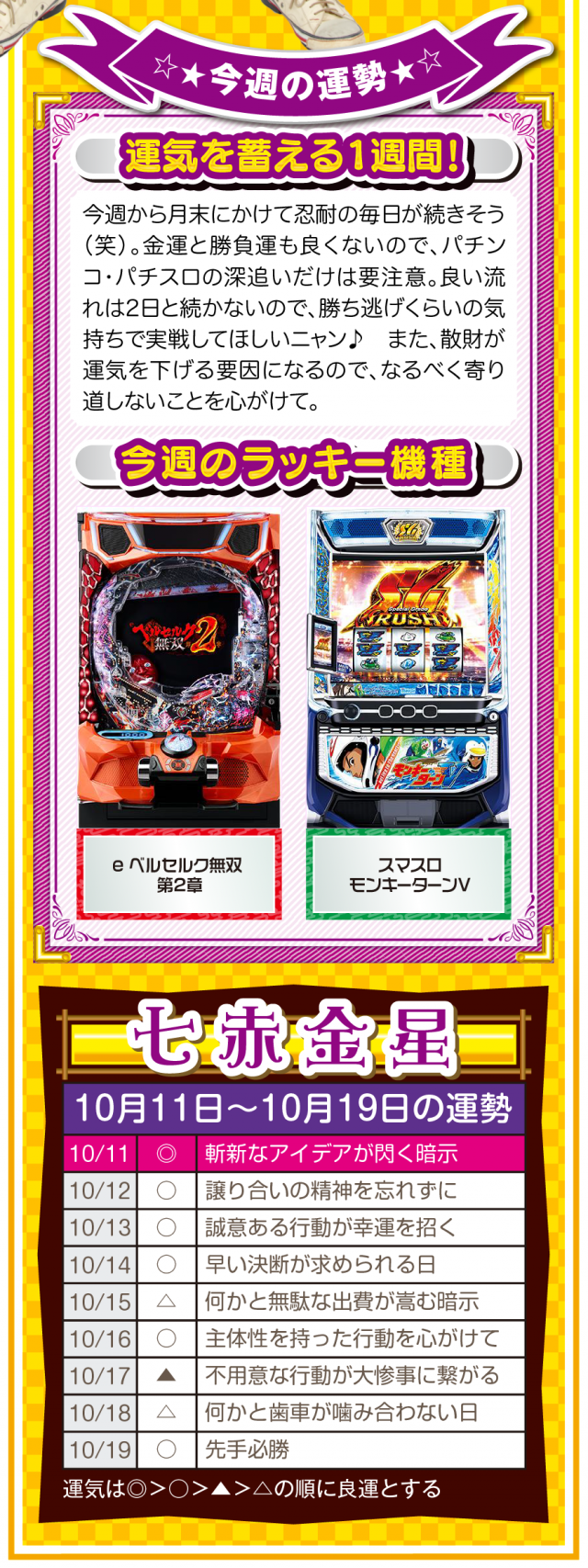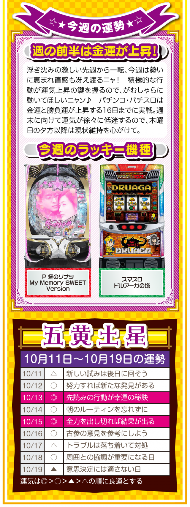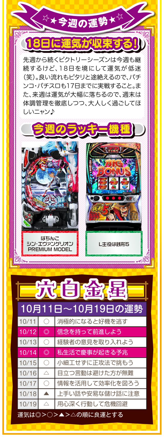 だから、絶対に怠けないこと。楽しむのはいいけれど、目先の快楽に溺れた時点で、幸運から見放されていることを覚えておいてほしいニャン♪ というわけで早速、10月13日から19日の1週間を鑑定ニャ(いい加減、イイ男を捕まえて楽したいフォー・チュンチュンが、今週もオマケとして11日と12日の運勢も鑑定したニャン♡)!