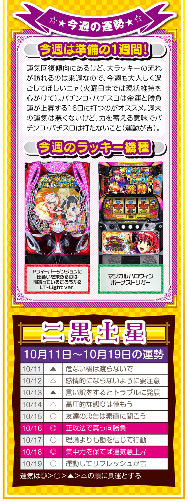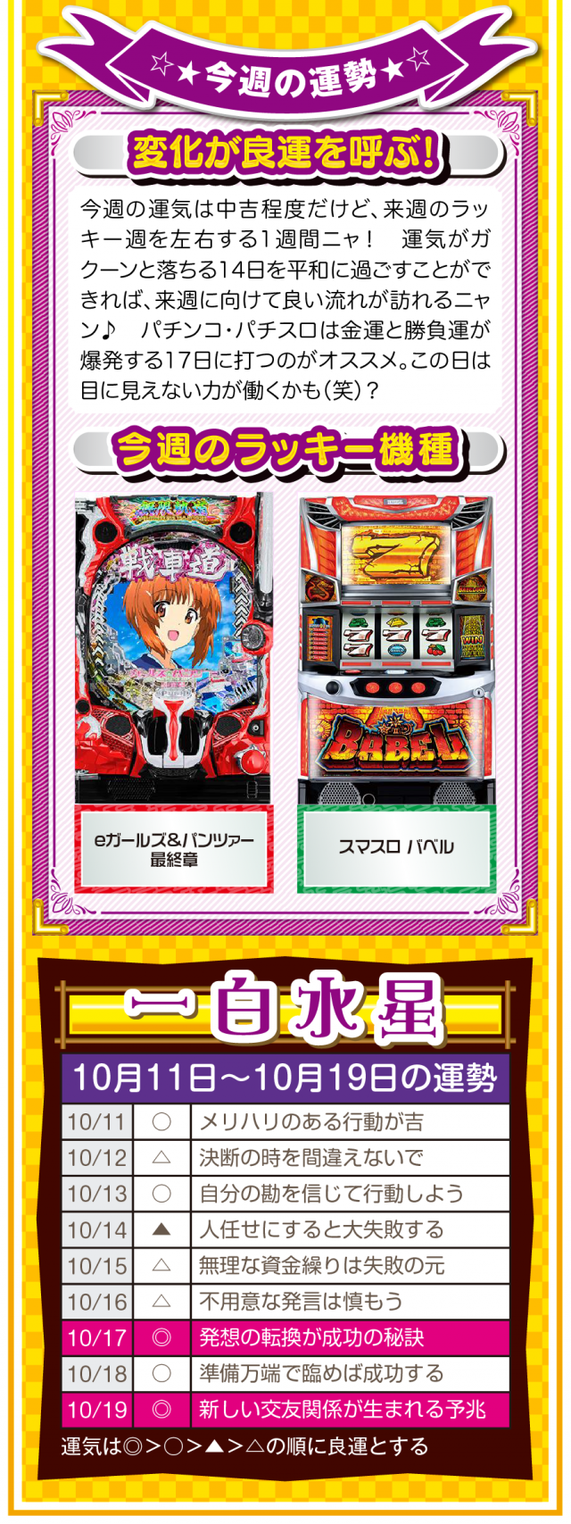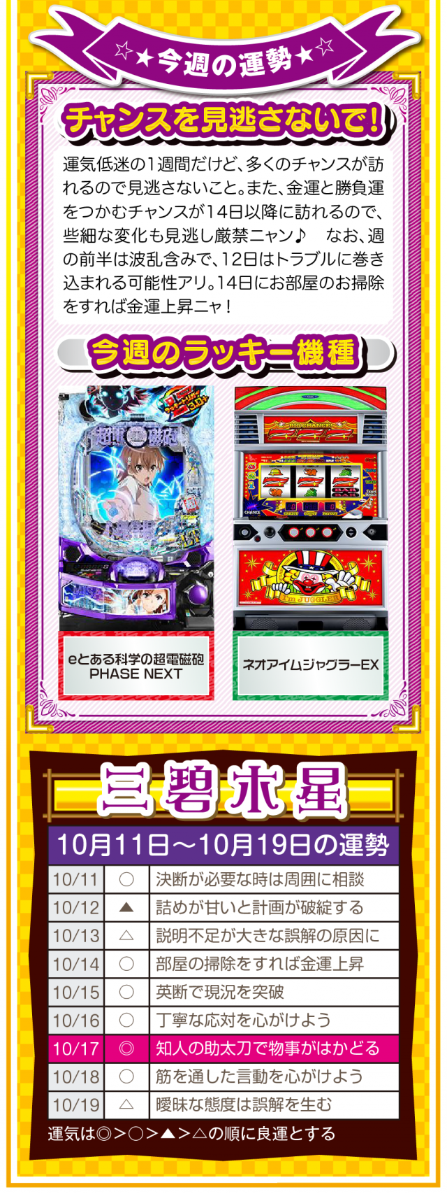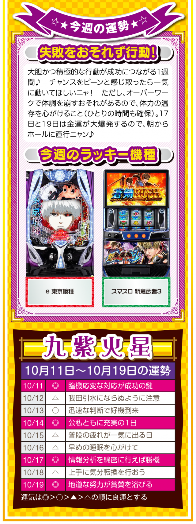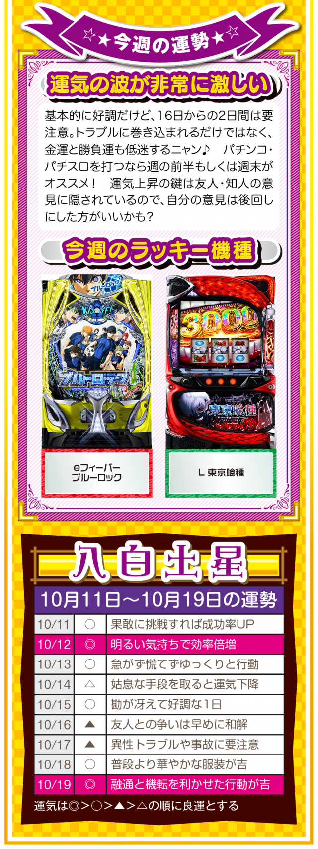 だから、絶対に怠けないこと。楽しむのはいいけれど、目先の快楽に溺れた時点で、幸運から見放されていることを覚えておいてほしいニャン♪ というわけで早速、10月13日から19日の1週間を鑑定ニャ(いい加減、イイ男を捕まえて楽したいフォー・チュンチュンが、今週もオマケとして11日と12日の運勢も鑑定したニャン♡)!