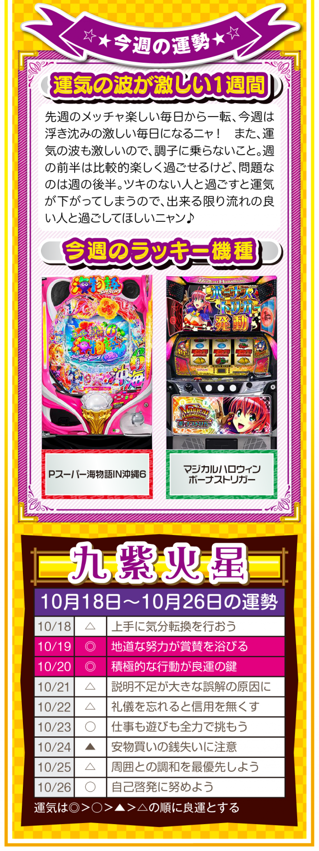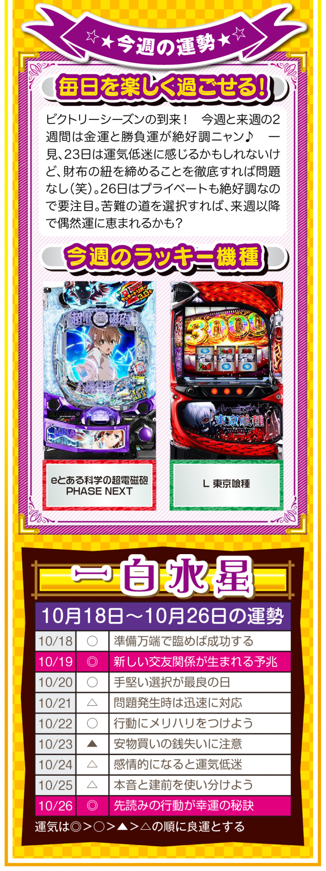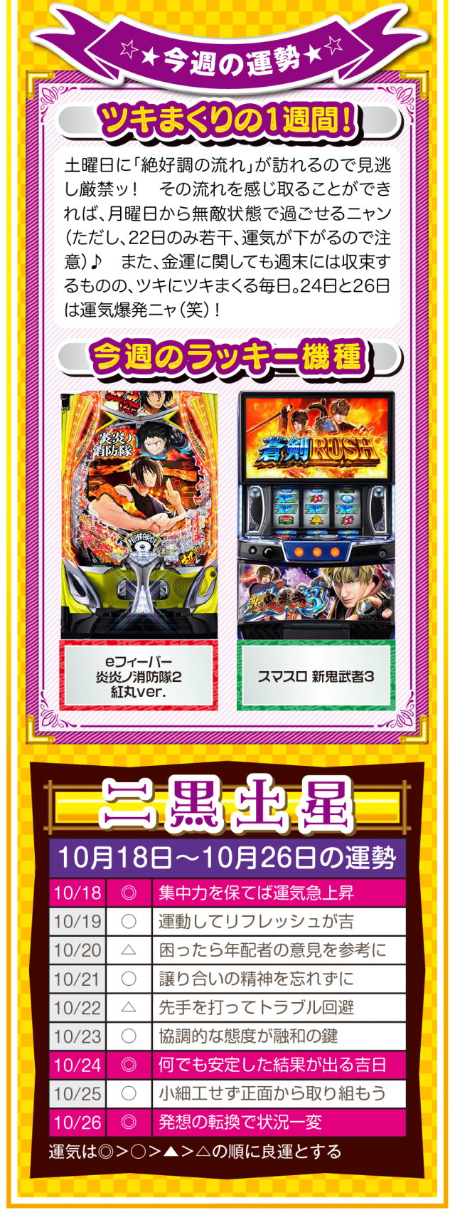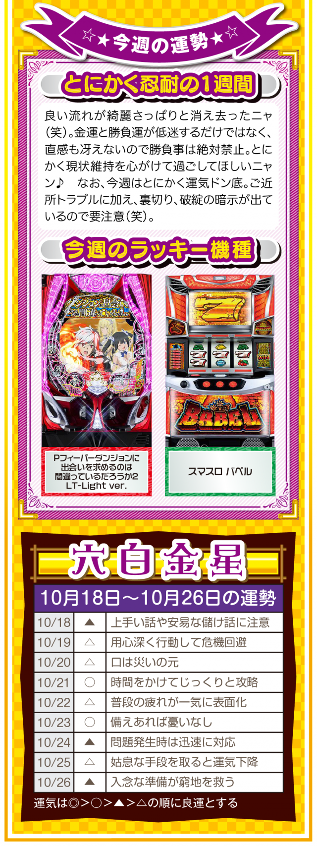 自分勝手に生きると、自分勝手に不幸になる。「矢印」を外に向けて、今日も明日も感謝される生き方を意識してほしいニャン♪ というわけで早速、10月20日から26日の1週間を鑑定ニャ(婚活に矢印を向けまくっているフォー・チュンチュンが、今週もオマケとして18日と19日の運勢も鑑定したニャン♡)!
