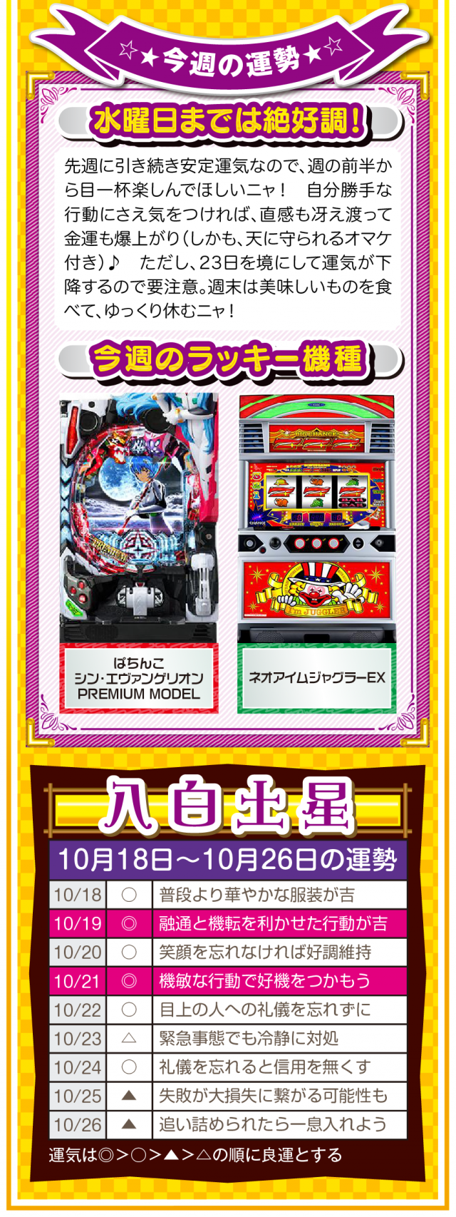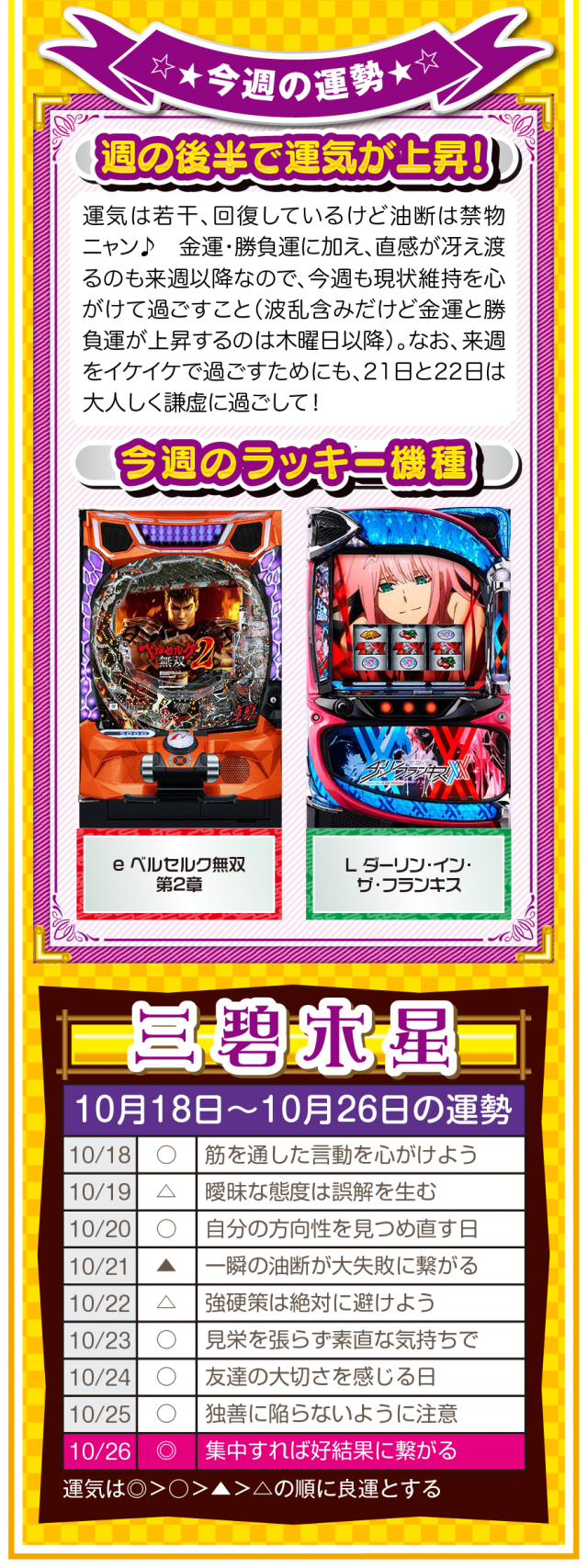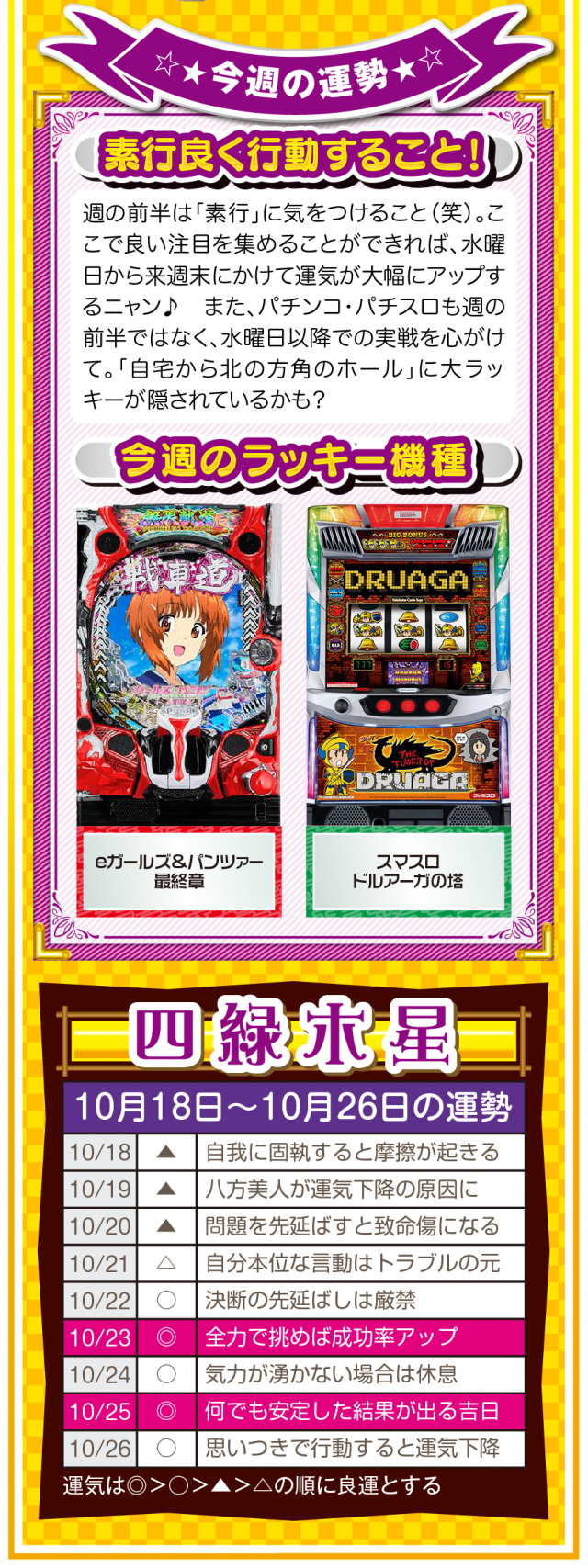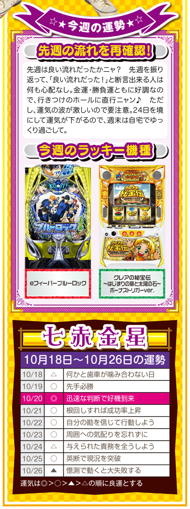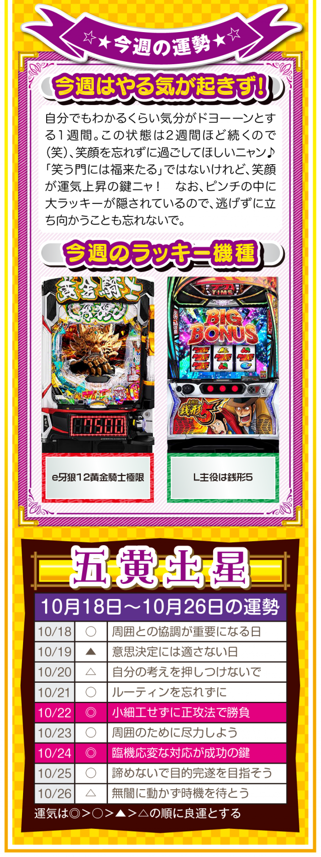 自分勝手に生きると、自分勝手に不幸になる。「矢印」を外に向けて、今日も明日も感謝される生き方を意識してほしいニャン♪ というわけで早速、10月20日から26日の1週間を鑑定ニャ(婚活に矢印を向けまくっているフォー・チュンチュンが、今週もオマケとして18日と19日の運勢も鑑定したニャン♡)!