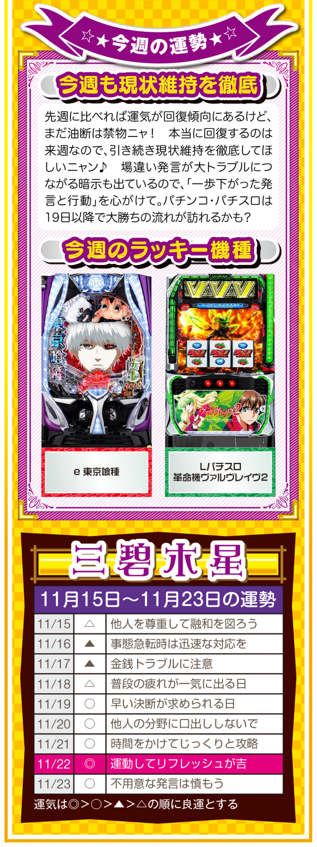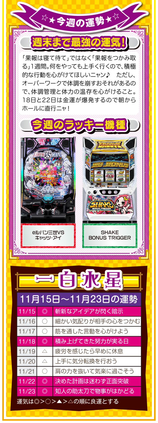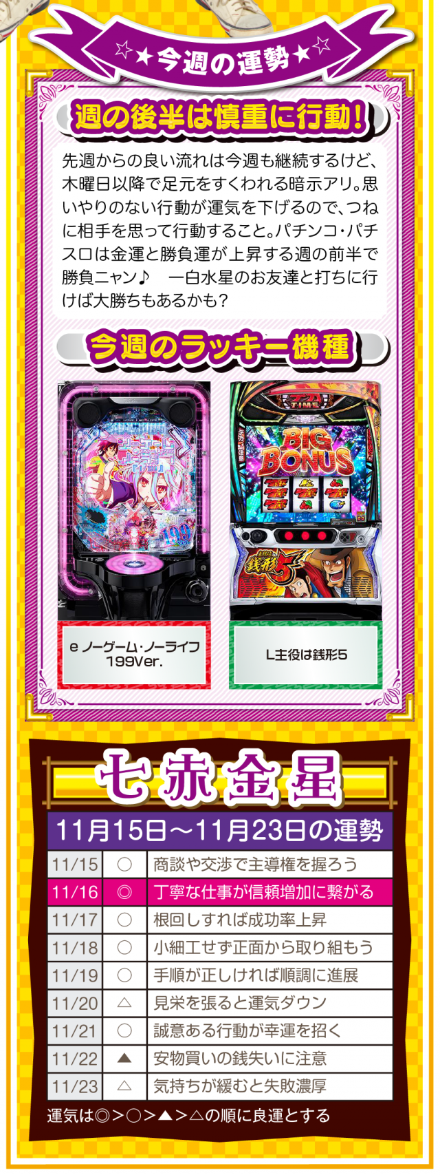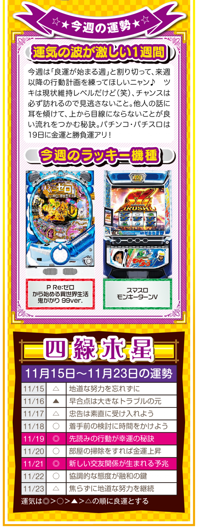鬱々とした気分の時は、その「グレーな気分」を楽しむ。視野と考え方を変えれば、人生はとても簡単に幸せを感じられることを覚えておいてほしいニャ! というわけで早速、11月17日から23日の1週間を鑑定ニャン(「それでも自堕落最高!」と思うフォー・チュンチュンが、オマケとして11月15日と16日の運勢も鑑定したニャ!)♪