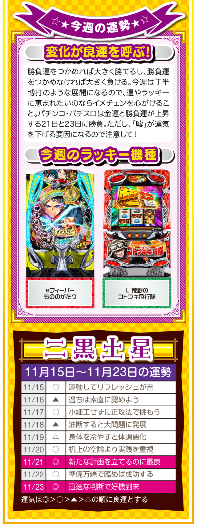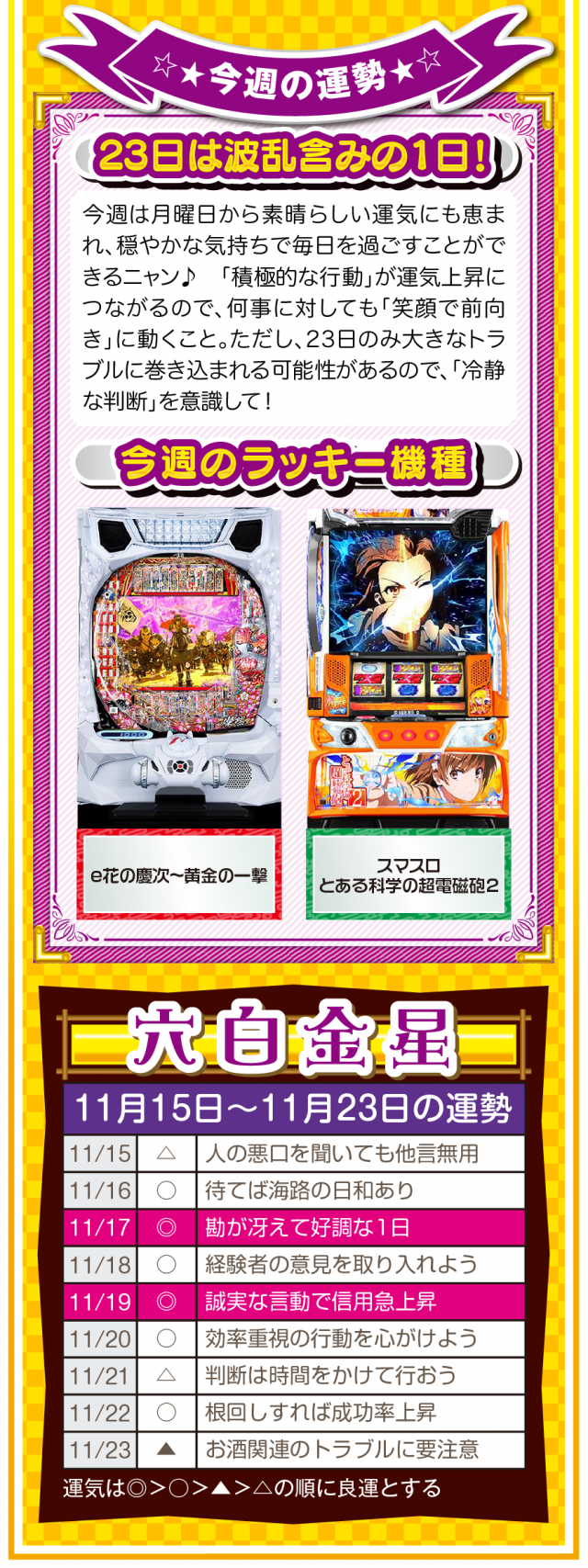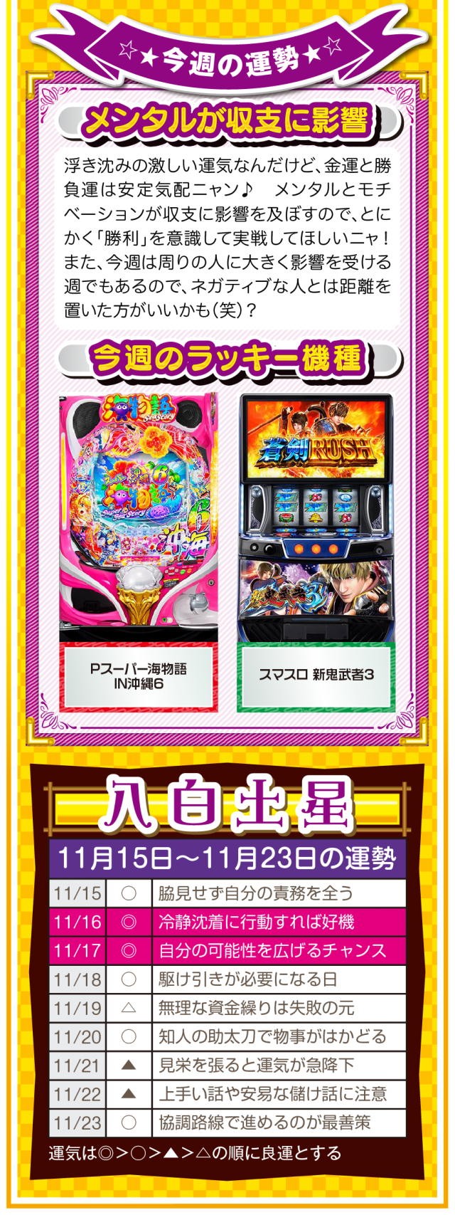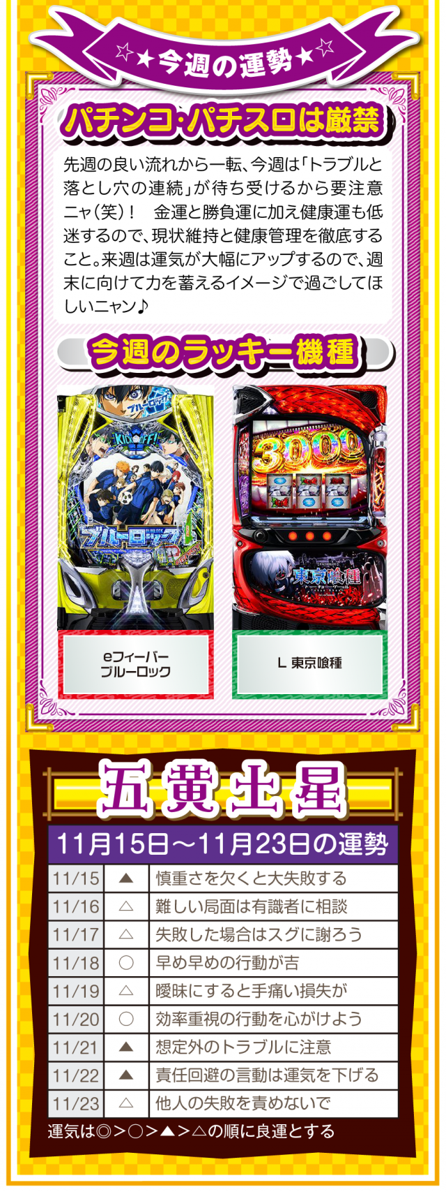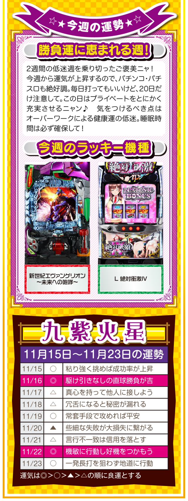 鬱々とした気分の時は、その「グレーな気分」を楽しむ。視野と考え方を変えれば、人生はとても簡単に幸せを感じられることを覚えておいてほしいニャ! というわけで早速、11月17日から23日の1週間を鑑定ニャン(「それでも自堕落最高!」と思うフォー・チュンチュンが、オマケとして11月15日と16日の運勢も鑑定したニャ!)♪