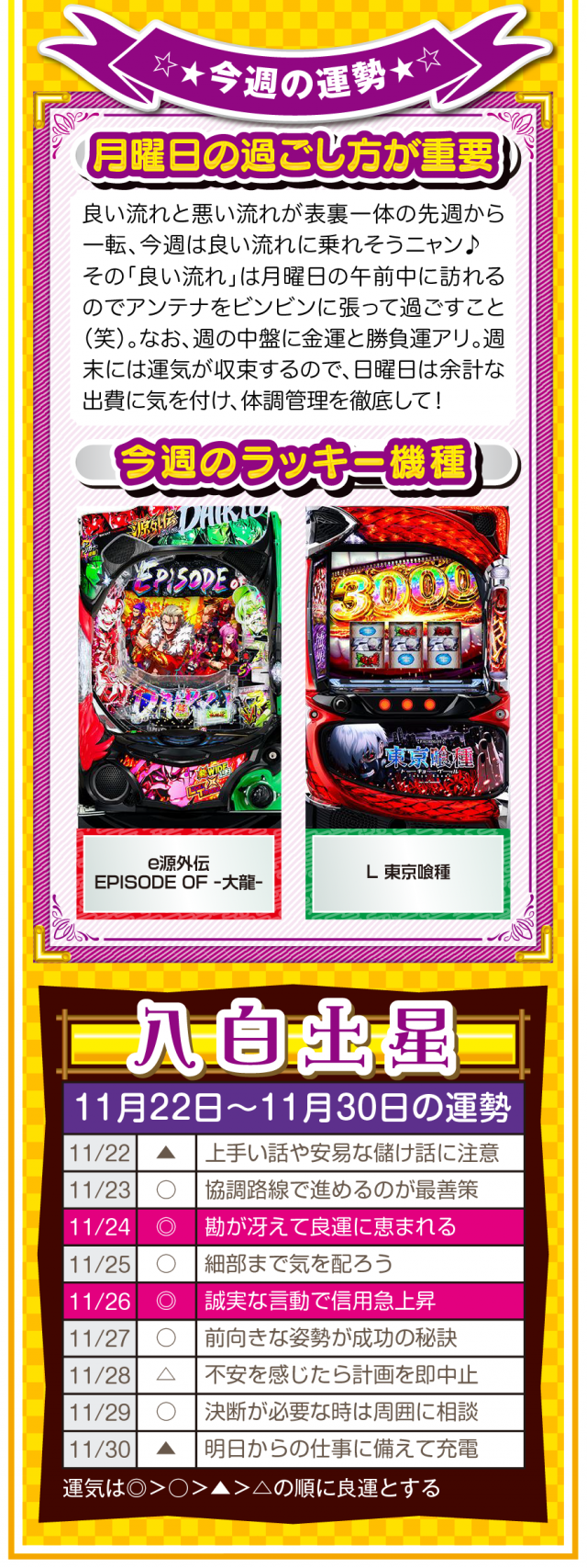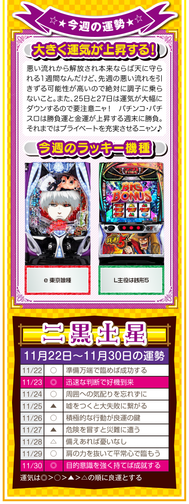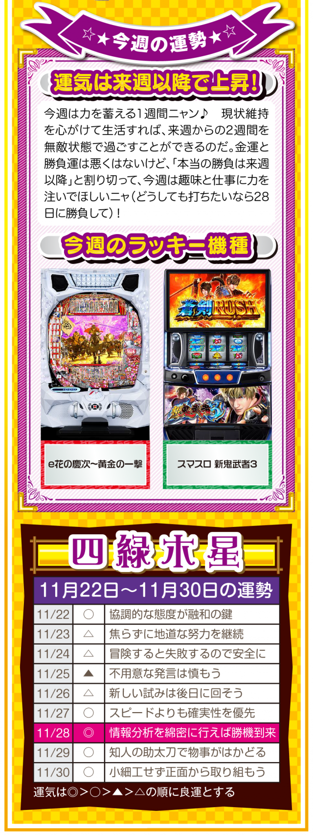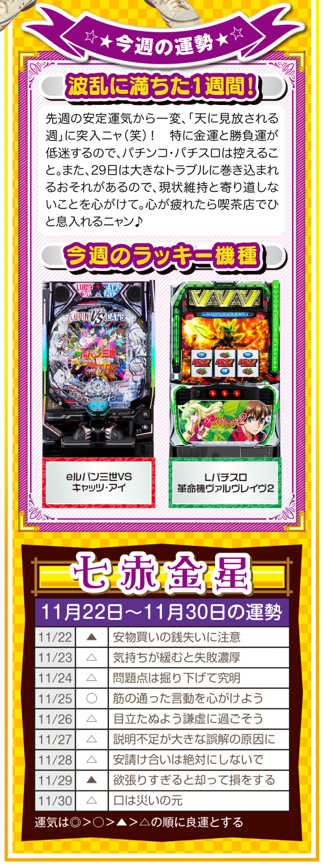 人間関係の断捨離は賢く生きるため、そして自分自身を成長させるための手段ということを覚えておいてほしいニャン♪ というわけで早速、11月24日から30日の1週間を鑑定ニャ(マイルCSはジャンタルマンタルをド本命にするフォー・チュンチュンが、オマケとして11月22日と23日の運勢も鑑定したニャン♡)!
