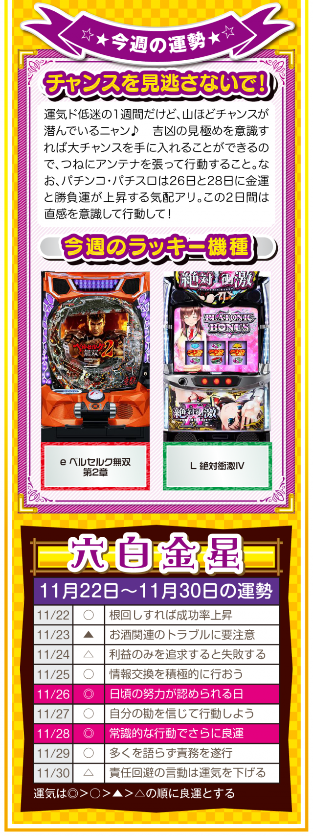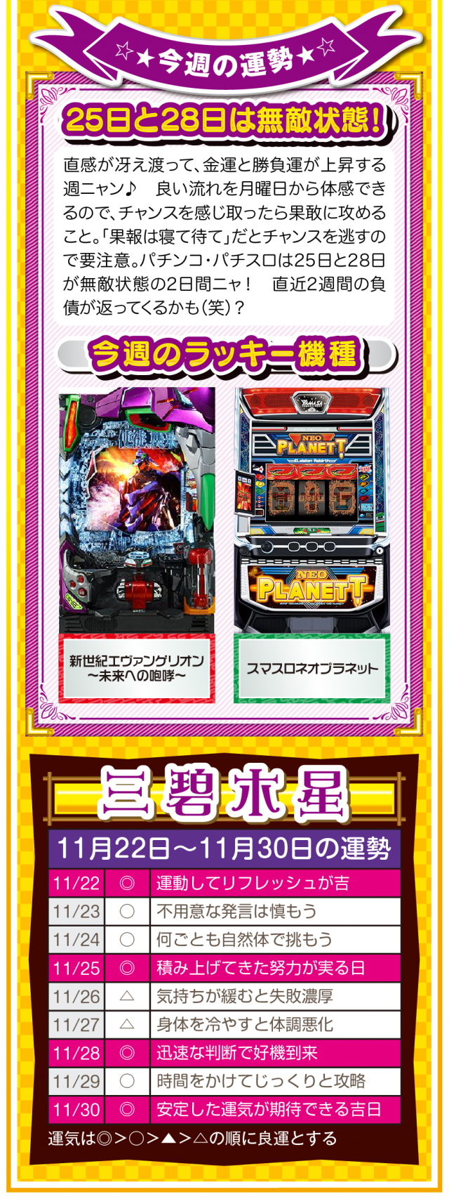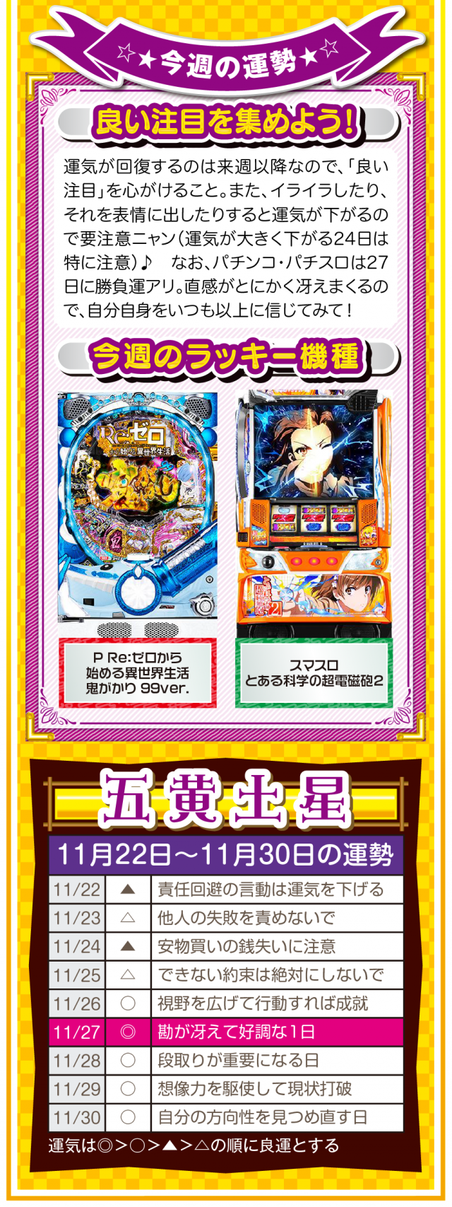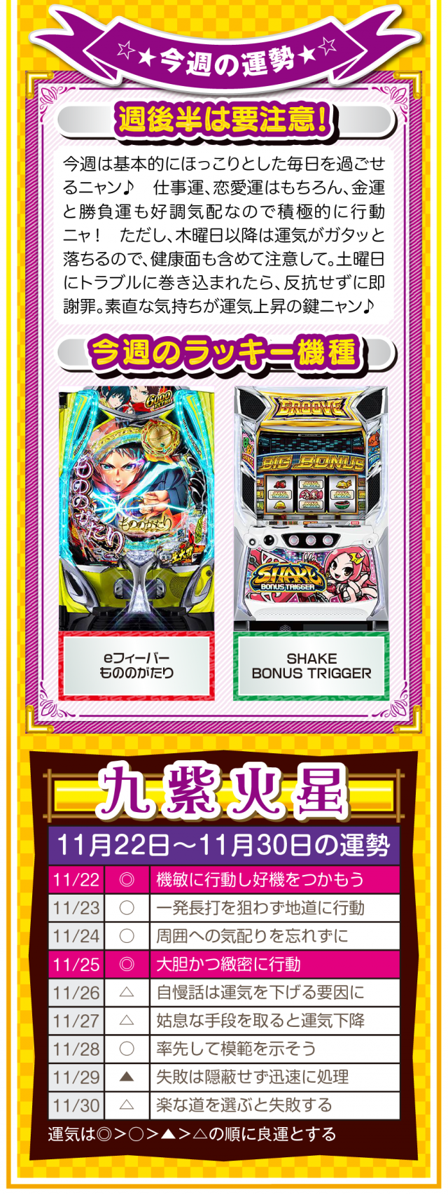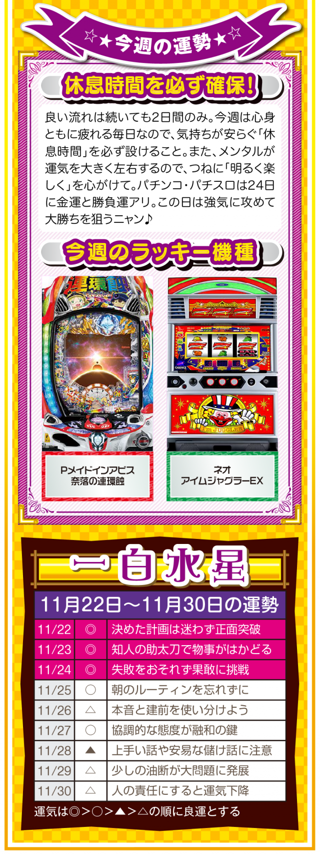 人間関係の断捨離は賢く生きるため、そして自分自身を成長させるための手段ということを覚えておいてほしいニャン♪ というわけで早速、11月24日から30日の1週間を鑑定ニャ(マイルCSはジャンタルマンタルをド本命にするフォー・チュンチュンが、オマケとして11月22日と23日の運勢も鑑定したニャン♡)!