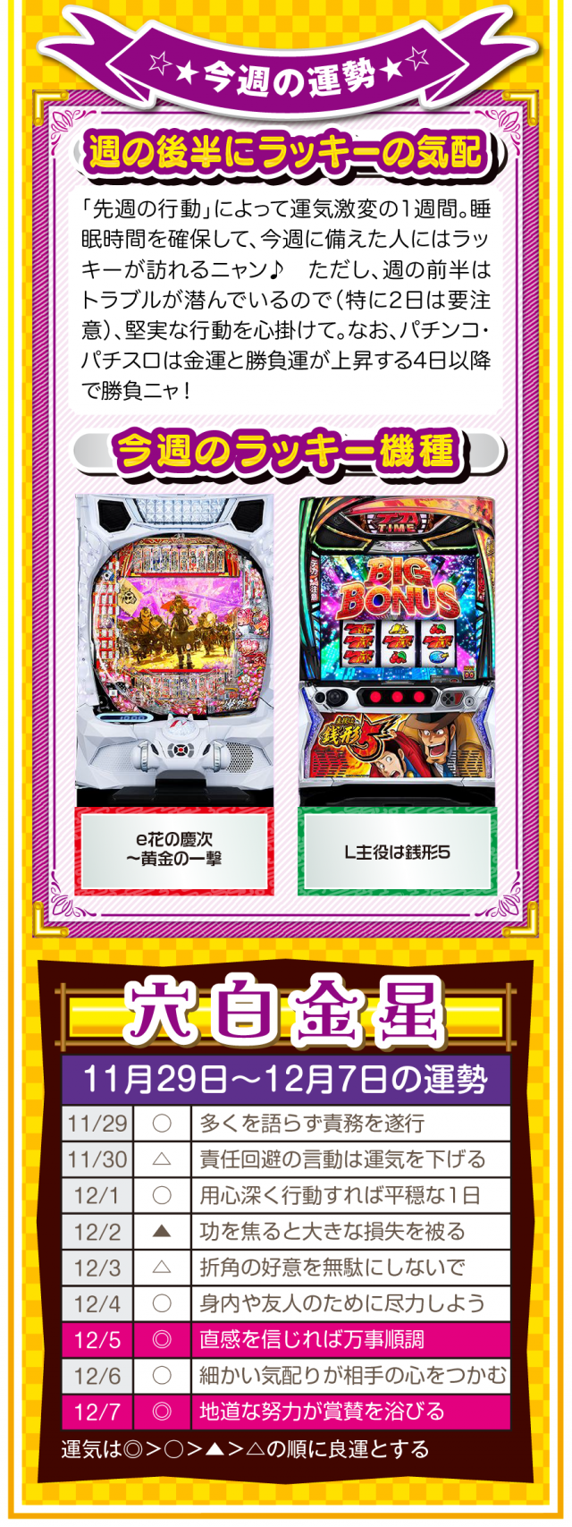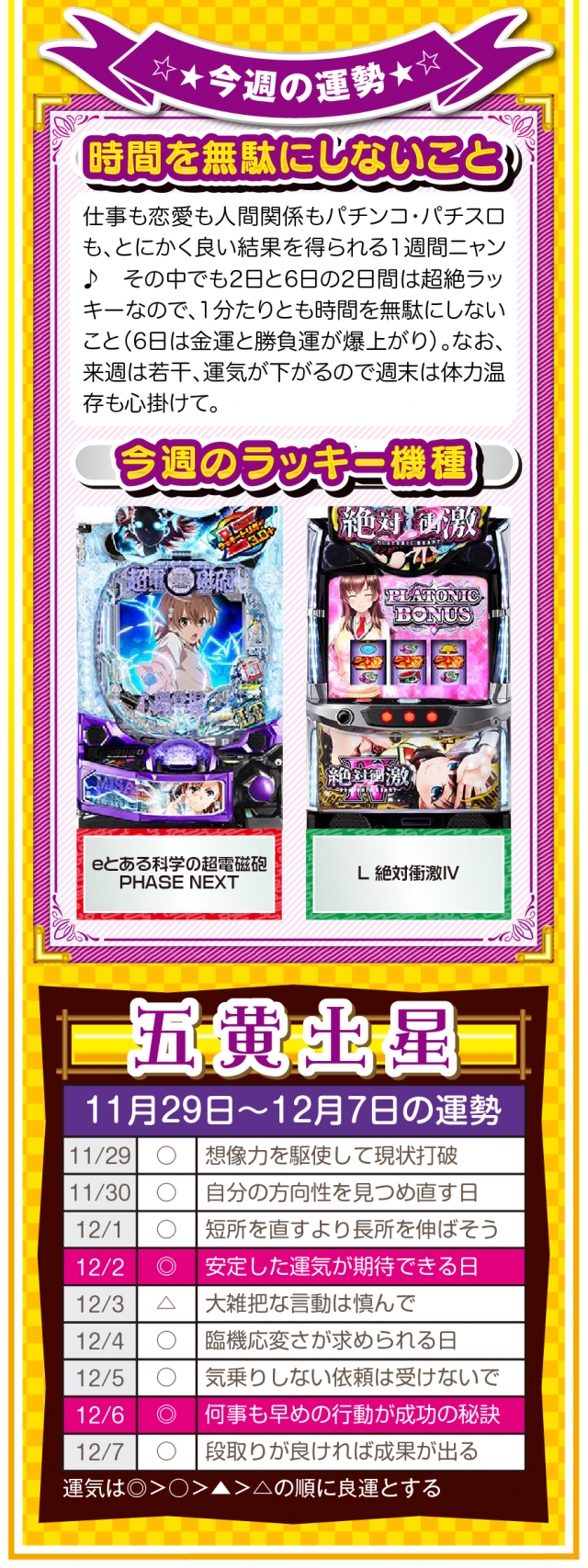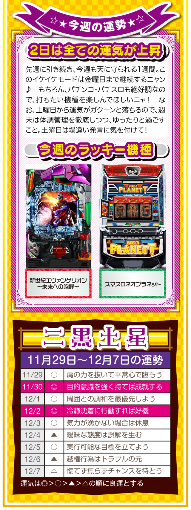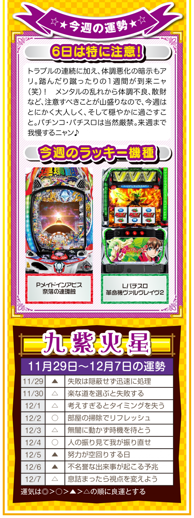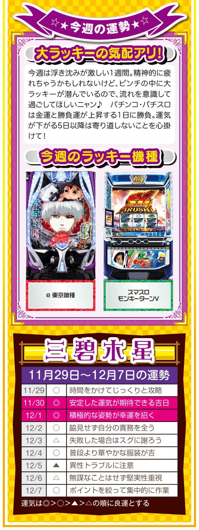 視点が変われば世界も変わるし、不満もチャンスに変化を遂げる。ちょっとした軌道修正が運気を大きく左右することを覚えておいてほしいニャン♪ というわけで早速、12月1日から7日の1週間を鑑定ニャ(常に自分が正義のフォー・チュンチュンが、オマケとして11月29日と30日の運勢も鑑定したニャン♡)!