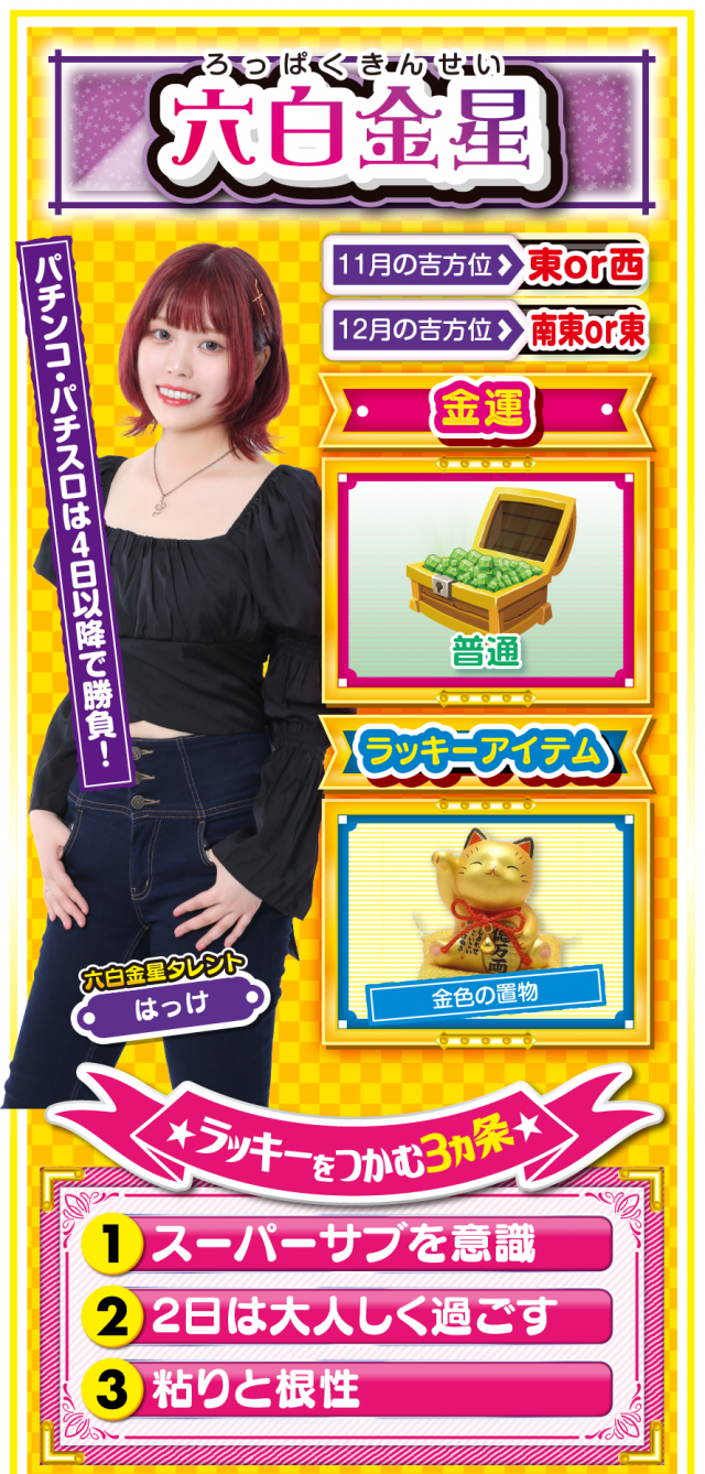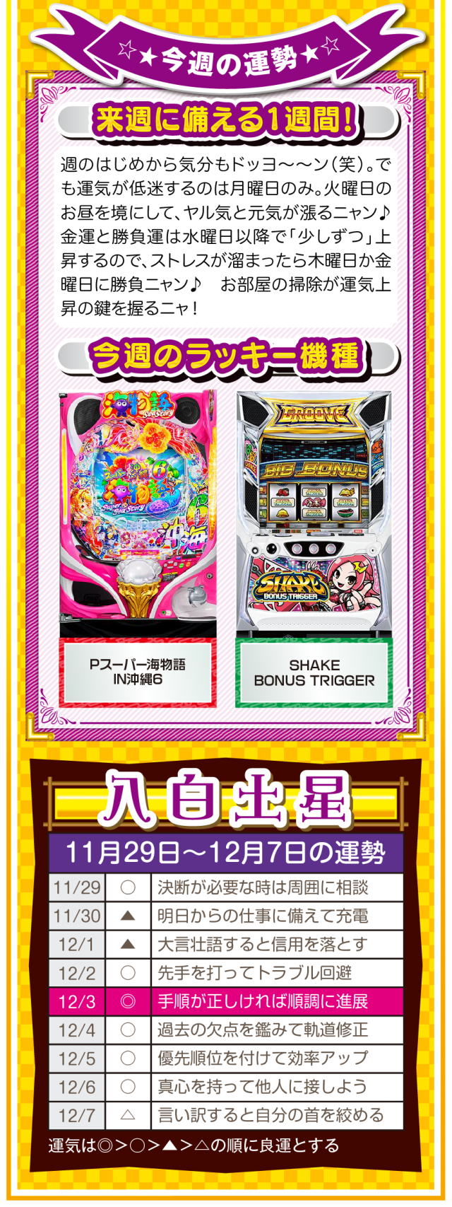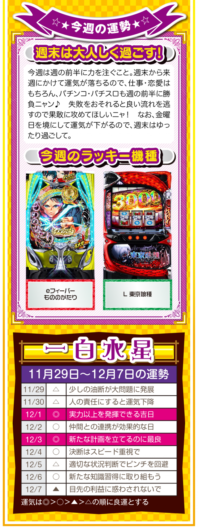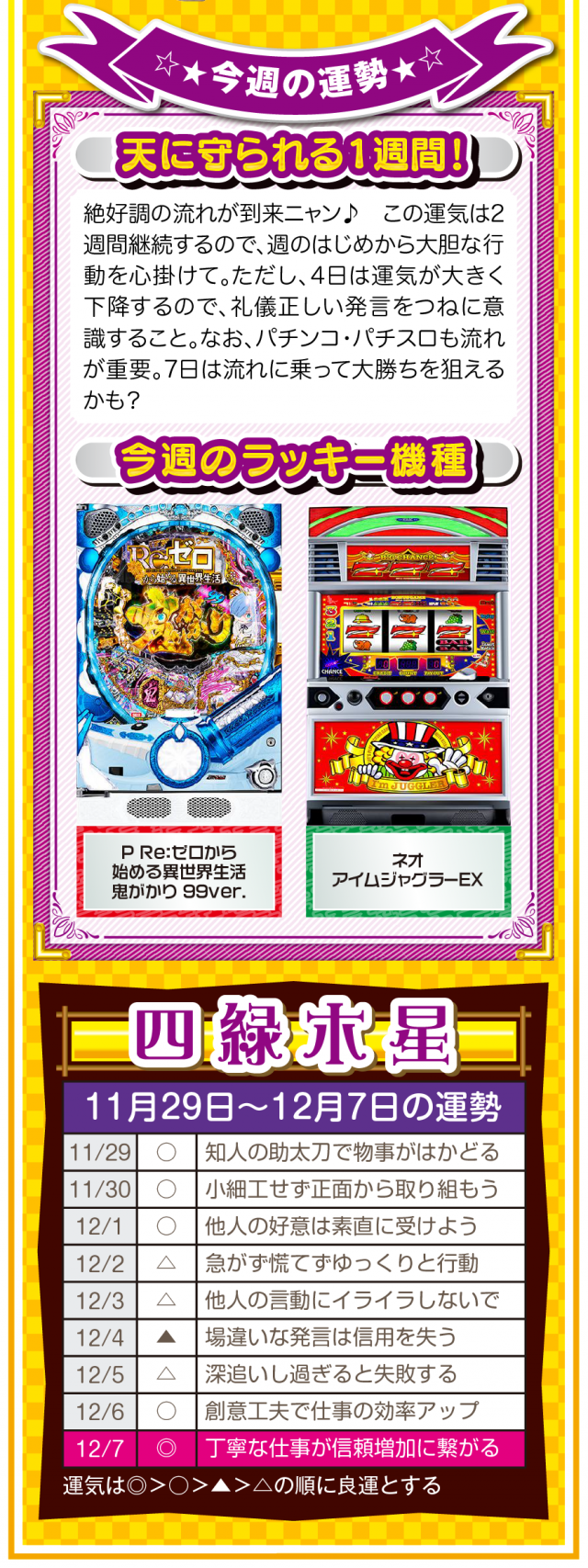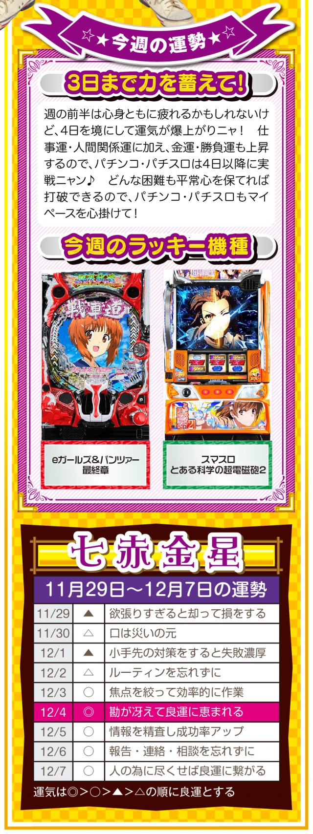 視点が変われば世界も変わるし、不満もチャンスに変化を遂げる。ちょっとした軌道修正が運気を大きく左右することを覚えておいてほしいニャン♪ というわけで早速、12月1日から7日の1週間を鑑定ニャ(常に自分が正義のフォー・チュンチュンが、オマケとして11月29日と30日の運勢も鑑定したニャン♡)!
