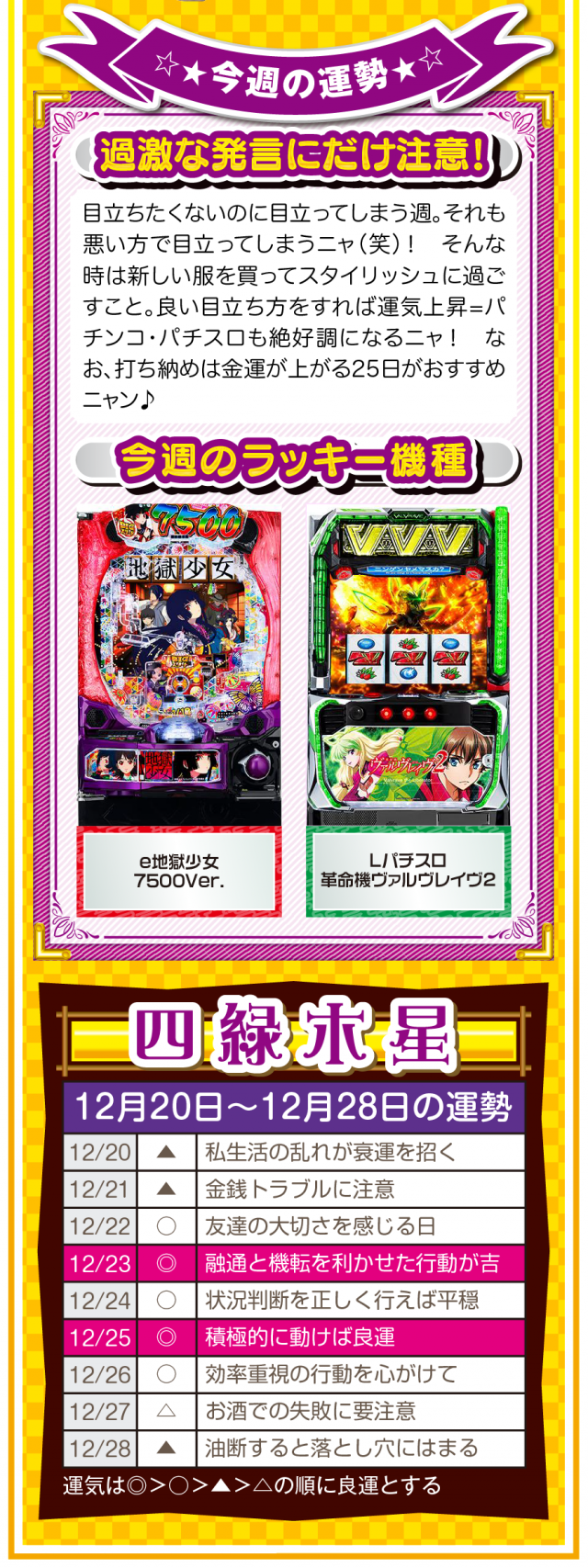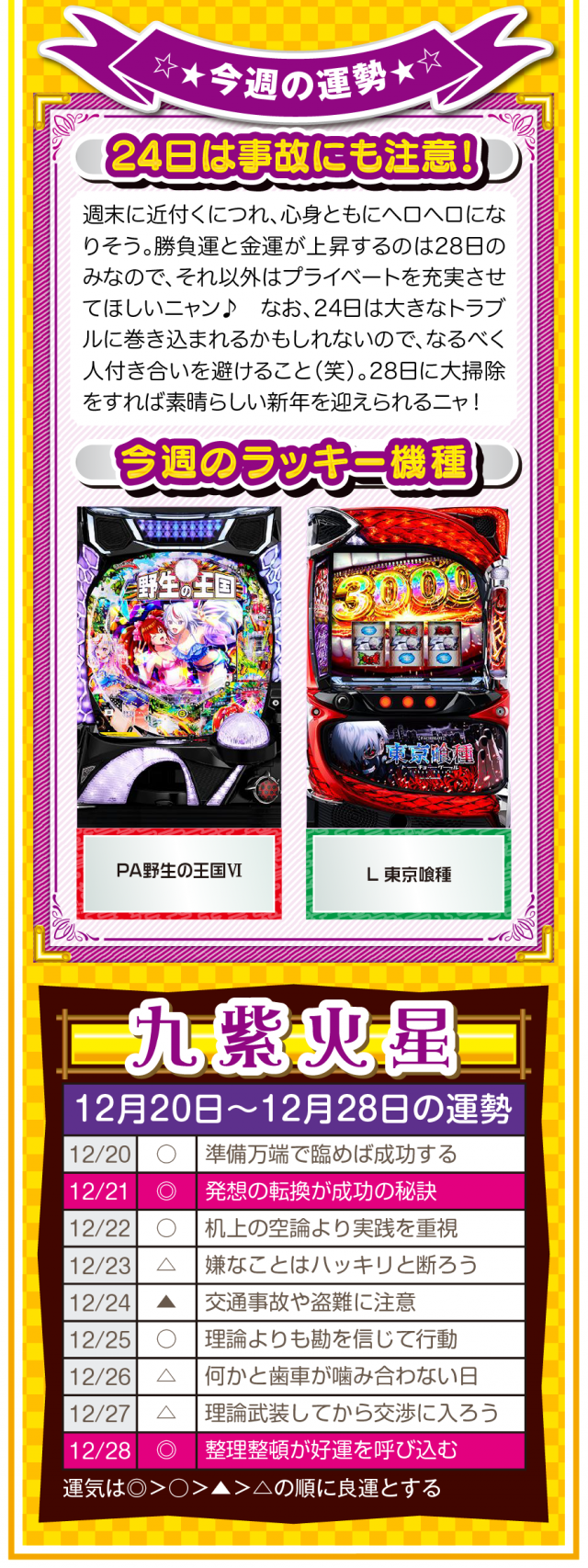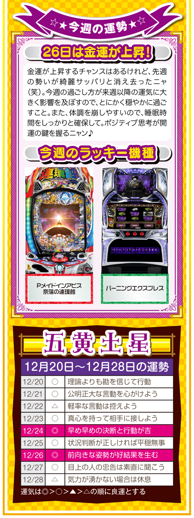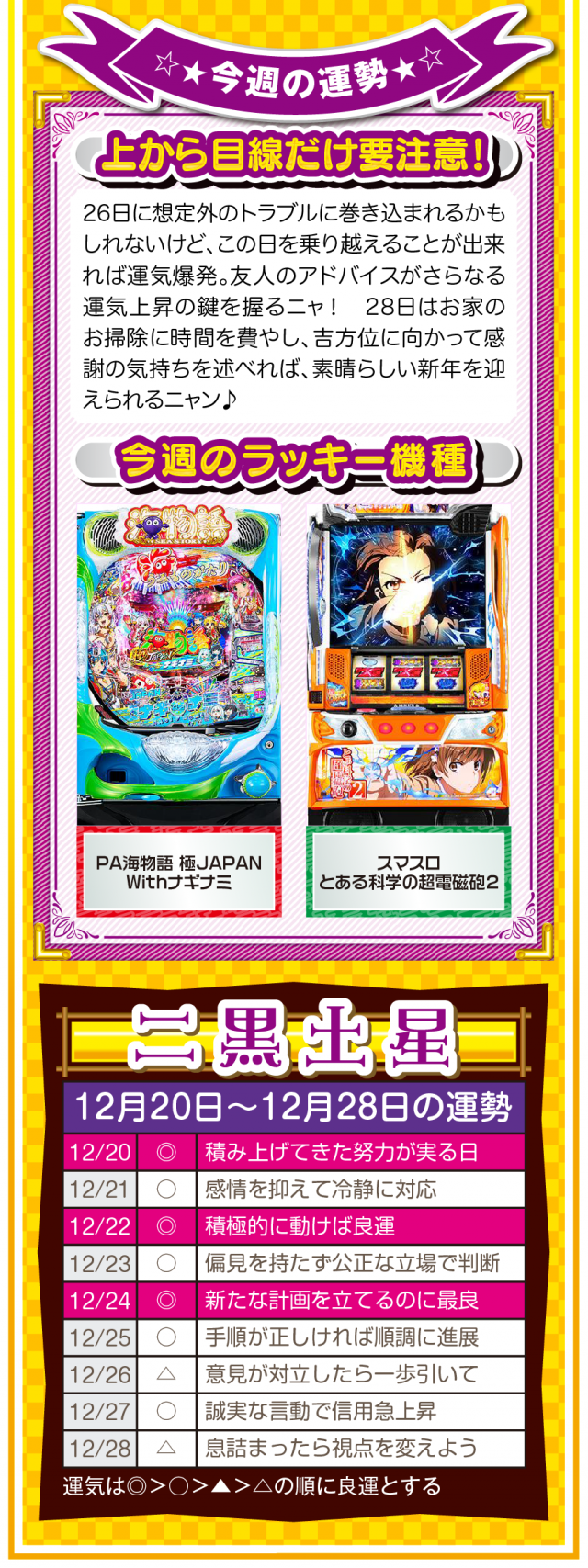 幸せを作るのは他人ではなく自分自身ニャ? 強く念じて前に進めば、2026年も日々楽しく過ごせることを覚えておいてほしいニャン♪ というわけで早速、12月22日から28日の1週間を鑑定ニャ(有馬記念を念で的中させる予定のフォー・チュンチュンが、オマケとして12月20日と21日の運勢も鑑定したニャン♡)!