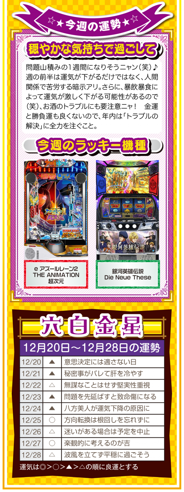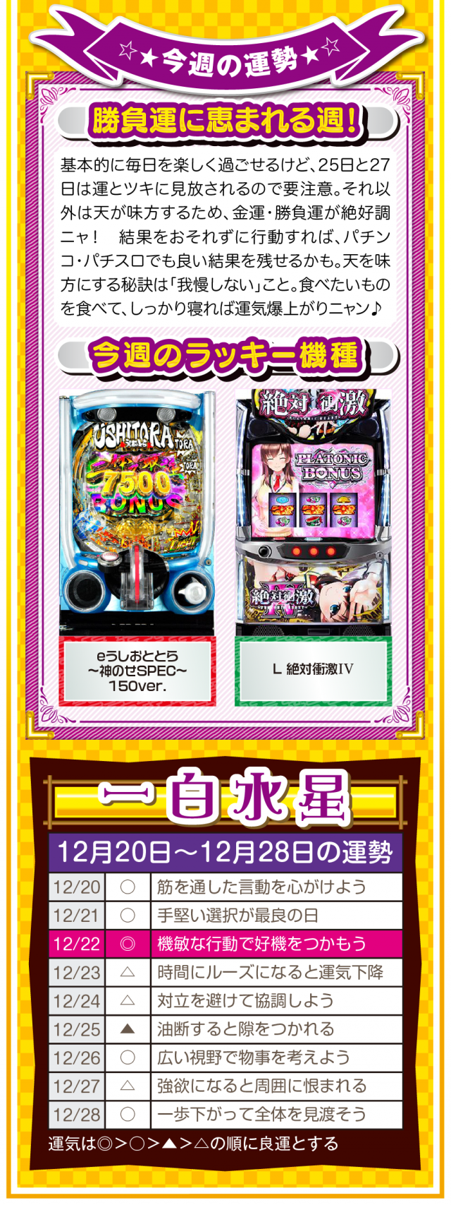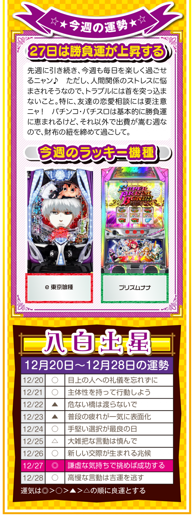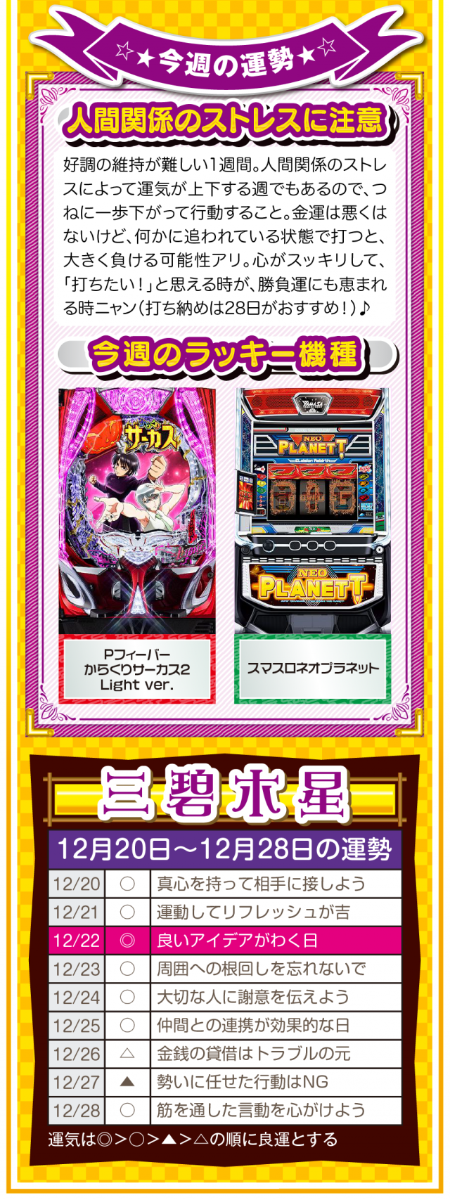 幸せを作るのは他人ではなく自分自身ニャ? 強く念じて前に進めば、2026年も日々楽しく過ごせることを覚えておいてほしいニャン♪ というわけで早速、12月22日から28日の1週間を鑑定ニャ(有馬記念を念で的中させる予定のフォー・チュンチュンが、オマケとして12月20日と21日の運勢も鑑定したニャン♡)!