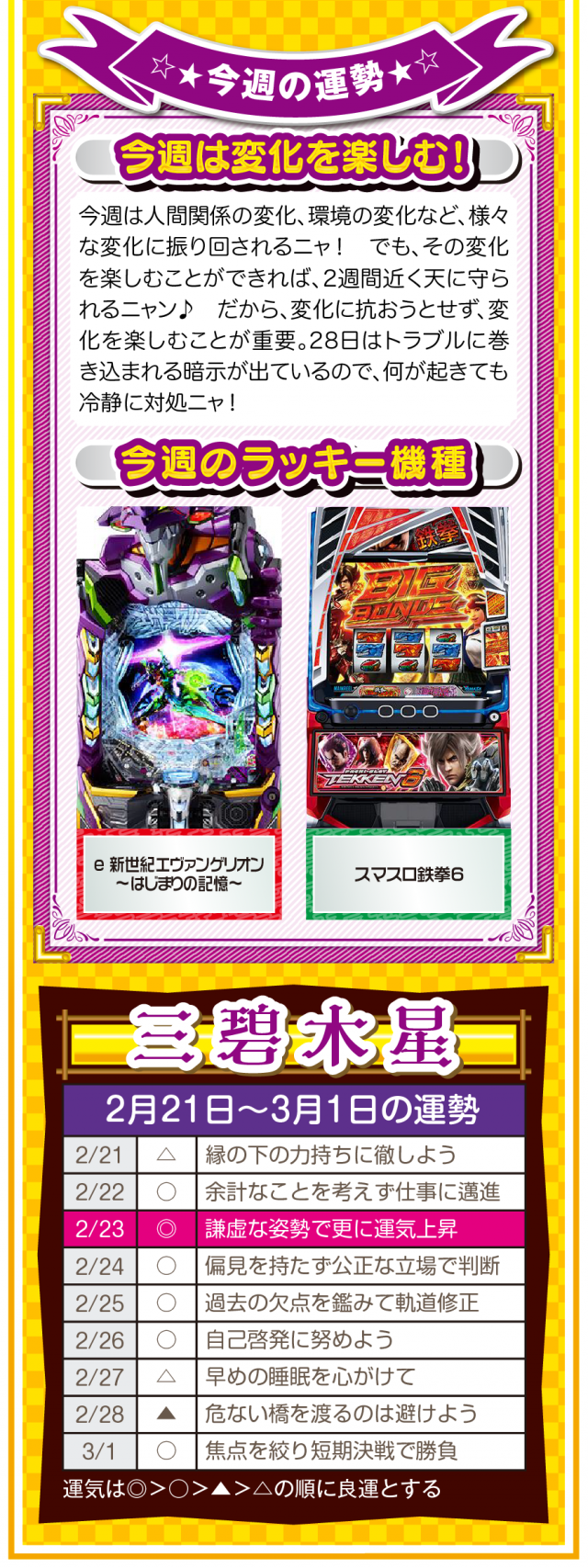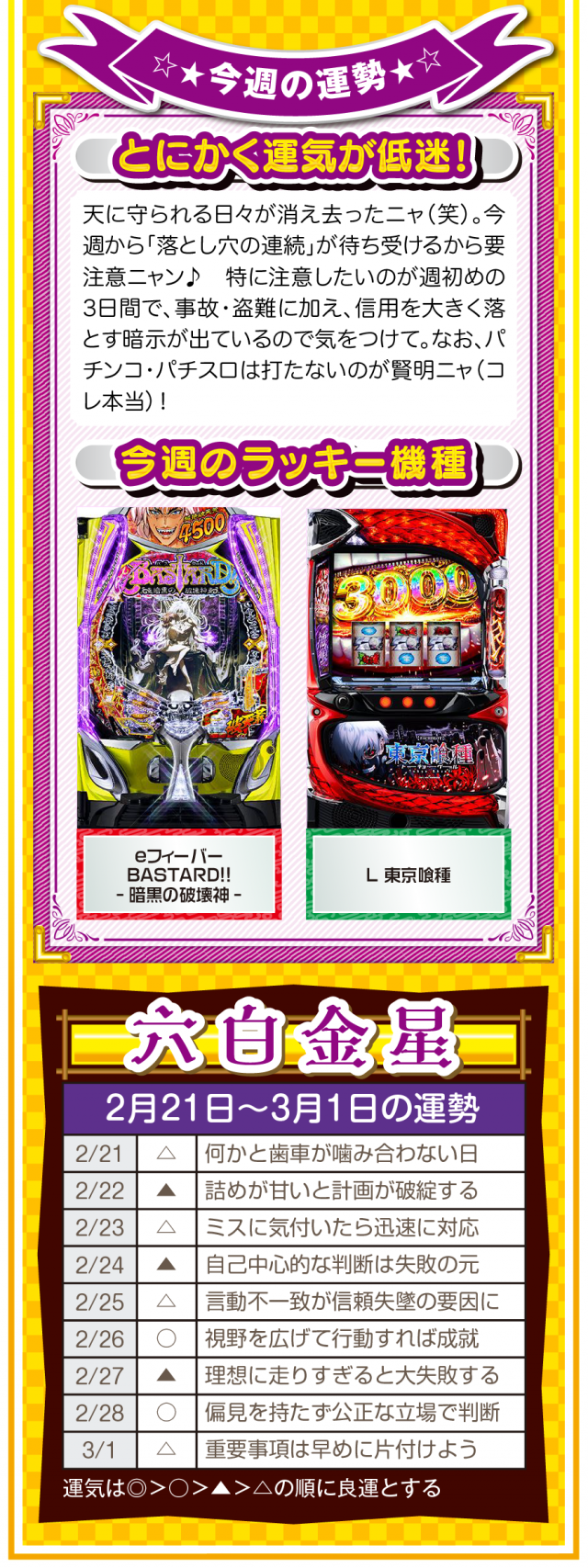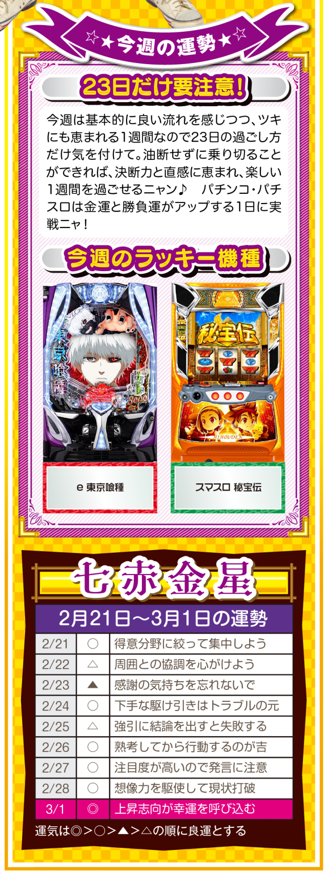 何事も腹八分目を意識すれば、運とかツキの流れを察知する「余裕」も生まれることを覚えておいてほしいニャン♪ というわけで早速、2月23日から3月1日の1週間を鑑定ニャ(ほどほどの距離感で恋愛が出来ないフォー・チュンチュンが、オマケとして2月21日と22日の運勢も鑑定したニャ♡)!